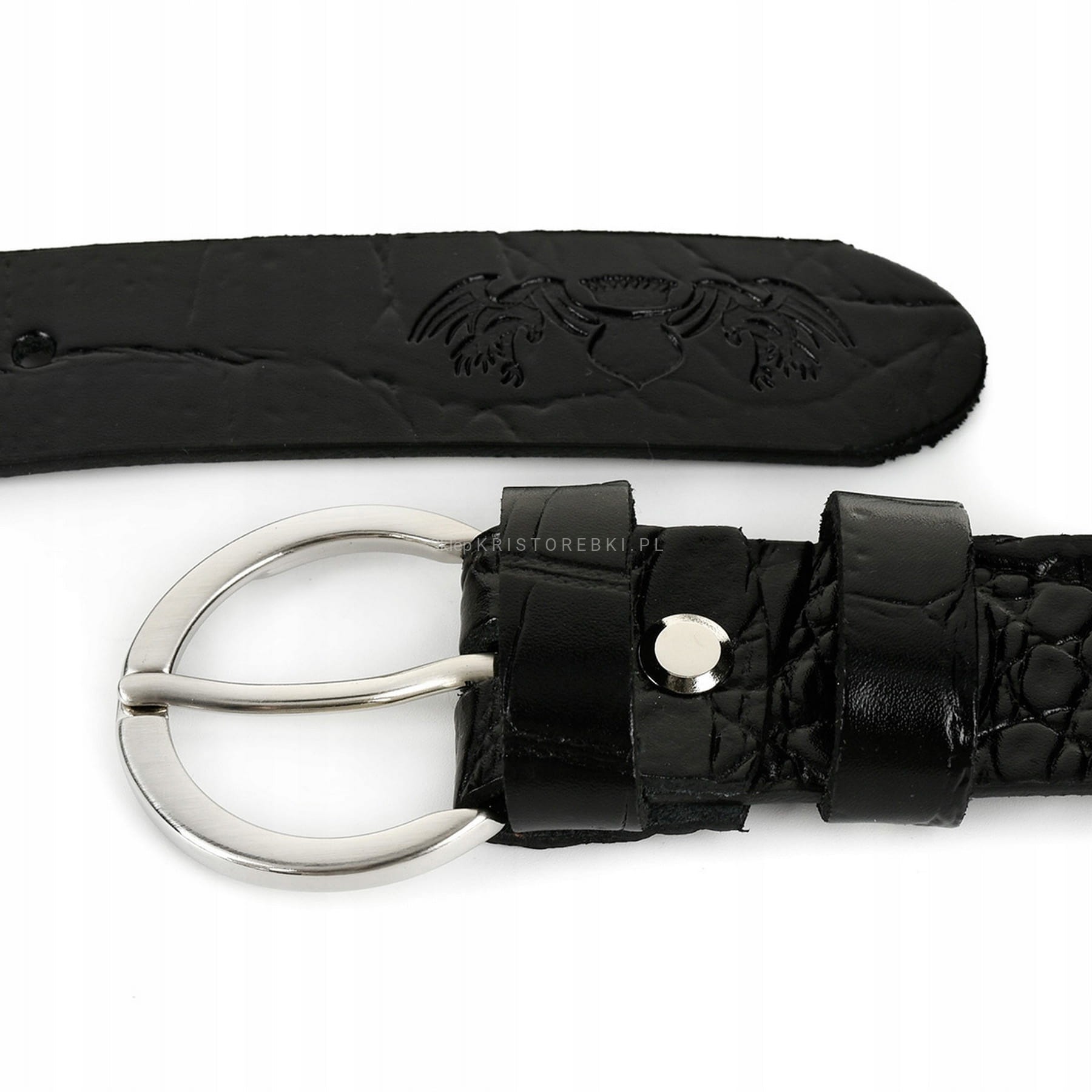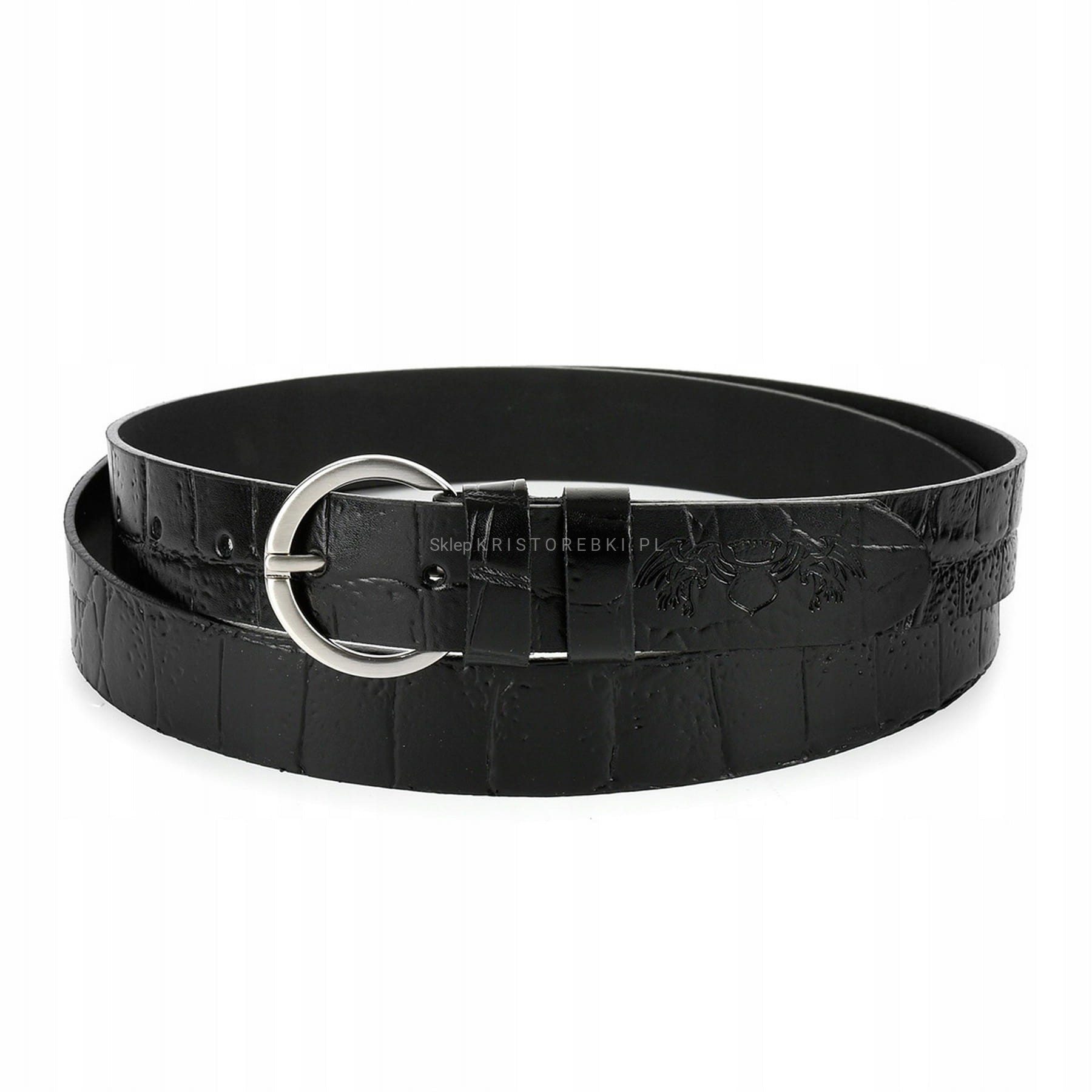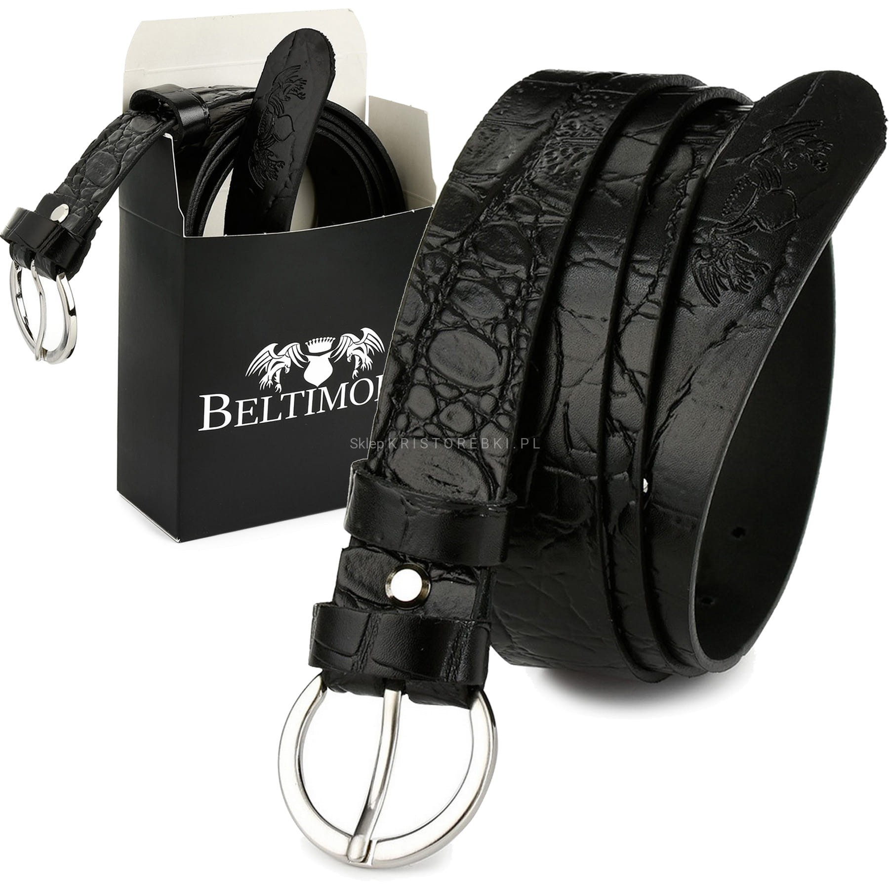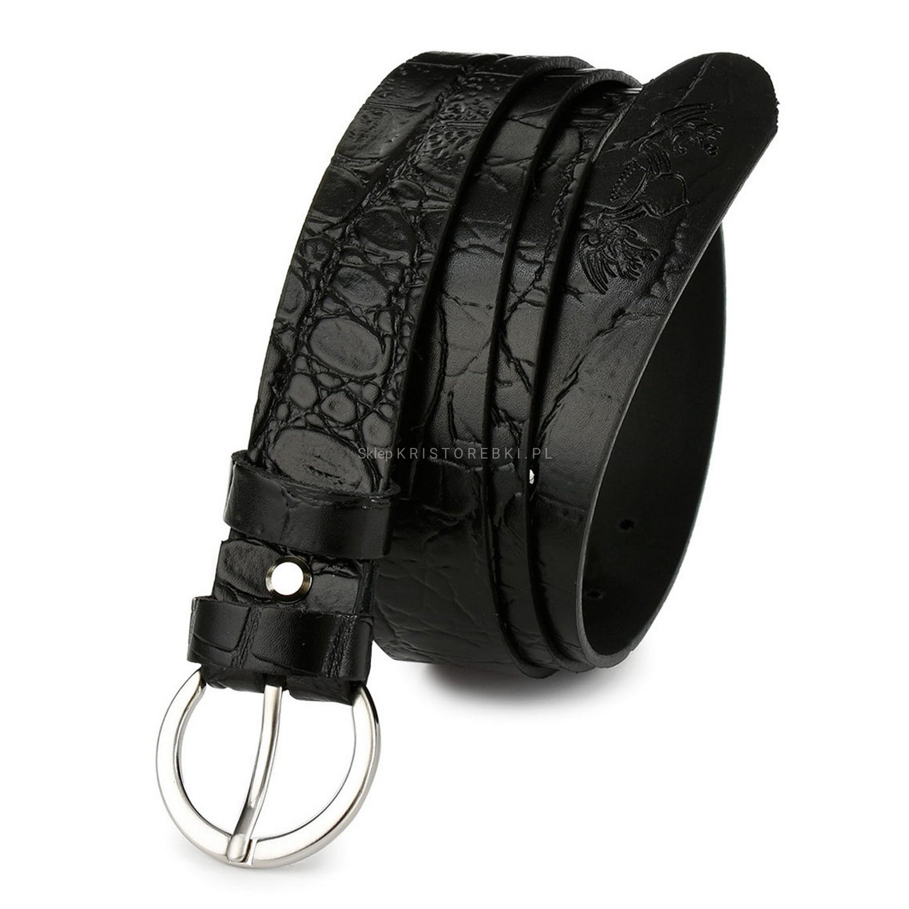 Piękny, skórzany pasek damski do spodni marki BELTIMORE o szerokości 2,8 cm. Pasek w kolorze CZARNYM ze wzorem SKÓRY KROKODYLA będzie pasował do wielu stylizacji, ze względu na klasyczny wygląd i solidną klamrę w kolorze SREBRNYM.