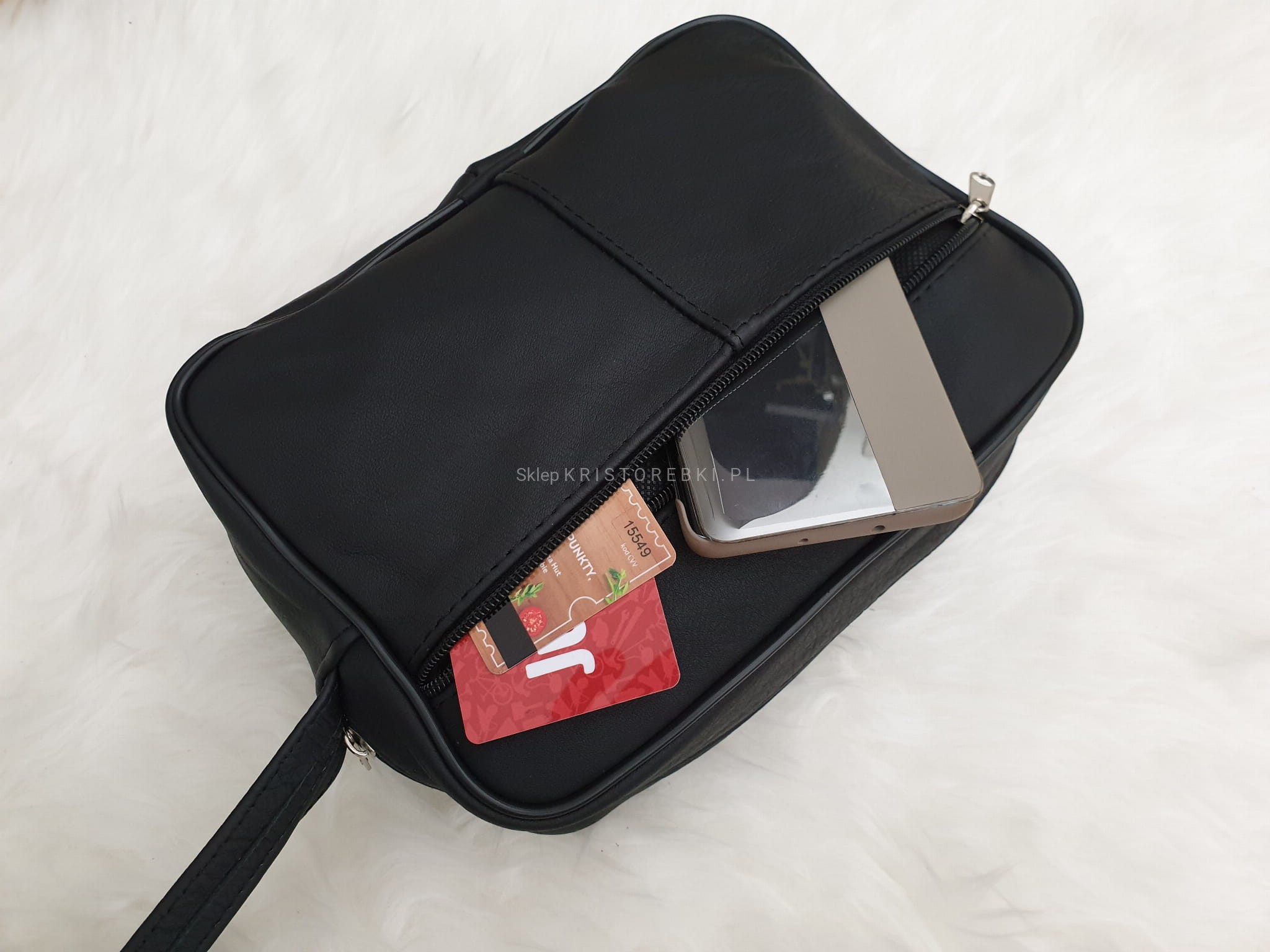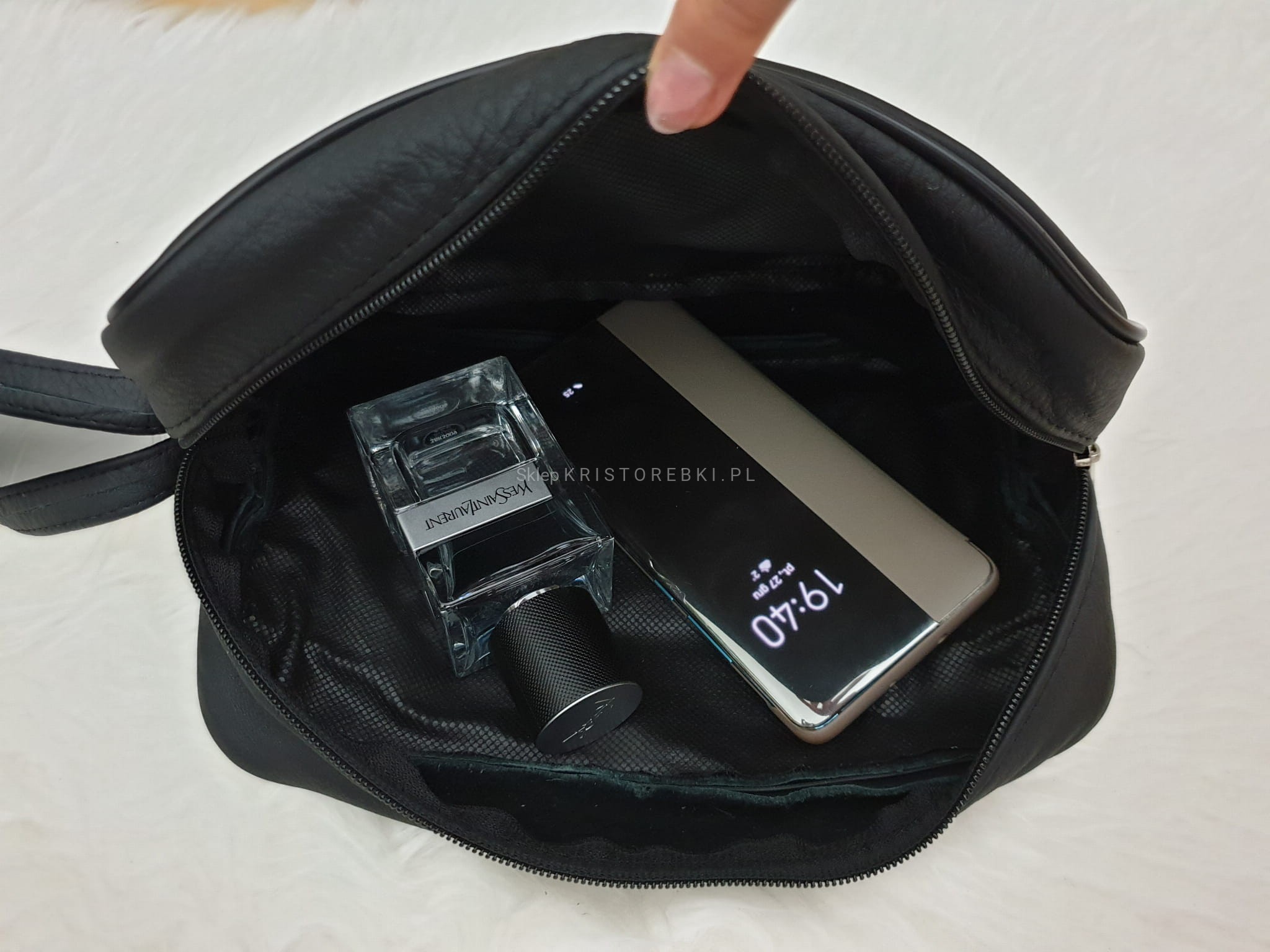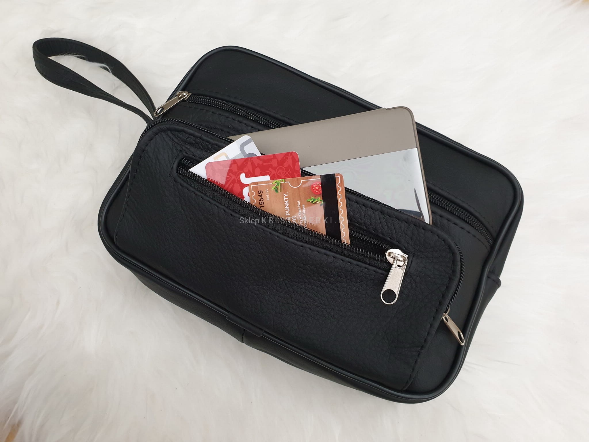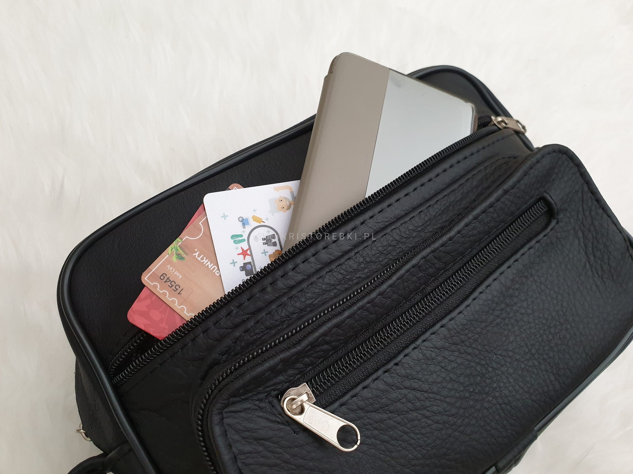 - Saszetka posiada jedną dużą komorę zasuwaną na suwak