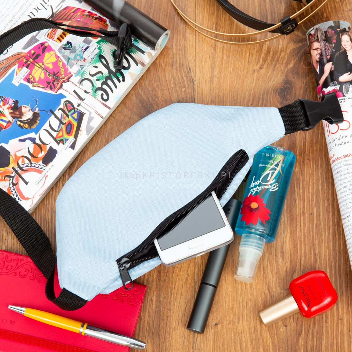 Wytrzymała i solidna nerka POLSKIEJ PRODUKCJI dostępna w matowym, jednolitym kolorze JASNONIEBIESKIM. Wykonana została bardzo starannie z dbałością o szczegóły. Posiada długi i regulowany (w zakresie 75 - 115 cm) czarny pasek, dzięki czemu idealnie dopasujesz ją do swojej talii. Saszetka posiada trzy oddzielne kieszenie i będzie pasowała do niemal każdej stylizacji. Jak na swój wymiar jest pojemna, dzięki czemu bez trudu zmieścisz telefon komórkowy, mały portfel, klucze i inne drobiazgi.