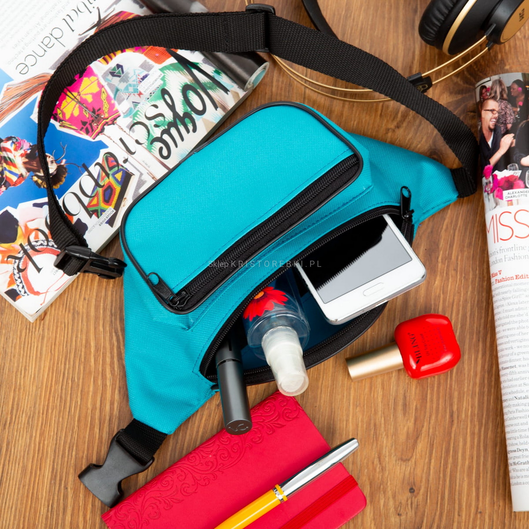 Wytrzymała i solidna nerka POLSKIEJ PRODUKCJI dostępna w matowym, jednolitym kolorze TURKUSOWYM. Wykonana została bardzo starannie z dbałością o szczegóły. Posiada długi i regulowany (w zakresie 75 - 115 cm) czarny pasek, dzięki czemu idealnie dopasujesz ją do swojej talii. Saszetka posiada trzy oddzielne kieszenie i będzie pasowała do niemal każdej stylizacji. Jak na swój wymiar jest pojemna, dzięki czemu bez trudu zmieścisz telefon komórkowy, mały portfel, klucze i inne drobiazgi.