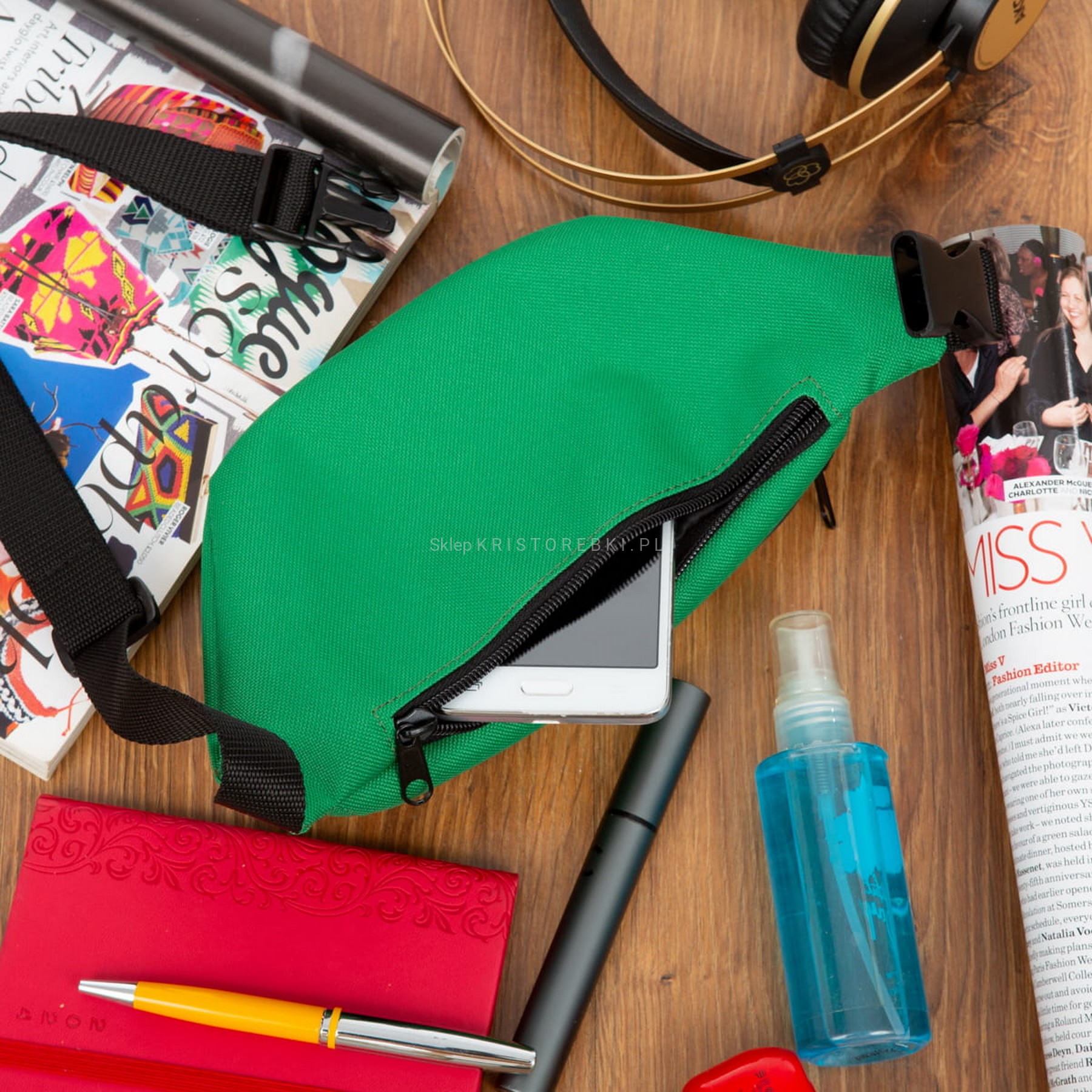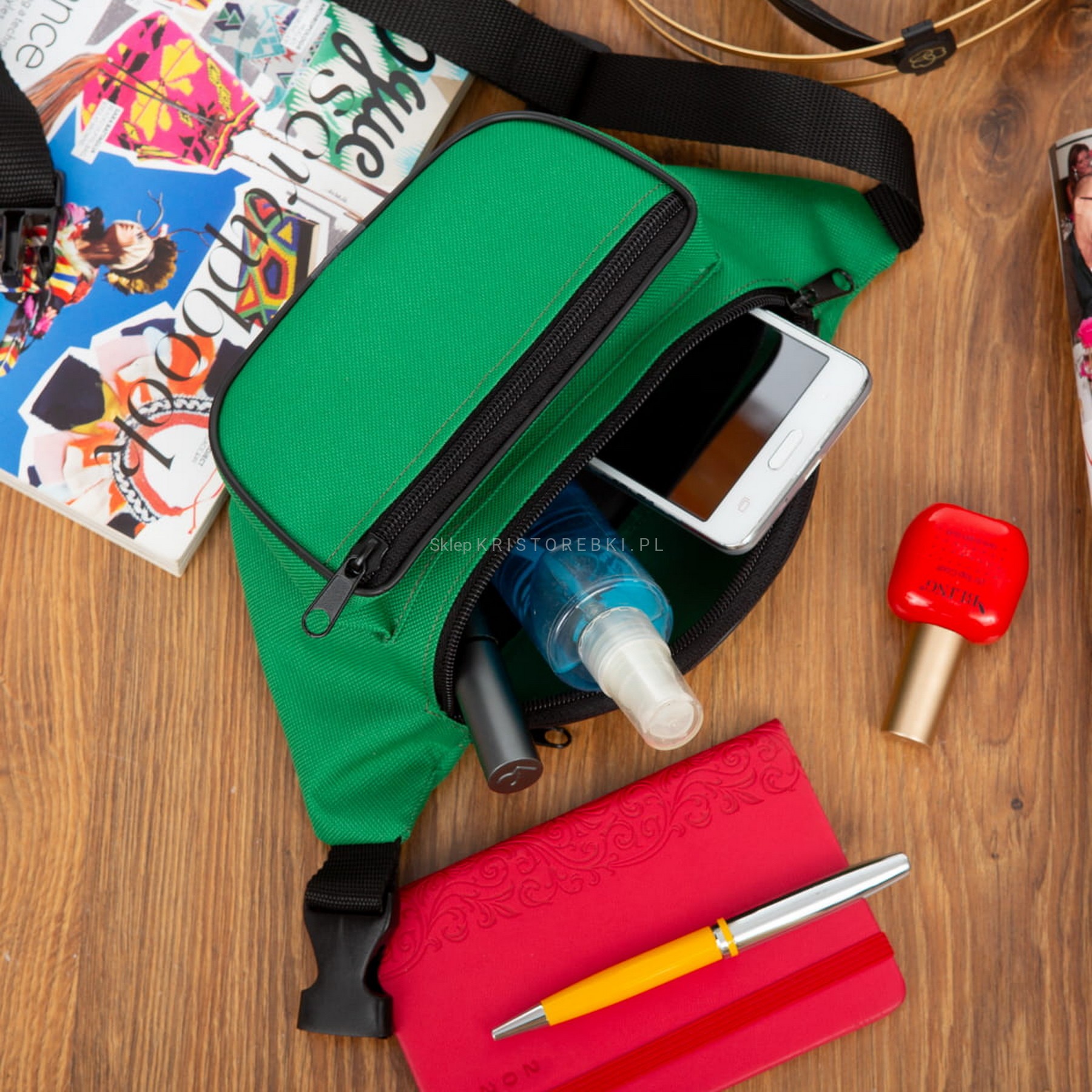 Wytrzymała i solidna nerka POLSKIEJ PRODUKCJI dostępna w matowym, jednolitym kolorze ZIELONYM. Wykonana została bardzo starannie z dbałością o szczegóły. Posiada długi i regulowany (w zakresie 75 - 115 cm) czarny pasek, dzięki czemu idealnie dopasujesz ją do swojej talii. Saszetka posiada trzy oddzielne kieszenie i będzie pasowała do niemal każdej stylizacji. Jak na swój wymiar jest pojemna, dzięki czemu bez trudu zmieścisz telefon komórkowy, mały portfel, klucze i inne drobiazgi.