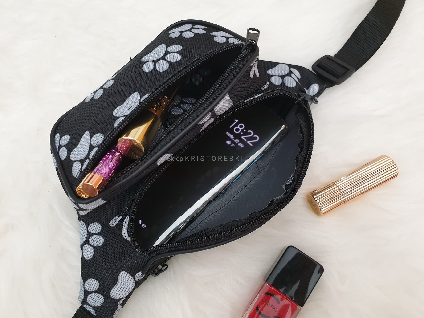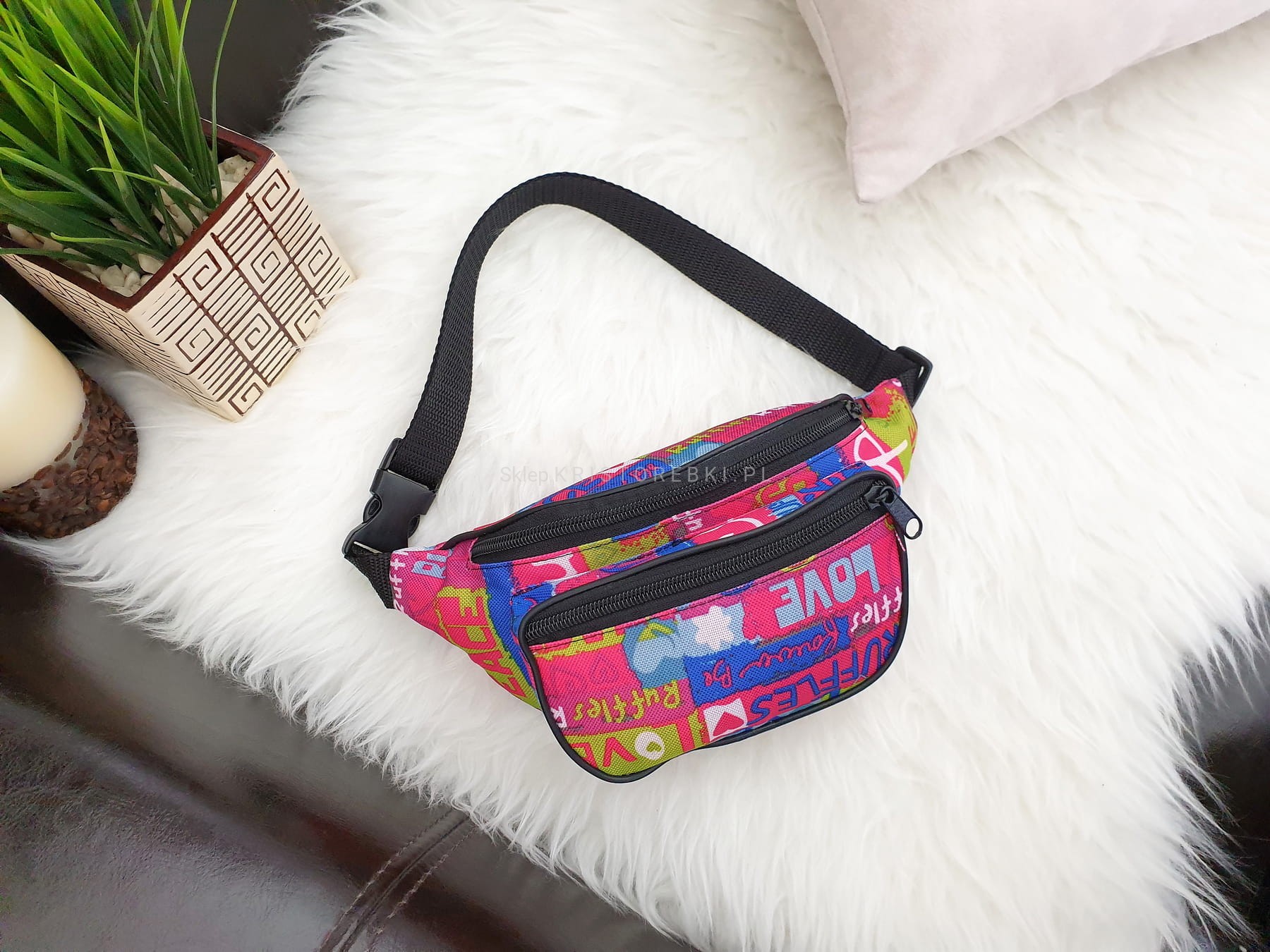 Wytrzymała i solidna nerka POLSKIEJ PRODUKCJI z motywem LOVE. Wykonana została bardzo starannie z dbałością o najmniejsze szczegóły. Szwy są proste i staranne. Posiada długi i regulowany (w zakresie 74 - 116 cm) czarny pasek, dzięki czemu idealnie dopasujesz ją do swojej talii. Będzie pasowała do niemal każdej stylizacji. Jak na swój wymiar jest pojemna, dzięki czemu bez trudu zmieścisz telefon komórkowy, mały portfel, klucze i inne drobiazgi. W środku jest wykończona podszewką i posiada trzy oddzielne kieszenie - pozwali Ci to oddzielić np. telefon od kluczy.