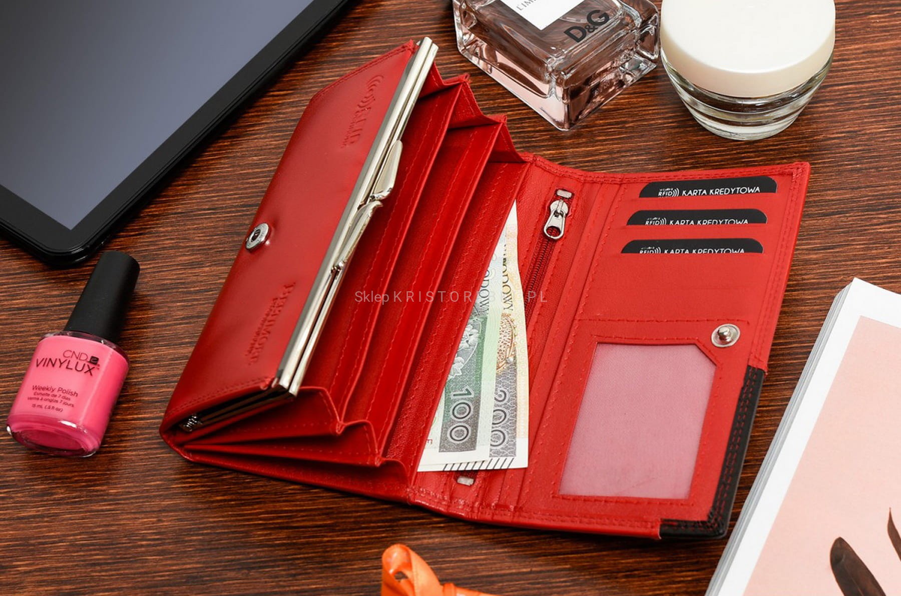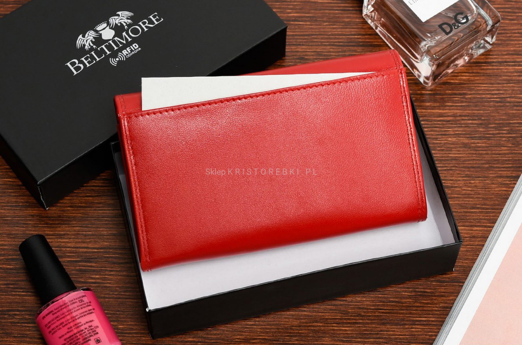 Piękny i funkcjonalny portfel damski marki BELTIMORE w kolorze CZERWONYM. Wykonany został z najwyższej jakości skóry naturalnej. Portfel zapinany jest na zatrzask a z przodu znajduje się eleganckie logo marki. Środek portfela został zaprojektowany tak, abyś mogła zmieścić wszystko, czego na co dzień potrzebujesz. Wewnątrz znajdziesz m.in. zakładki na karty płatnicze oraz kieszeń na zdjęcie. Dodatkowo w portfelu znajdują się tradycyjne sekcje na banknoty i monety. Wnętrze obszyto podszewką, która chronić będzie skórę przed uszkodzeniami. Portfel wyposażony w specjalną podszewkę z RFID, która zabezpiecza karty zbliżeniowe, dokumenty biometryczne, legitymacje i karty komunikacji miejskiej przed nieautoryzowanym odczytem danych. Technologia ta uniemożliwia odczyt danych za pomocą specjalnych czytników wykorzystywanych do kradzieży danych. Portfel zapakowany jest w eleganckie pudełko, dzięki czemu idealnie nada się również jako prezent na szczególną okazję dla najbliższej Ci osoby.