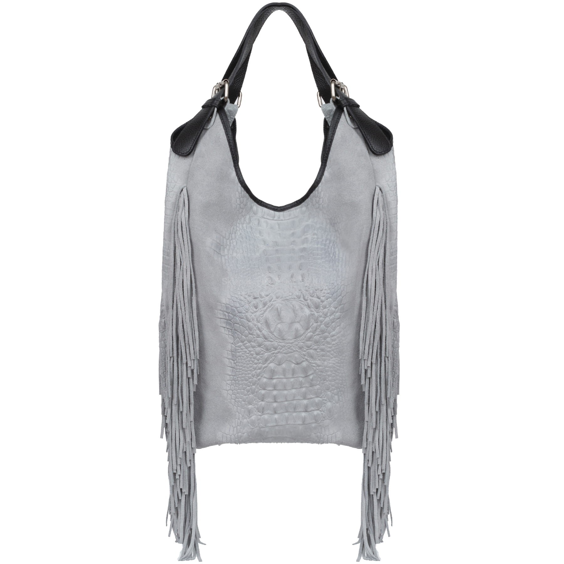 VERA PELLE torebka damska zamszowa worek shopper z frędzlami kroko V489 jasna szara