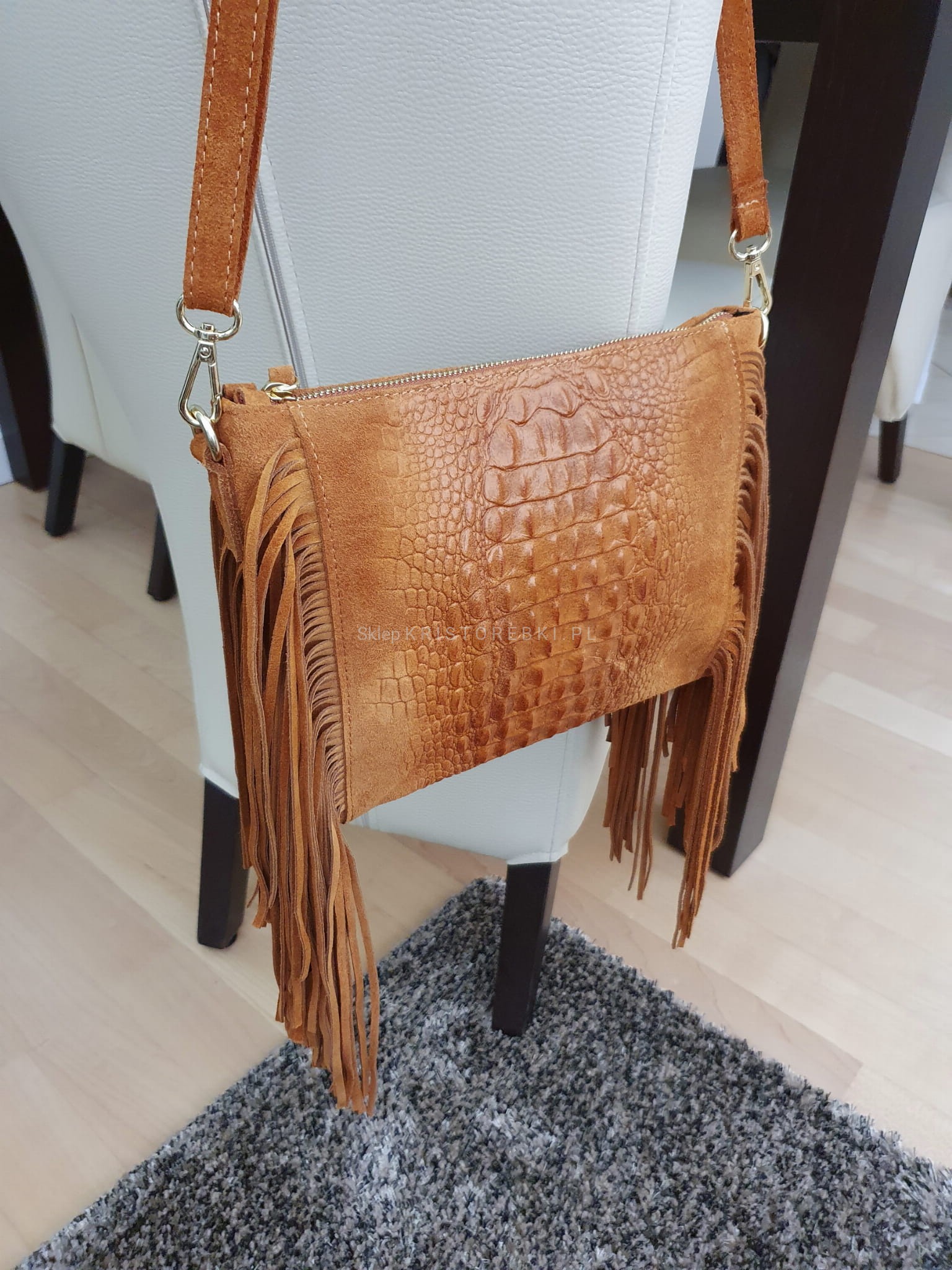 Skórzana, mała i zgrabna torebka listonoszka marki VERA PELLE ITALY w kolorze CAMEL. Wyprodukowana została we Włoszech z najwyższej jakości, pięknie pachnącej i miłej w dotyku skóry naturalnej zamszowej z tłoczeniami imitującymi skórę krokodyla. Torebka posiada złote okucia a po bokach znajdują się długie i ozdobne frędzle. Główna komora zamykana jest na suwak a środek wykończony jest wysokiej jakości podszewką. W środku znajduje się również duża kieszeń zamykana na suwak oraz dodatkowa nieduża kieszonka na telefon lub dokumenty. Mimo swoich rozmiarów torebka jest pojemna i pomieści najpotrzebniejsze rzeczy codziennego użytku. Dzięki oryginalnemu wyglądowi będzie pasowała do większości stylizacji - również tych wizytowych.