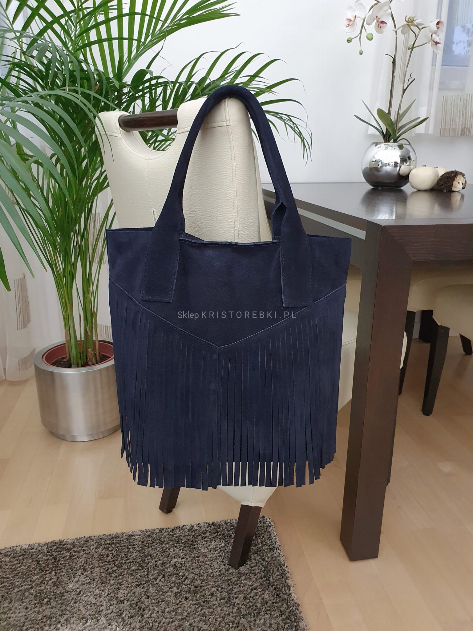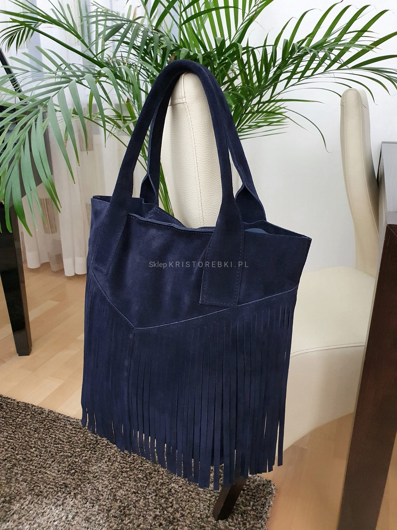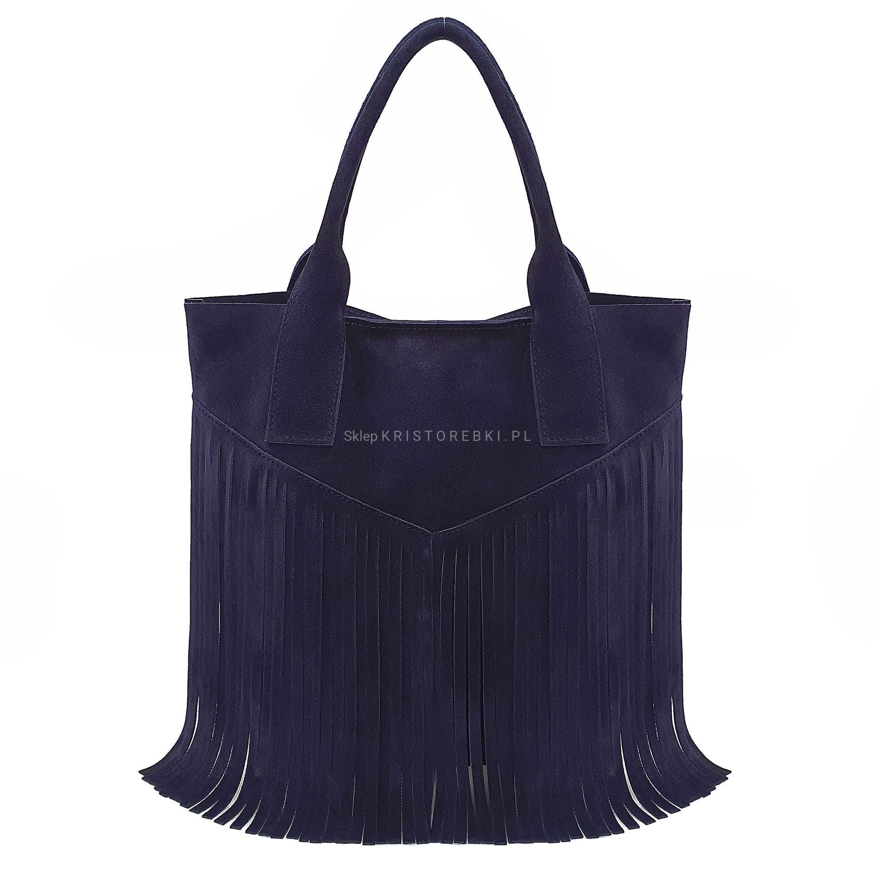 Skórzana torebka typu shopper marki VERA PELLE ITALY w kolorze GRANATOWYM. Wyprodukowana została we Włoszech z najwyższej jakości, pięknie pachnącej i miłej w dotyku skóry naturalnej zamszowej. Torebka zapinana jest na magnesik i posiada długie i solidne rączki, dzięki czemu bez trudu można ją nosić również na ramieniu. Torebka jest jednokomorowa a środek jest surowy. Przód torebki ozdabiają długie frędzle w stylu boho. Jest niezwykle stylowa i niepowtarzalna, co nada Twojej stylizacji niesamowitego charakteru.