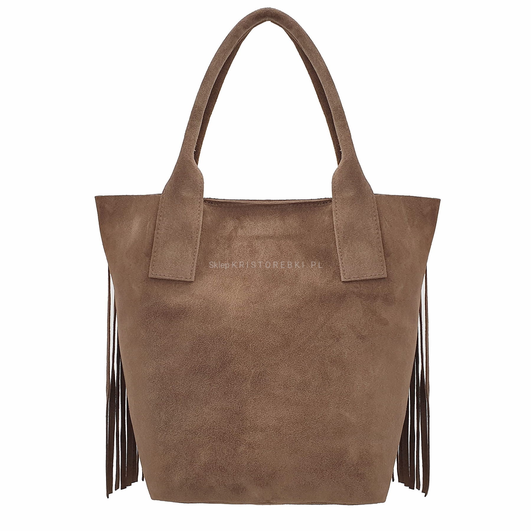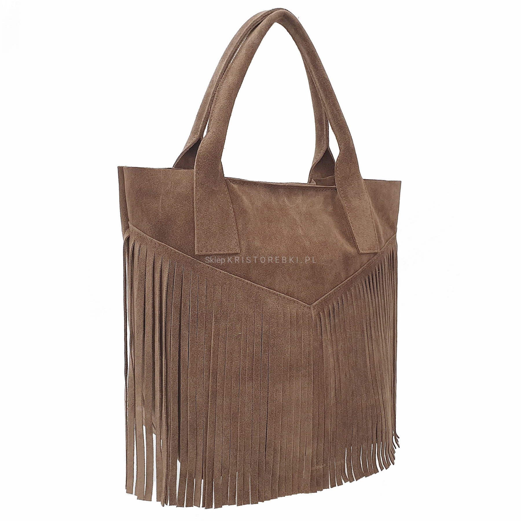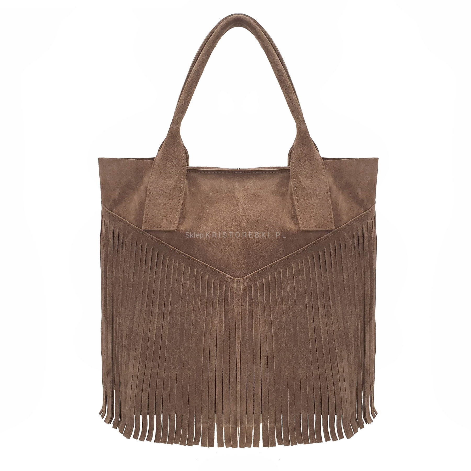 Skórzana torebka typu shopper marki VERA PELLE ITALY w kolorze GRANATOWYM. Wyprodukowana została we Włoszech z najwyższej jakości, pięknie pachnącej i miłej w dotyku skóry naturalnej zamszowej. Torebka zapinana jest na magnesik i posiada długie i solidne rączki, dzięki czemu bez trudu można ją nosić również na ramieniu. Torebka jest jednokomorowa a środek jest surowy. Przód torebki ozdabiają długie frędzle w stylu boho. Jest niezwykle stylowa i niepowtarzalna, co nada Twojej stylizacji niesamowitego charakteru.