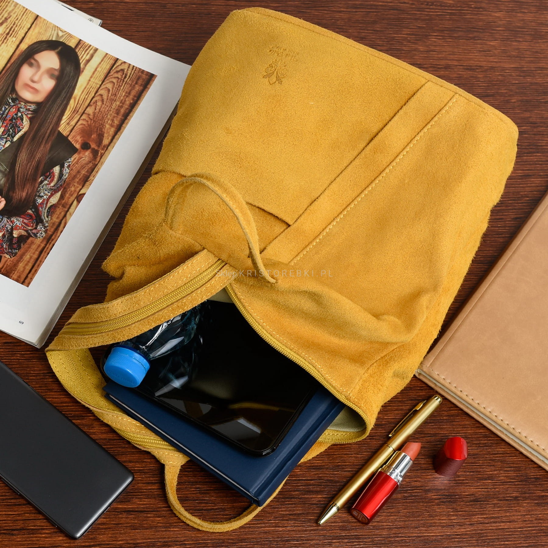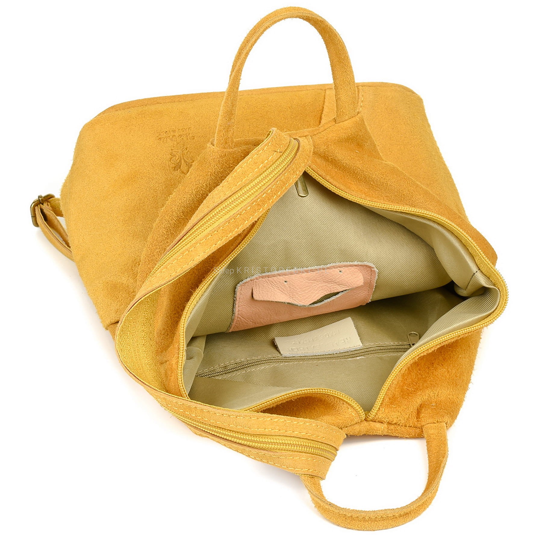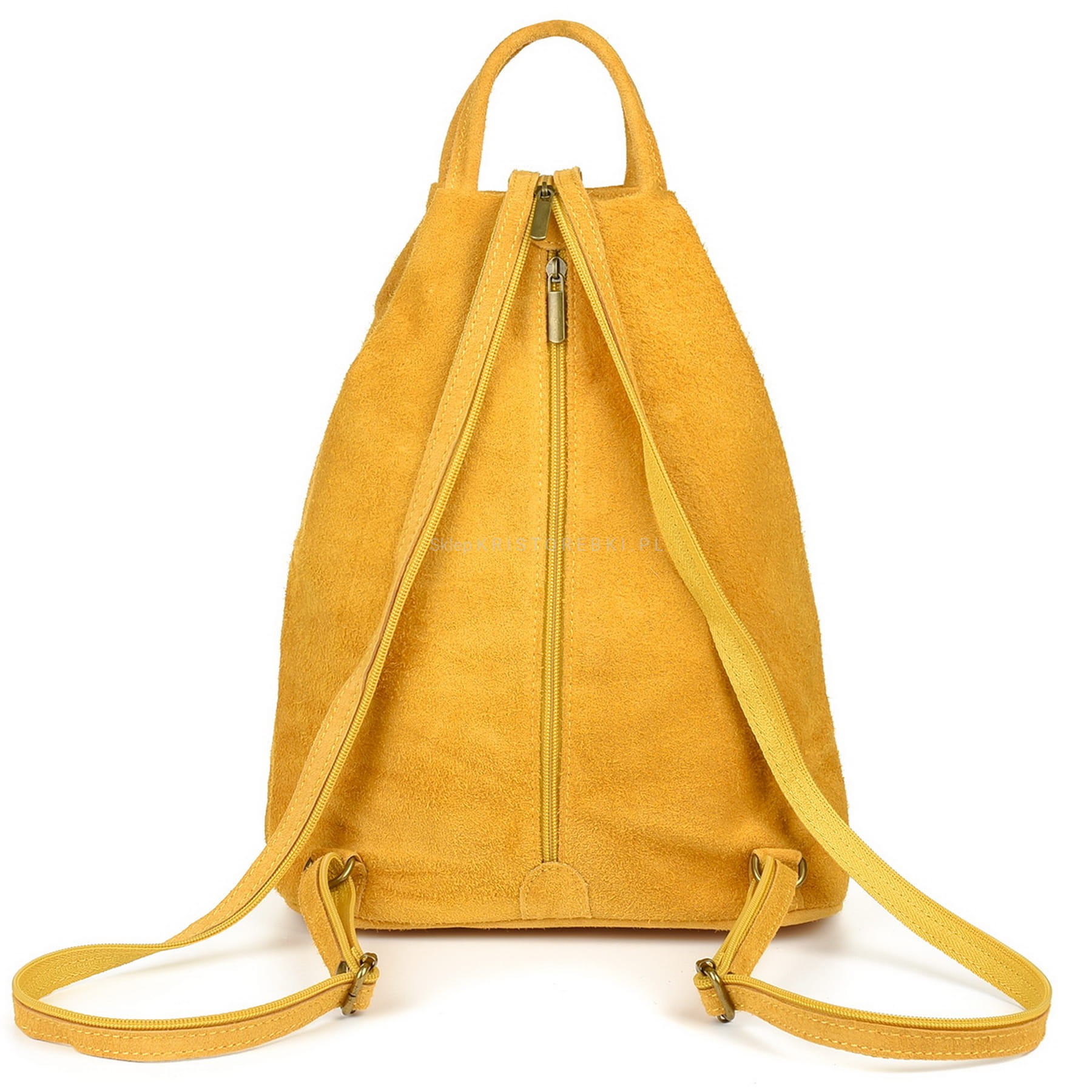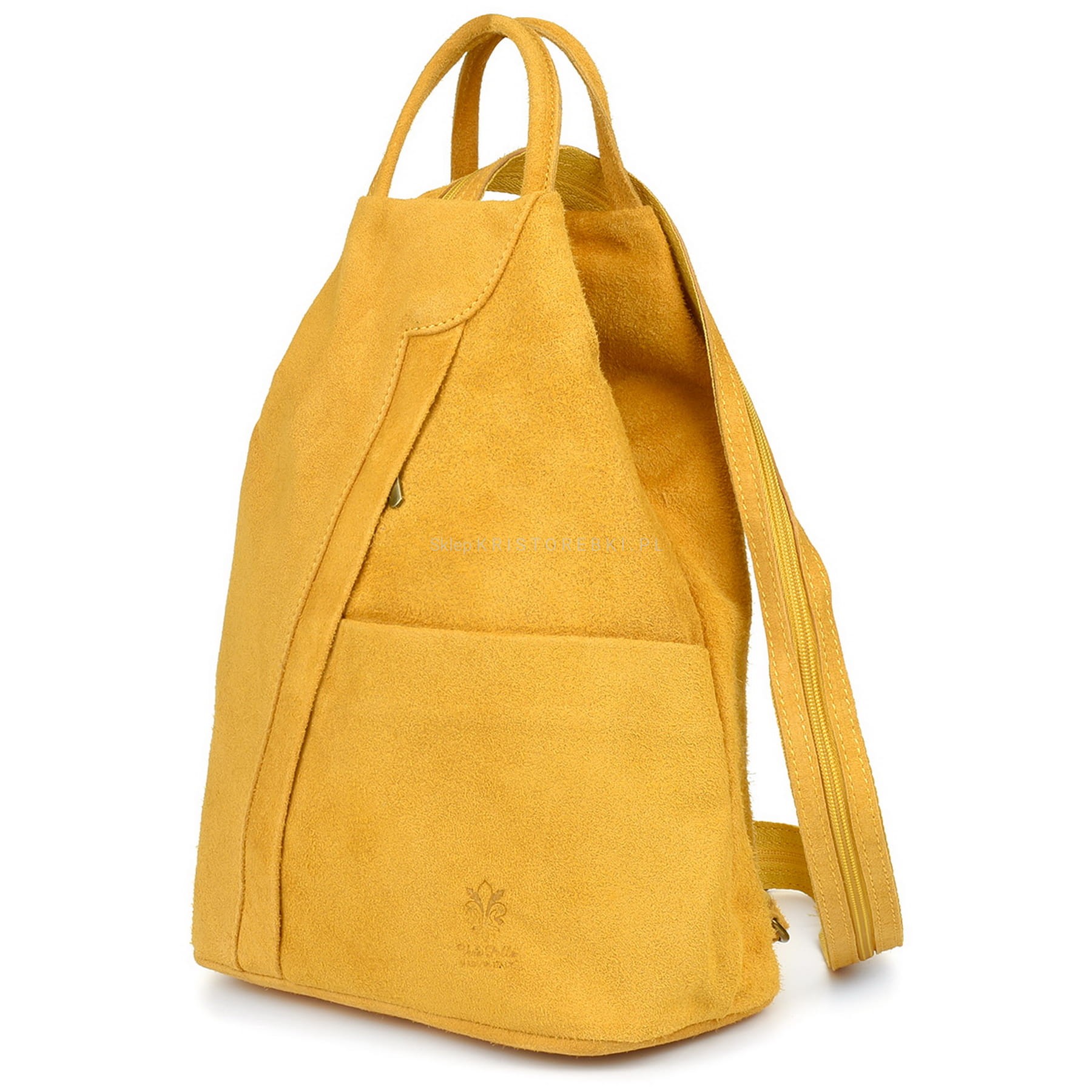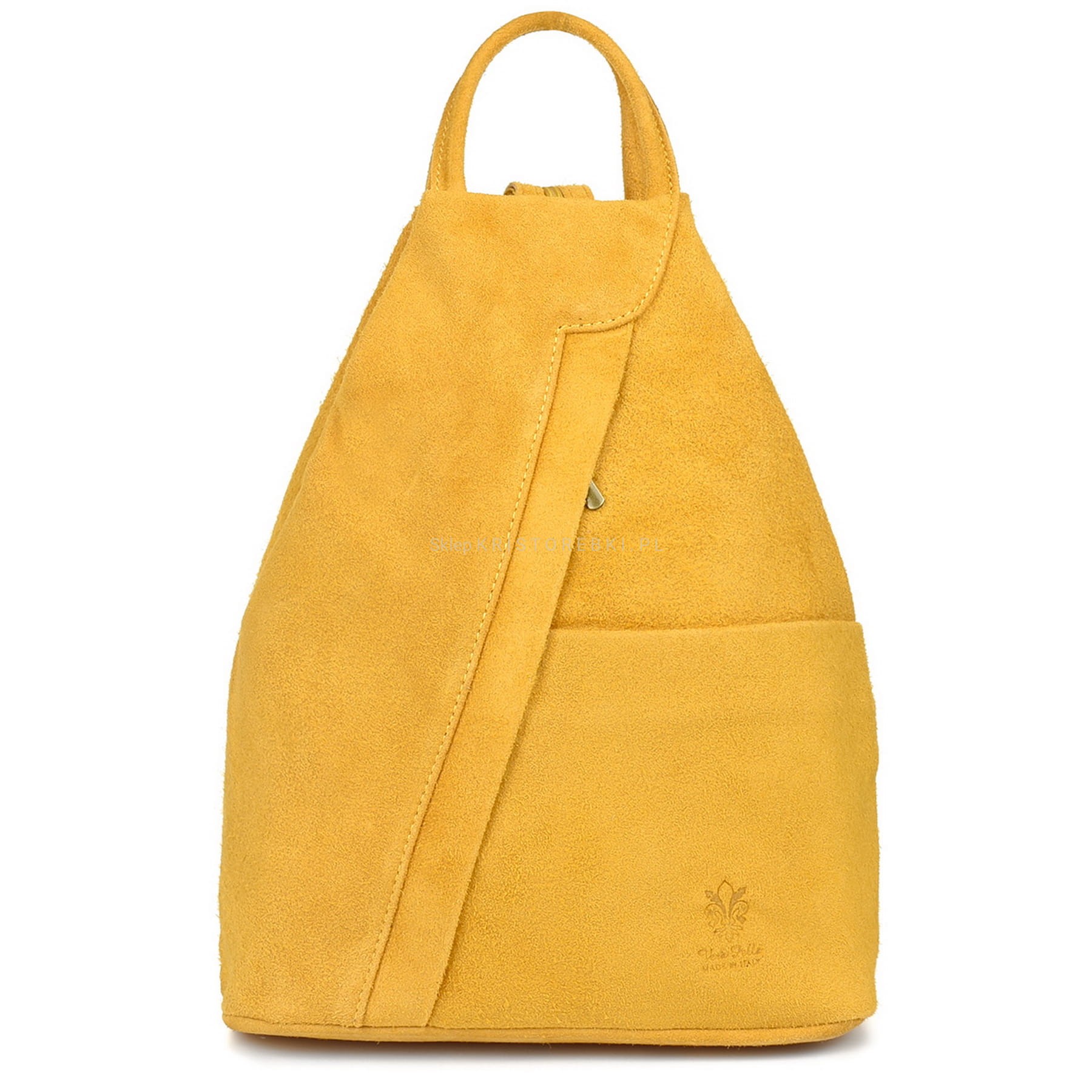 VERA PELLE plecak damski zamszowy elegancki trójkątny z suwakiem V010 musztardowy