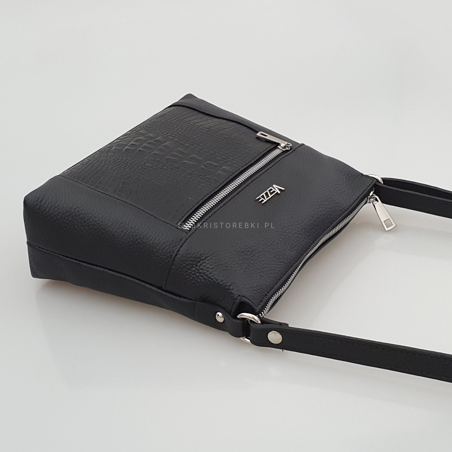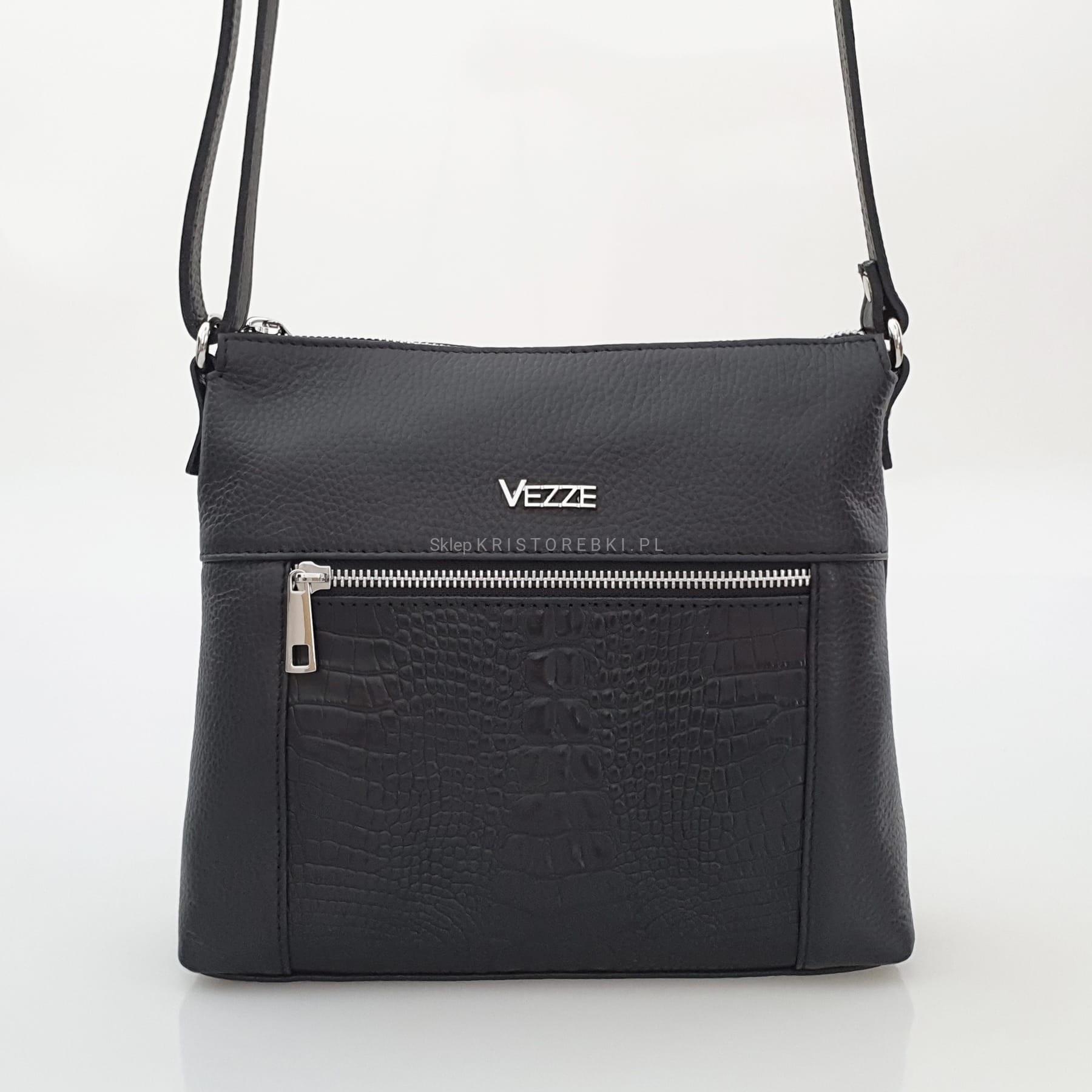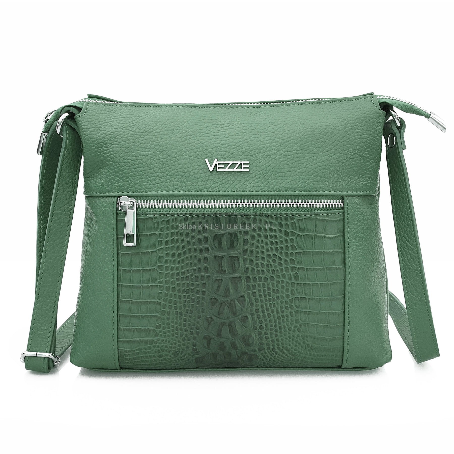 Skórzana torebka damska, listonoszka znanej i cenionej marki VEZZE w kolorze ZIELONYM. Wyprodukowana została we Włoszech z najwyższej jakości, pięknie pachnącej i miłej w dotyku skóry naturalnej. Torebka posiada srebrne okucia oraz solidny, długi i regulowany pasek, dzięki czemu idealnie dopasujesz ją do swojego wzrostu i preferencji. Główna komora torebki zapinana jest na solidny suwak. Środek wykończony jest wysokiej jakości podszewką oraz przedzielona jest w pół kieszenią zamykaną na suwak, dzięki czemu mamy do dyspozycji w środku 2 oddzielne i pojemne komory. Poprawia to w utrzymaniu w torebce porządku. Dodatkowo w środku znajduje się praktyczna kieszonka zamykana na suwak oraz nieduża kieszonka bez zapięcia na telefon lub dokumenty. Z przodu posiada wykończenie na modny wzór kroko, co dodaje jej uroku i atrakcyjności oraz posiada pojemną i praktyczną kieszeń zamykaną na suwak. Z tyłu również znajdziemy kieszonkę na suwak. Jest niezwykle stylowa i niepowtarzalna, co nada Twojej stylizacji niesamowitego charakteru. Dzięki wysokiej jakości wykonania będzie gwarancją świetnego i oryginalnego wyglądu oraz pozwoli na długotrwałe jej użytkowanie.
