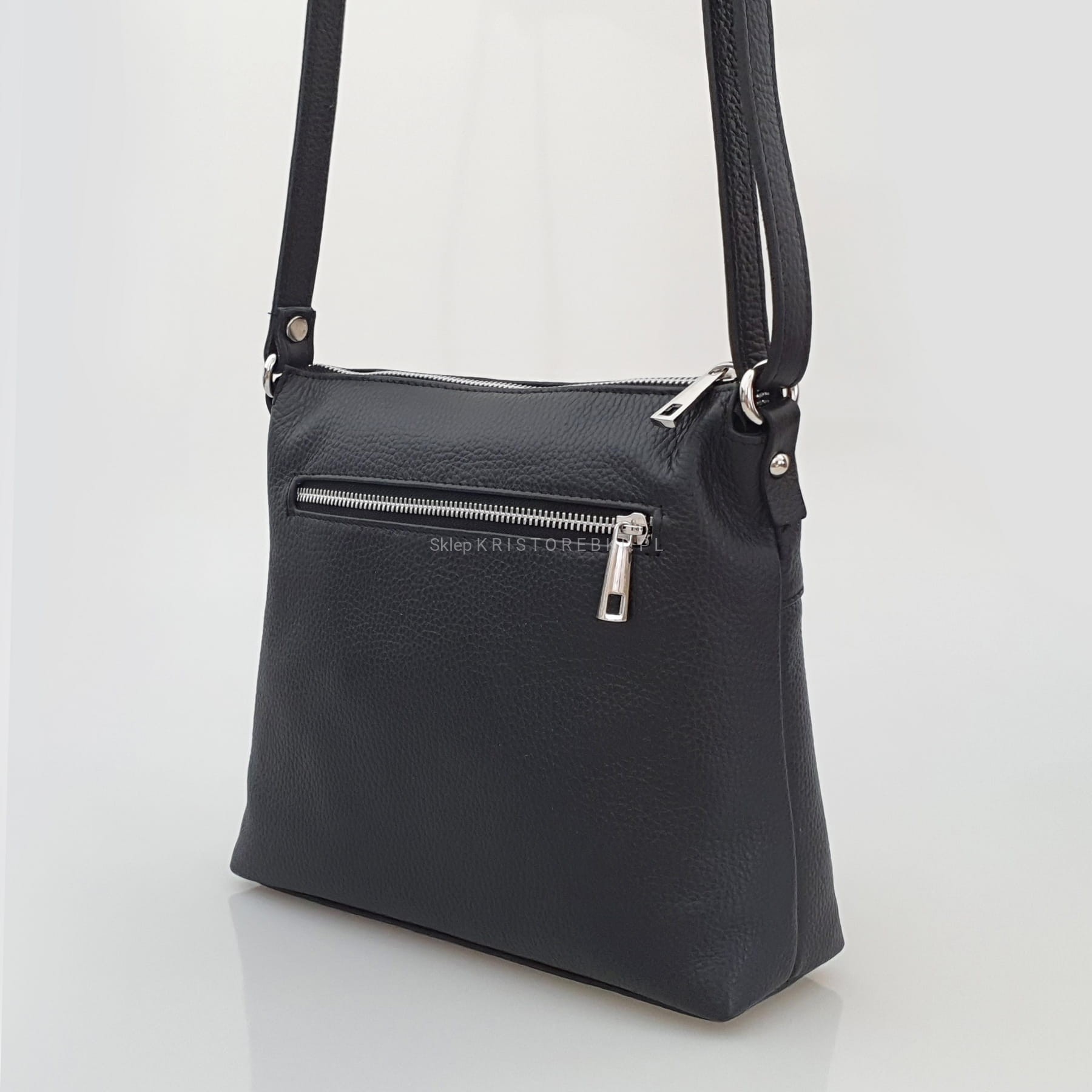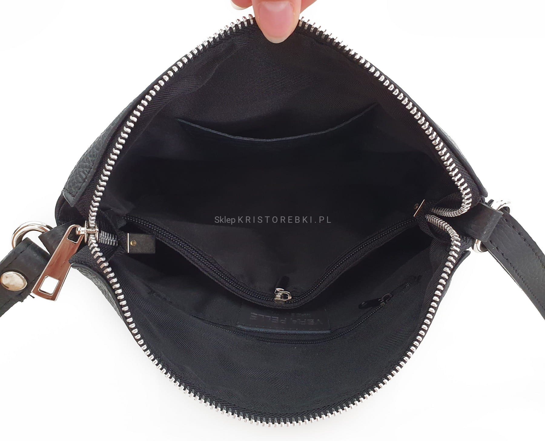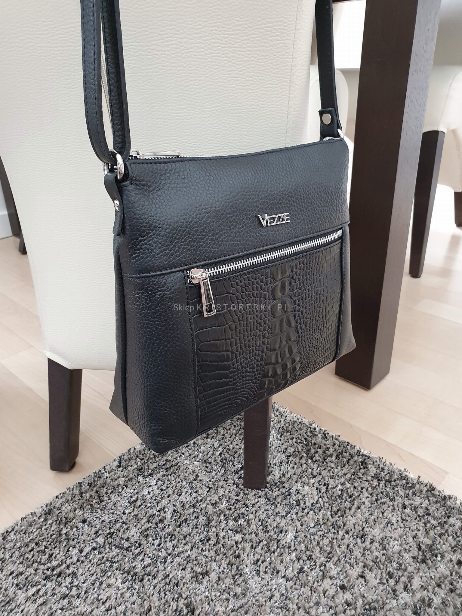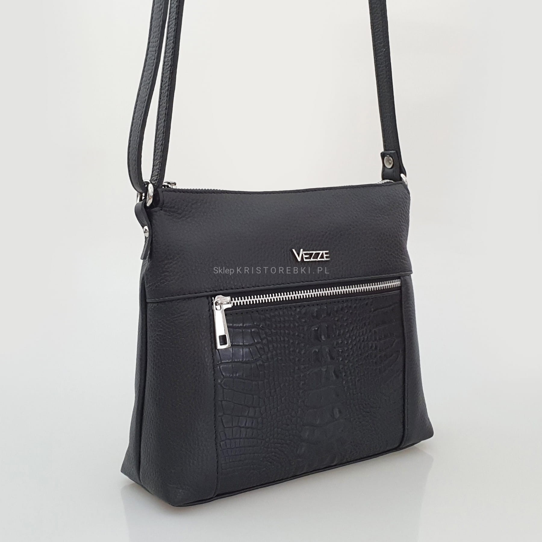 Skórzana torebka damska, listonoszka znanej i cenionej marki VEZZE w kolorze ZIELONYM. Wyprodukowana została we Włoszech z najwyższej jakości, pięknie pachnącej i miłej w dotyku skóry naturalnej. Torebka posiada srebrne okucia oraz solidny, długi i regulowany pasek, dzięki czemu idealnie dopasujesz ją do swojego wzrostu i preferencji. Główna komora torebki zapinana jest na solidny suwak. Środek wykończony jest wysokiej jakości podszewką oraz przedzielona jest w pół kieszenią zamykaną na suwak, dzięki czemu mamy do dyspozycji w środku 2 oddzielne i pojemne komory. Poprawia to w utrzymaniu w torebce porządku. Dodatkowo w środku znajduje się praktyczna kieszonka zamykana na suwak oraz nieduża kieszonka bez zapięcia na telefon lub dokumenty. Z przodu posiada wykończenie na modny wzór kroko, co dodaje jej uroku i atrakcyjności oraz posiada pojemną i praktyczną kieszeń zamykaną na suwak. Z tyłu również znajdziemy kieszonkę na suwak. Jest niezwykle stylowa i niepowtarzalna, co nada Twojej stylizacji niesamowitego charakteru. Dzięki wysokiej jakości wykonania będzie gwarancją świetnego i oryginalnego wyglądu oraz pozwoli na długotrwałe jej użytkowanie.
