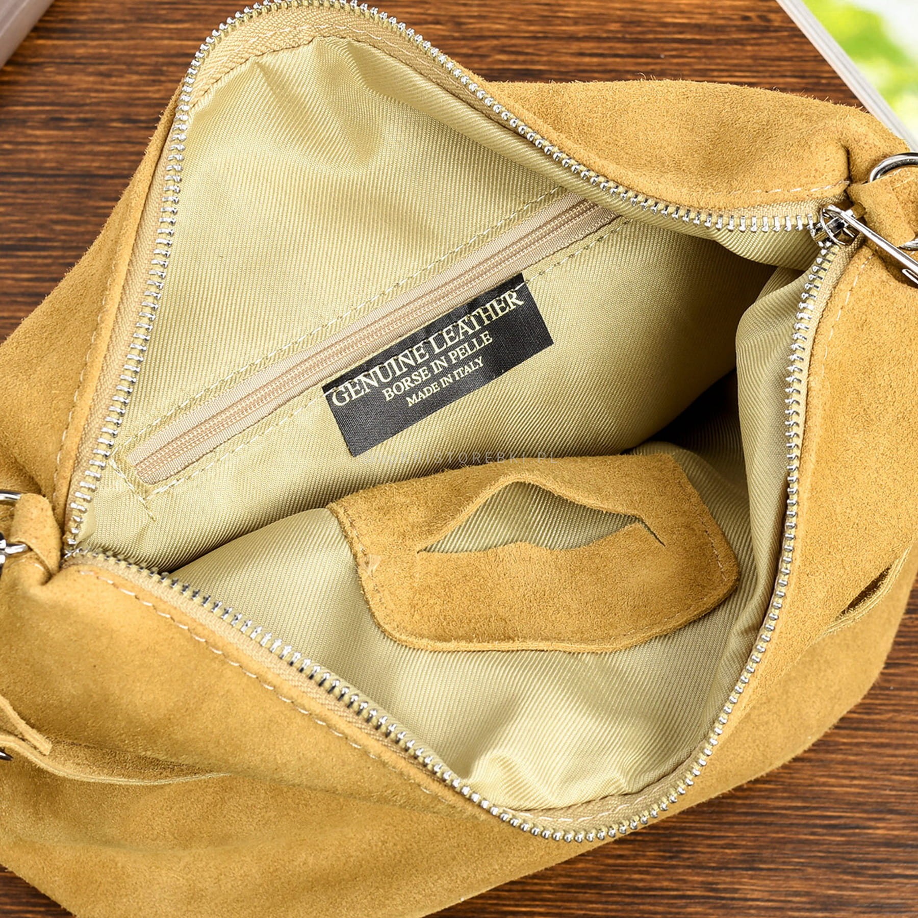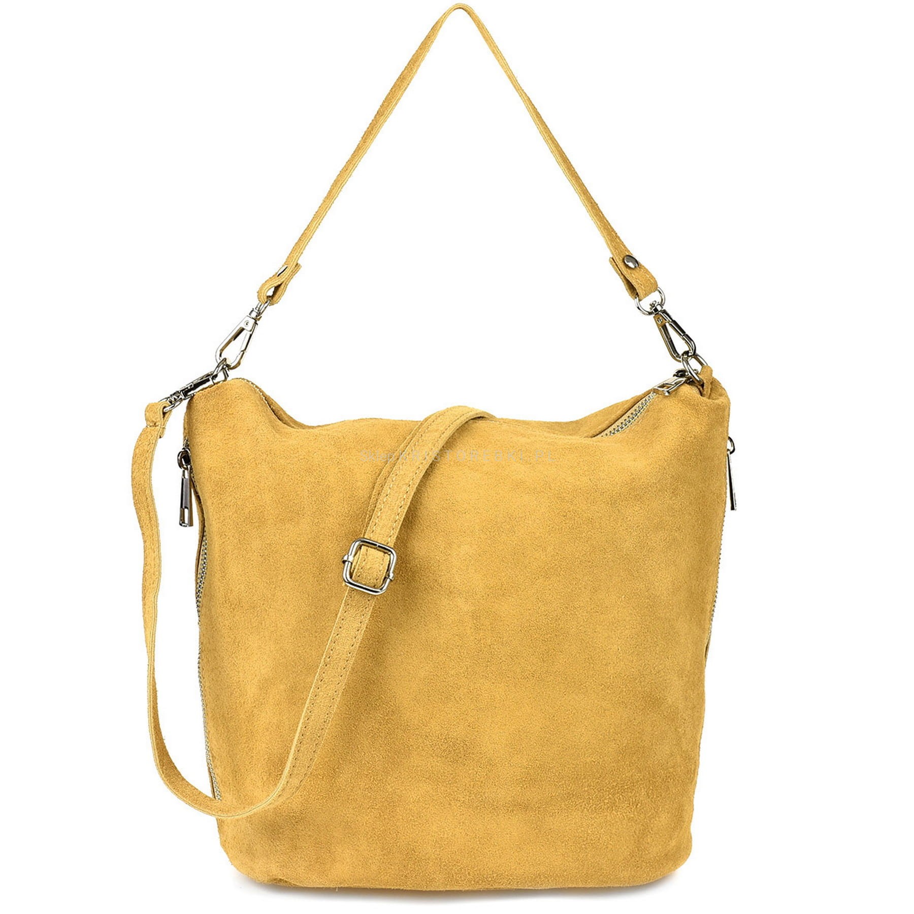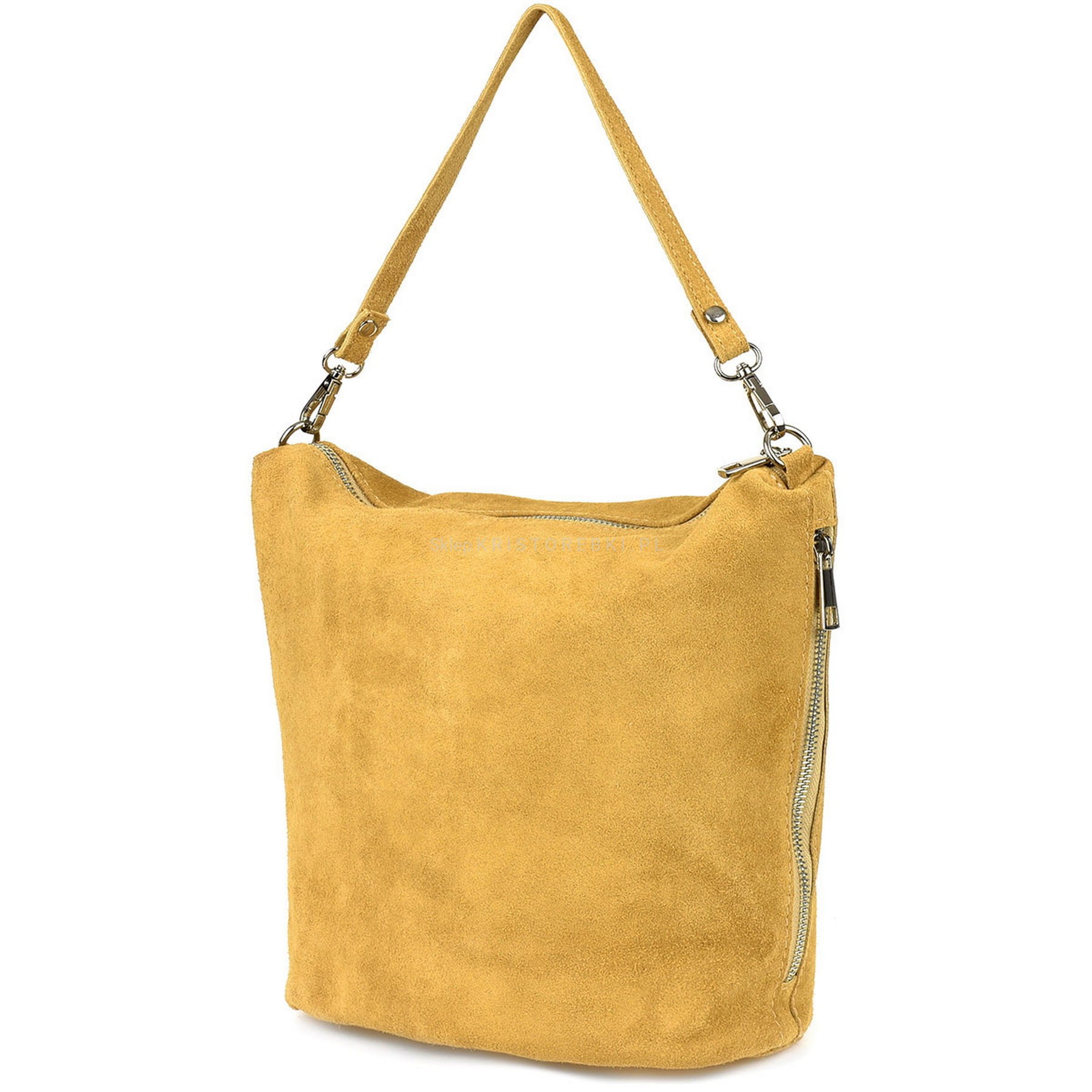 Włoska skórzana torebka damska typu shopper marki VERA PELLE ITALY w kolorze MUSZTARDOWYM. Wykonana została bardzo starannie z dbałością o najmniejsze szczegóły z najwyższej jakości zamszowej skóry naturalnej. Po bokach torebki znajdują się funkcjonale kieszonki zamykane na suwak. Torebka posiada w środku solidną podszewkę oraz zamykana jest na suwak. Listonoszka posiada dodatkowy paseczek nieregulowany z możliwością dopięcia go i noszenia torebki w ręku. Obydwa paski dopinane są poprzez małe srebrne karabińczyki