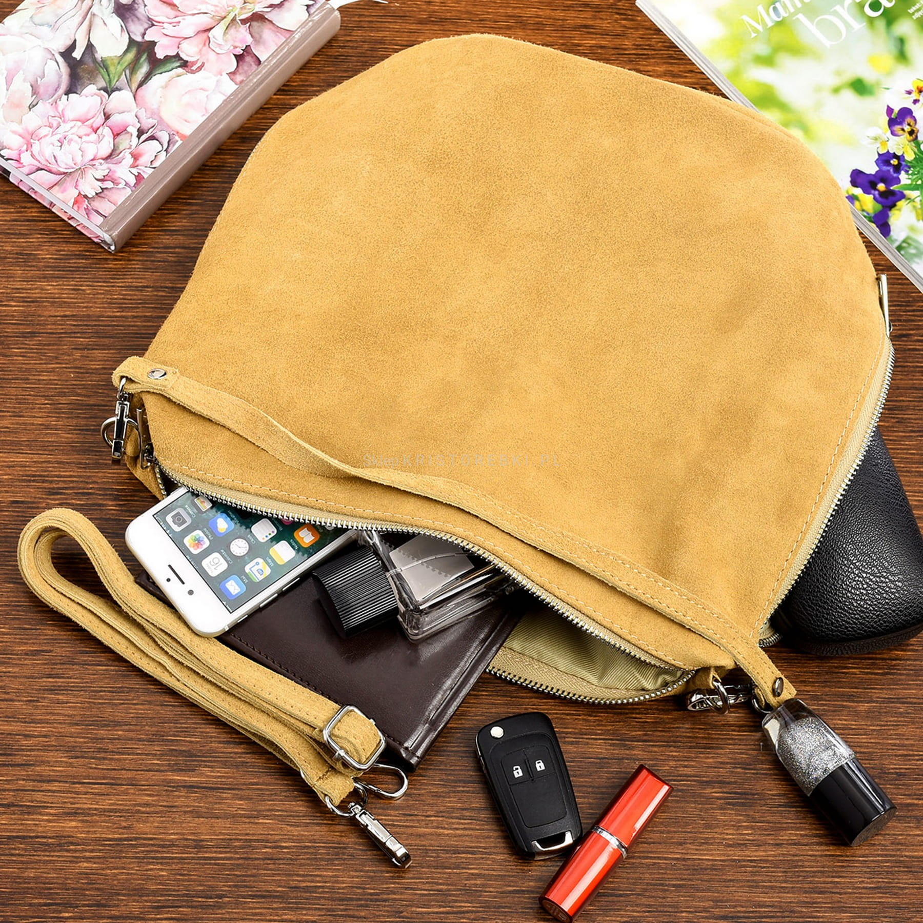 VERA PELLE torebka damska zamszowa listonoszka z paskiem na ramię V027 musztardowa