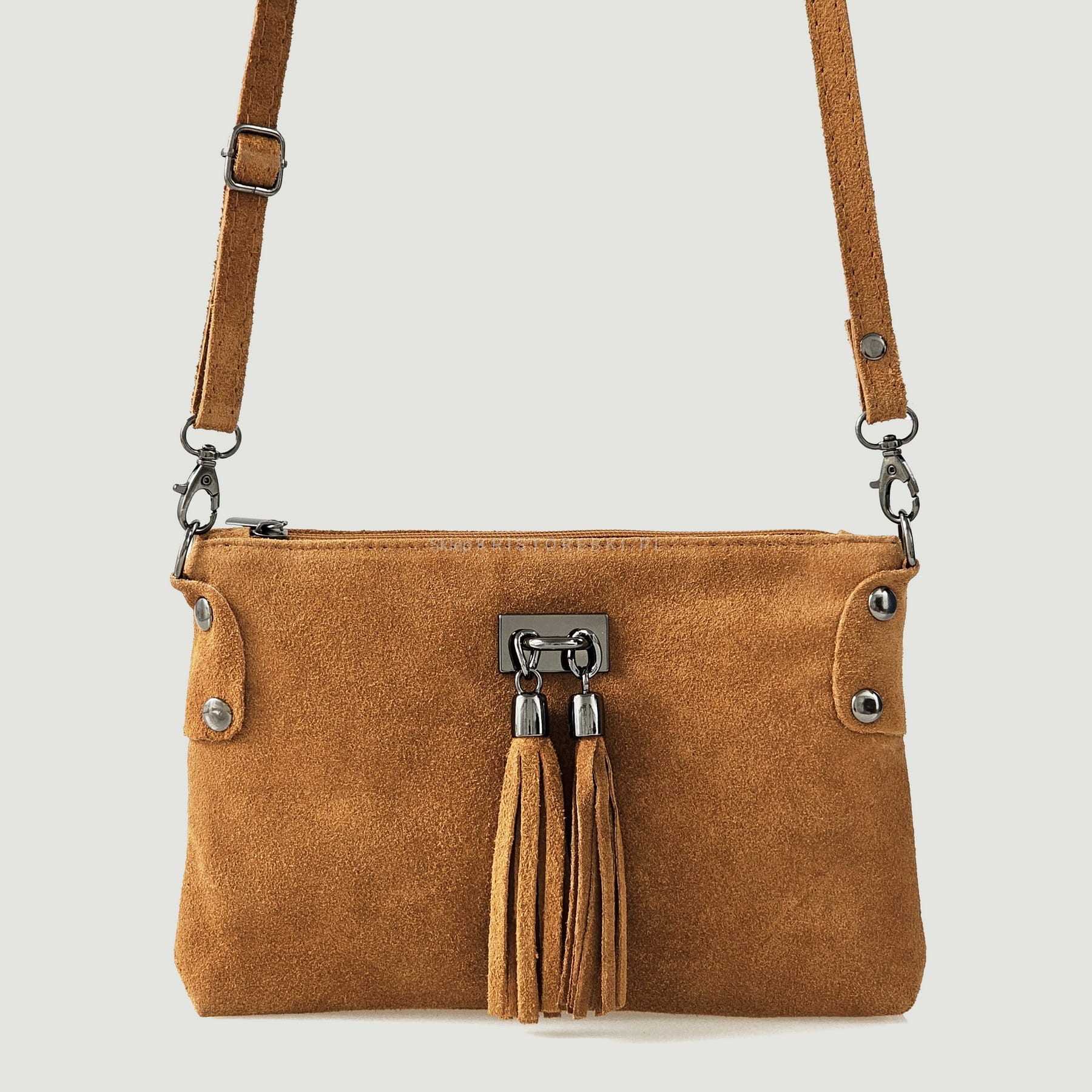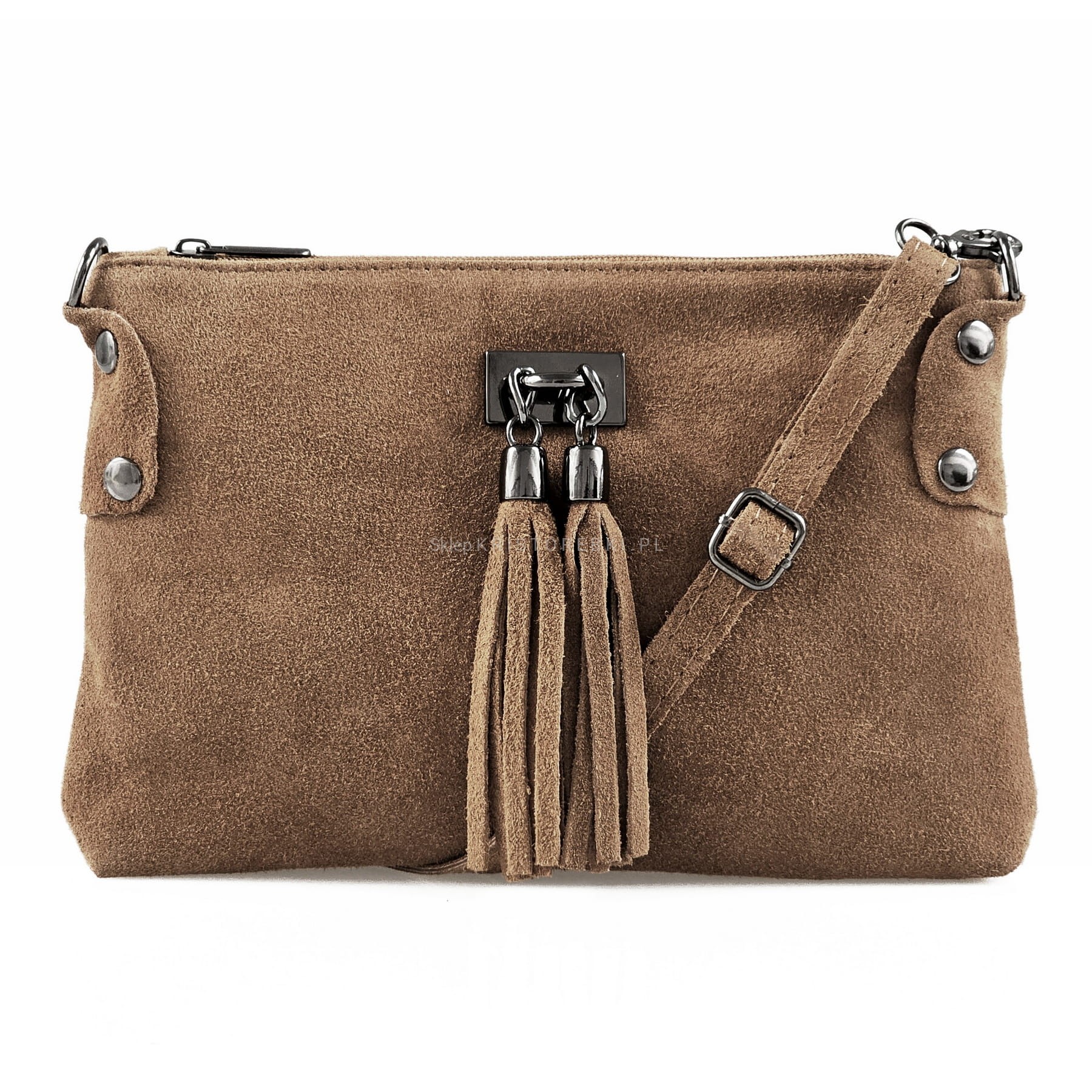 Skórzana, mała, lekka i zgrabna torebka listonoszka marki VERA PELLE ITALY w kolorze TAUPE. Wyprodukowana została we Włoszech z najwyższej jakości, pięknie pachnącej i miłej w dotyku skóry naturalnej zamszowej z dbałością o najmniejsze szczegóły. Zamykana jest na suwak a środek wykończony jest solidną podszewką. Dodatkowo w środku znajdziesz praktyczną kieszonkę zamykaną na suwak. Przód torebki zdobią 2 ozdobne frędzelki nadające jej styl boho. Mimo niedużych rozmiarów jest pojemna i pomieści najpotrzebniejsze rzeczy codziennego użytku.