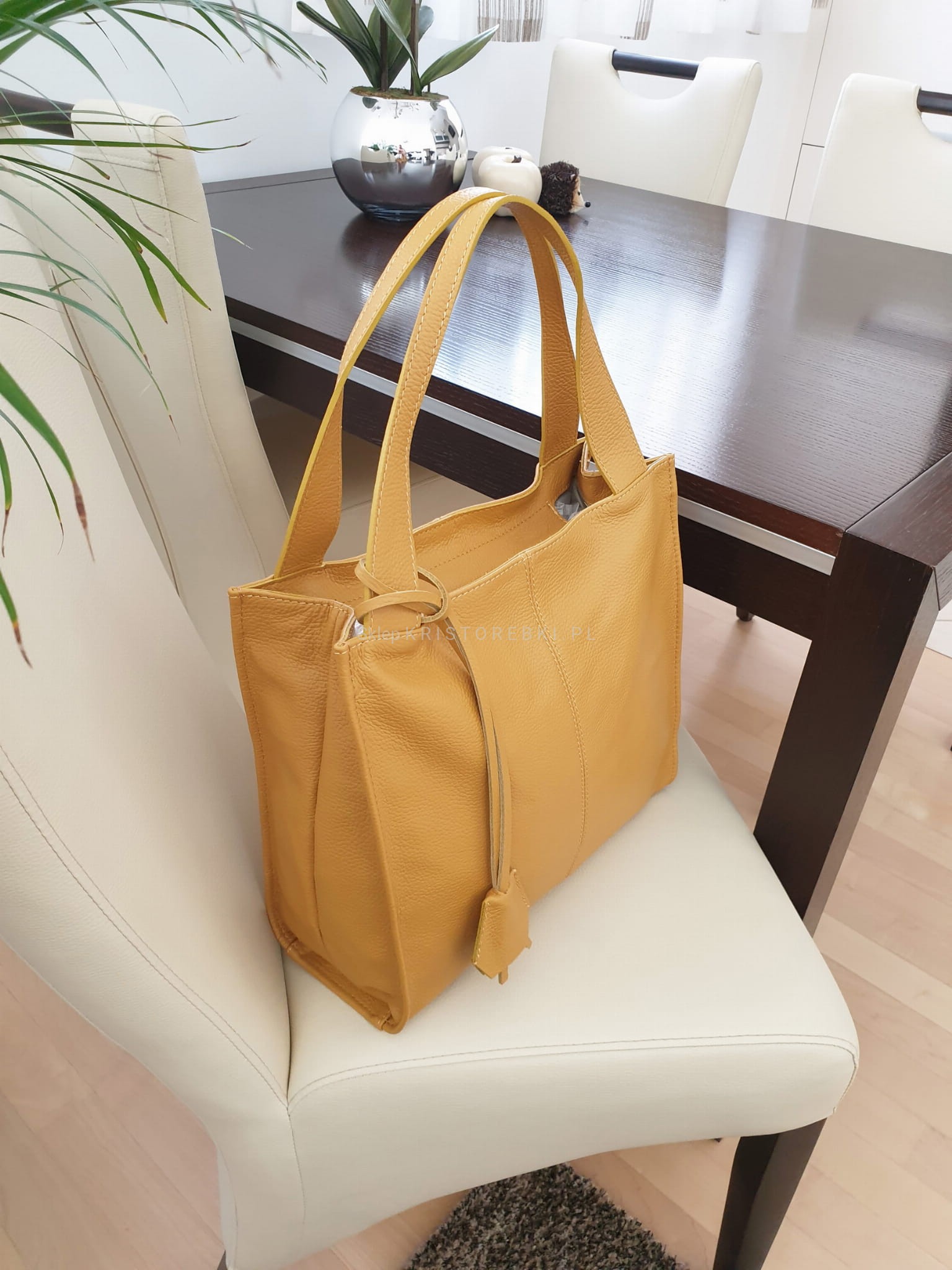 Włoska skórzana torebka klasyczna marki VERA PELLE ITALY w kolorze ZIELONYM. Wykonana w całości z wysoko gatunkowej, przyjemnie pachnącej skóry naturalnej. Torba jest typu shopper, dzięki czemu jest wygodna w codziennym użytkowaniu. Zamykana jest na suwak i posiada srebrne dodatki dzięki czemu będzie pasować do niemal każdej stylizacji. W środku wykończona jest podszewką oraz posiada dwie oddzielne komory przedzielone przegrodą zamykaną na suwak. Dodatkowo w środku znajduje się zamykana kieszonka na drobiazgi oraz dodatkowa kieszonka na telefon lub dokumenty. Jest bardzo pojemna i dzięki długim uszom możesz wygodnie ją nosić w ręku lub na ramieniu. Wykonana jest bardzo estetycznie z dbałością o najdrobniejsze szczegóły (proste i starannie wykonane szwy). Z przodu posiada zdejmowany, ozdobny brelok zawieszkę.