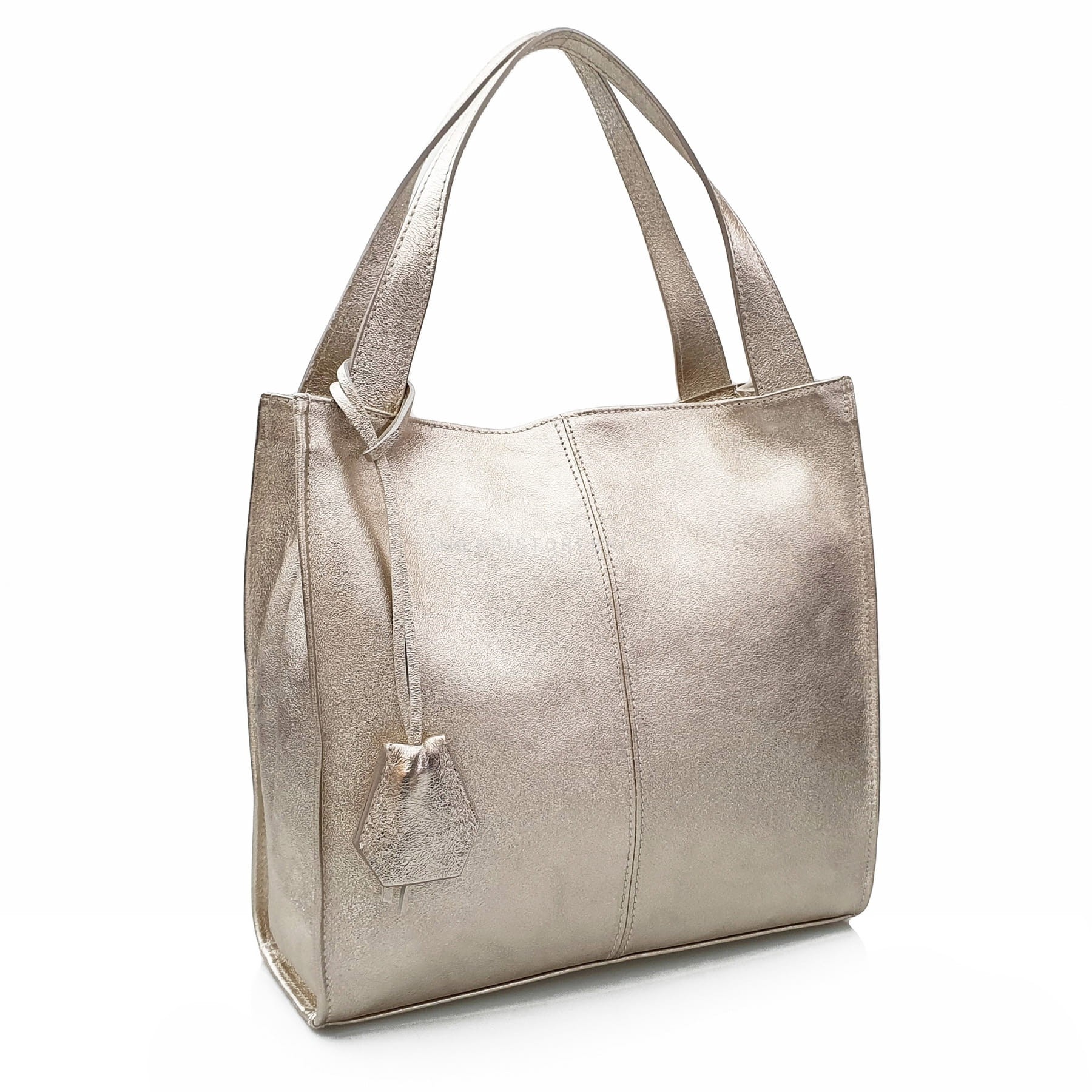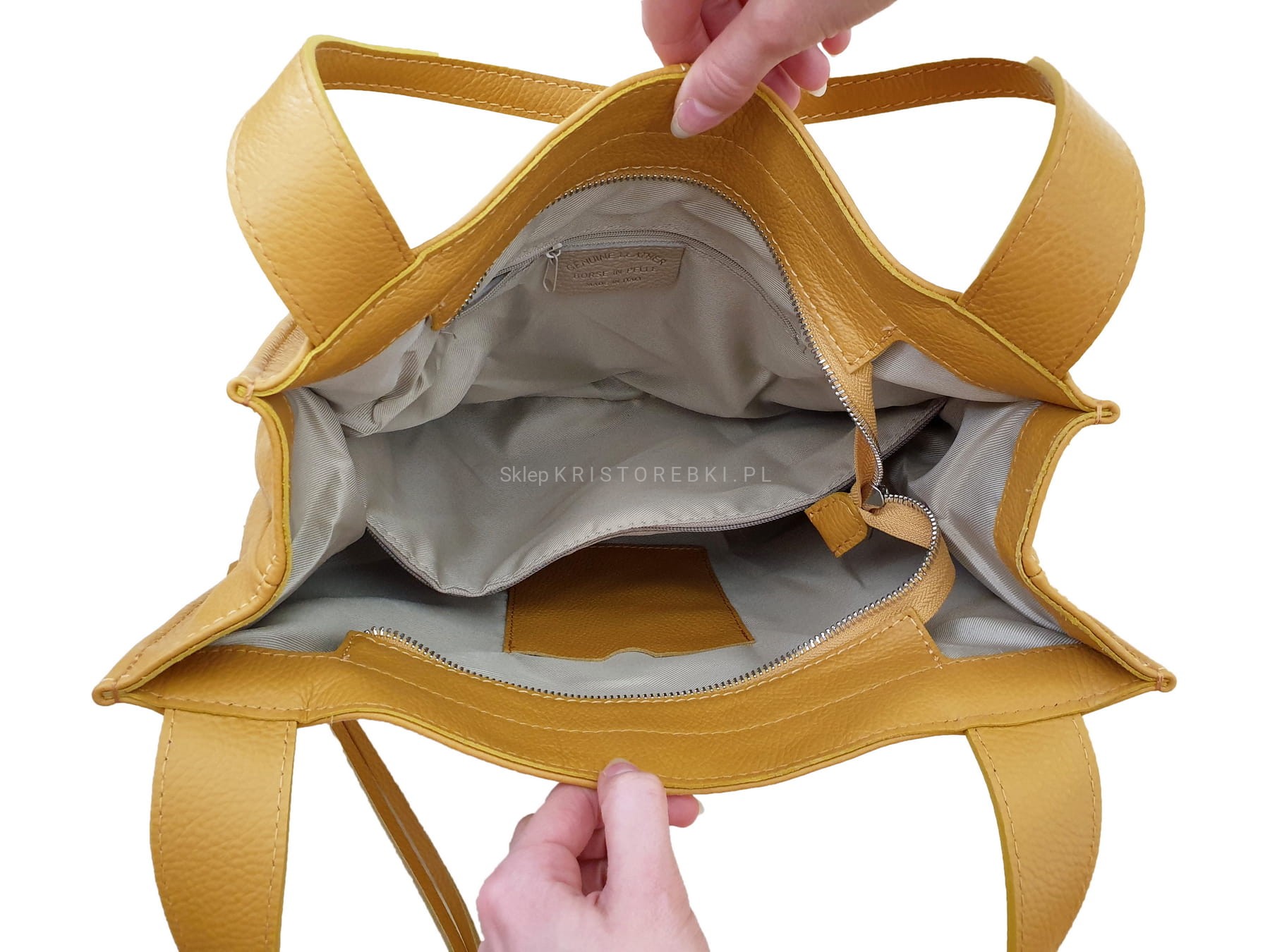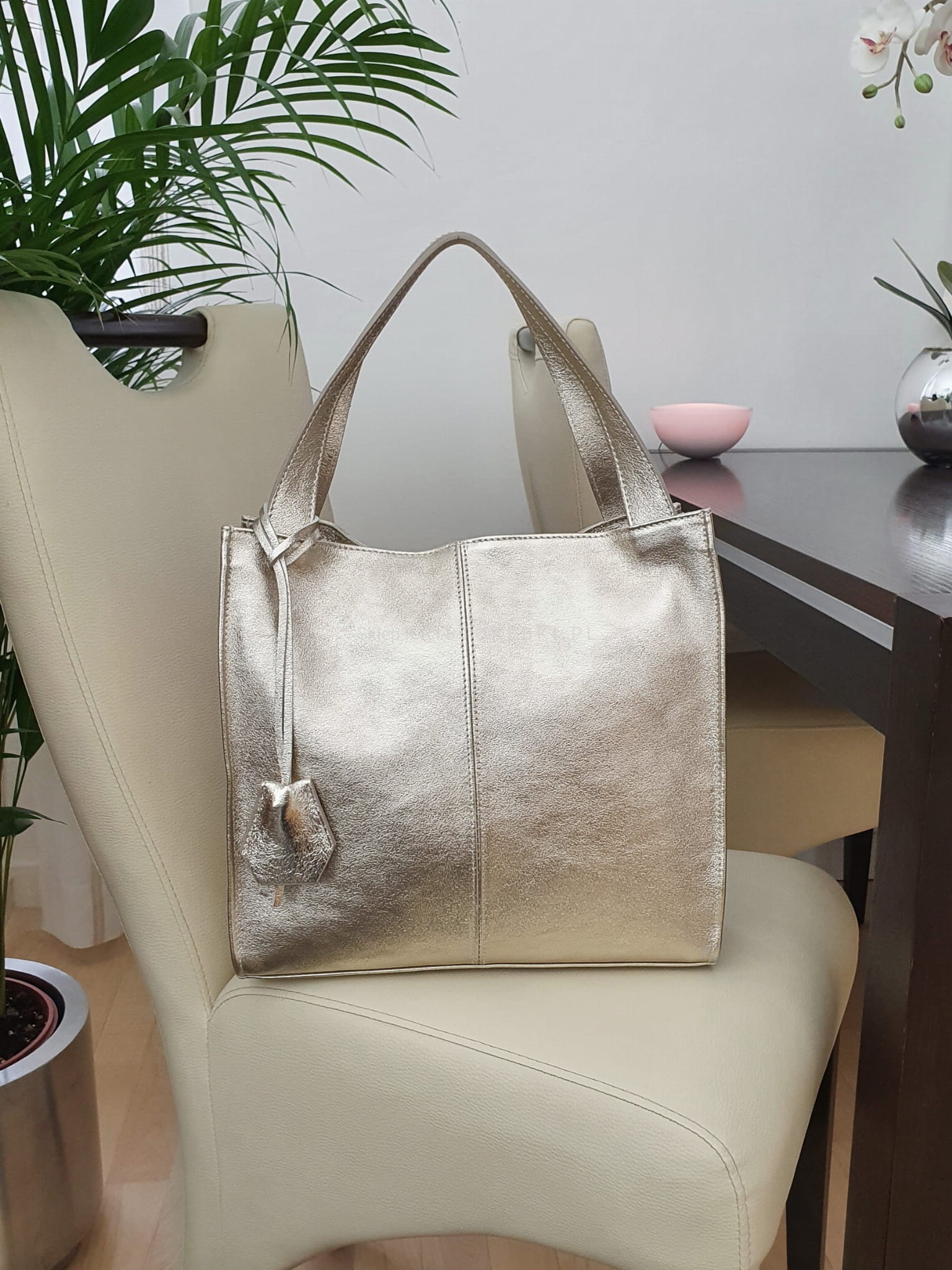 Włoska skórzana torebka klasyczna marki VERA PELLE ITALY w kolorze ZŁOTYM. Wykonana w całości z wysoko gatunkowej, przyjemnie pachnącej skóry naturalnej. Torba jest typu shopper, dzięki czemu jest wygodna w codziennym użytkowaniu. Zamykana jest na suwak i posiada srebrne dodatki dzięki czemu będzie pasować do niemal każdej stylizacji. W środku wykończona jest podszewką oraz posiada dwie oddzielne komory przedzielone przegrodą zamykaną na suwak. Dodatkowo w środku znajduje się zamykana kieszonka na drobiazgi oraz dodatkowa kieszonka na telefon lub dokumenty. Jest bardzo pojemna i dzięki długim uszom możesz wygodnie ją nosić w ręku lub na ramieniu. Wykonana jest bardzo estetycznie z dbałością o najdrobniejsze szczegóły (proste i starannie wykonane szwy). Z przodu posiada zdejmowany, ozdobny brelok zawieszkę.