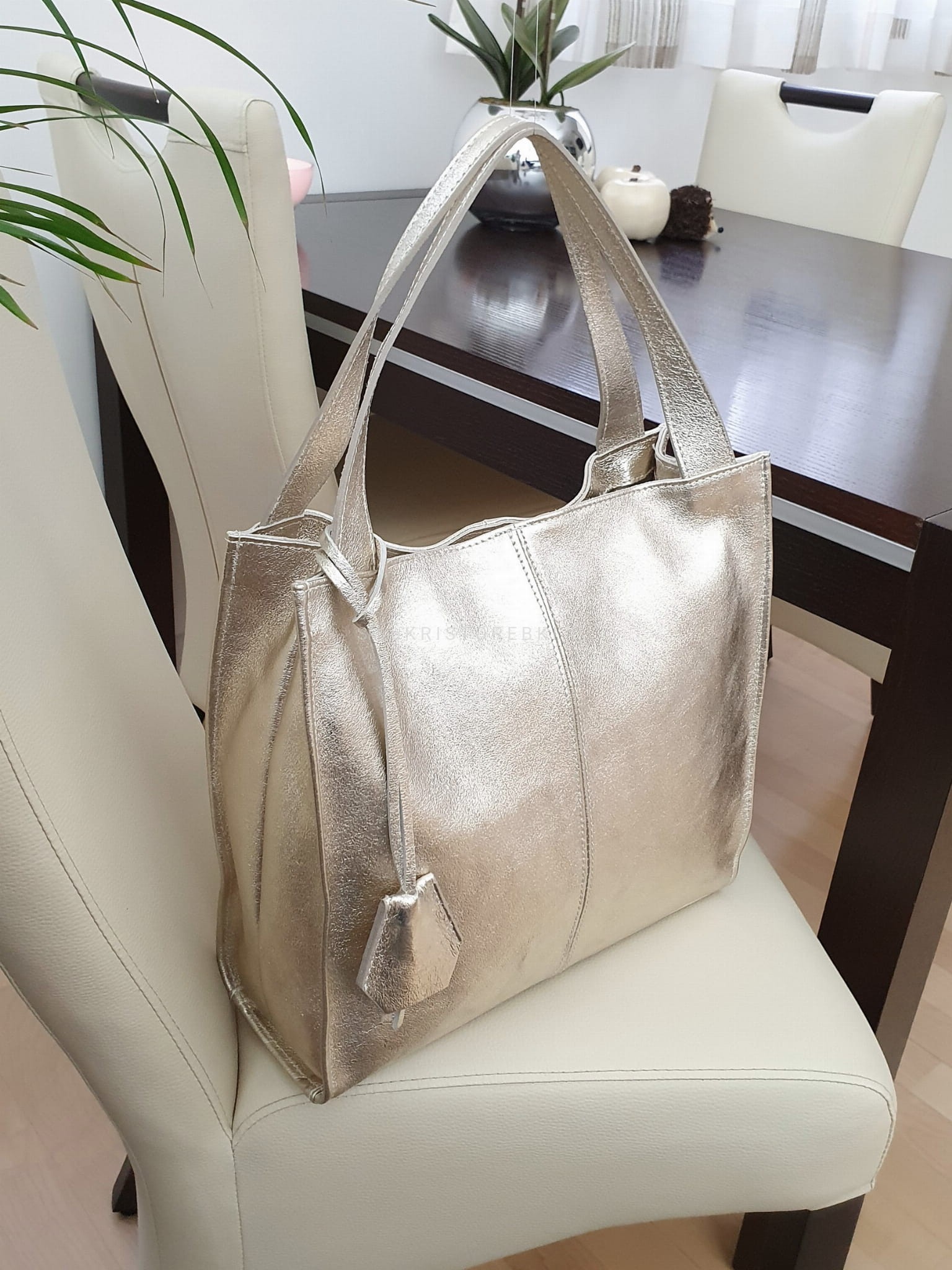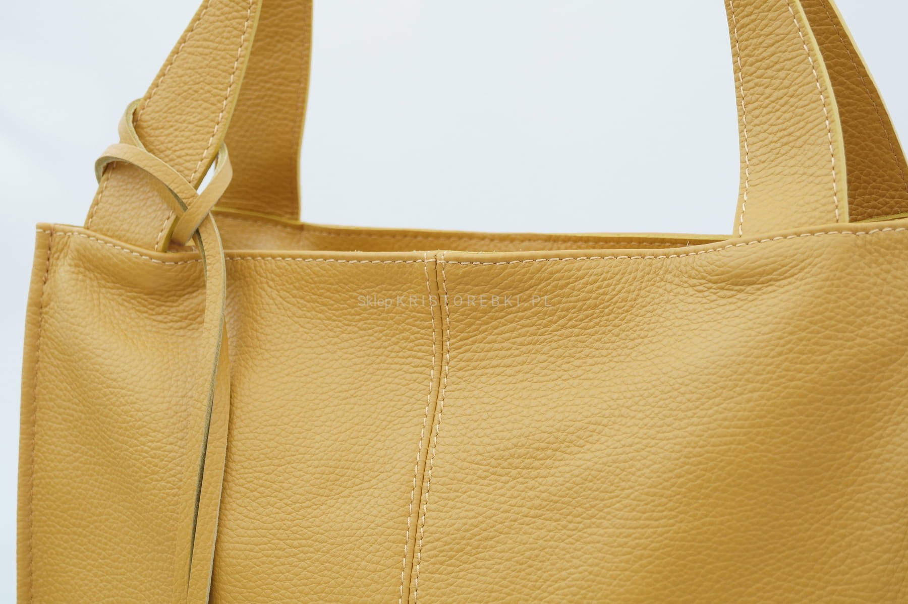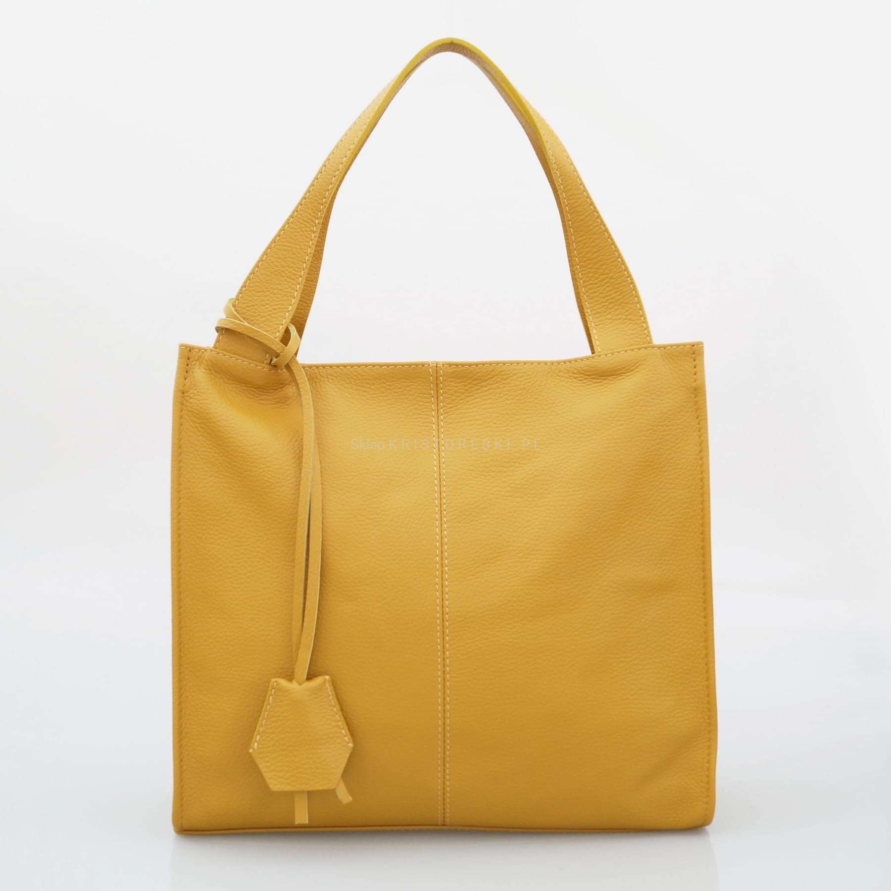 Włoska skórzana torebka klasyczna marki VERA PELLE ITALY w kolorze ZŁOTYM. Wykonana w całości z wysoko gatunkowej, przyjemnie pachnącej skóry naturalnej. Torba jest typu shopper, dzięki czemu jest wygodna w codziennym użytkowaniu. Zamykana jest na suwak i posiada srebrne dodatki dzięki czemu będzie pasować do niemal każdej stylizacji. W środku wykończona jest podszewką oraz posiada dwie oddzielne komory przedzielone przegrodą zamykaną na suwak. Dodatkowo w środku znajduje się zamykana kieszonka na drobiazgi oraz dodatkowa kieszonka na telefon lub dokumenty. Jest bardzo pojemna i dzięki długim uszom możesz wygodnie ją nosić w ręku lub na ramieniu. Wykonana jest bardzo estetycznie z dbałością o najdrobniejsze szczegóły (proste i starannie wykonane szwy). Z przodu posiada zdejmowany, ozdobny brelok zawieszkę.