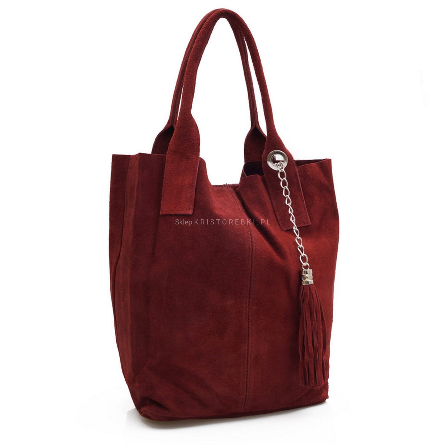 Włoska skórzana torebka damska typu shopper znanej i cenionej marki VERA PELLE ITALY w kolorze BORDO. Wykonana została bardzo starannie z dbałością o najmniejsze szczegóły z najwyższej jakości zamszowej skóry naturalnej oraz dostępna jest w wyjątkowo szerokiej kolorystyce. Z przodu ozdobiona jest wiszącym frędzelkiem oraz dodatkowo posiada w zestawie saszetkę zamykaną na suwak, w której możesz schować np. dokumenty. W środku jest bardzo pojemna. Torebka posiada długie uszy, dzięki czemu możesz ją wygodnie nosić i w ręku i na ramieniu a dzięki uniwersalnemu wyglądowi będzie pasowała do niemal każdej codziennej stylizacji. Jest bardzo wygodna i praktyczna dzięki czemu jest jednym z najlepiej sprzedających się modeli w naszej ofercie.
