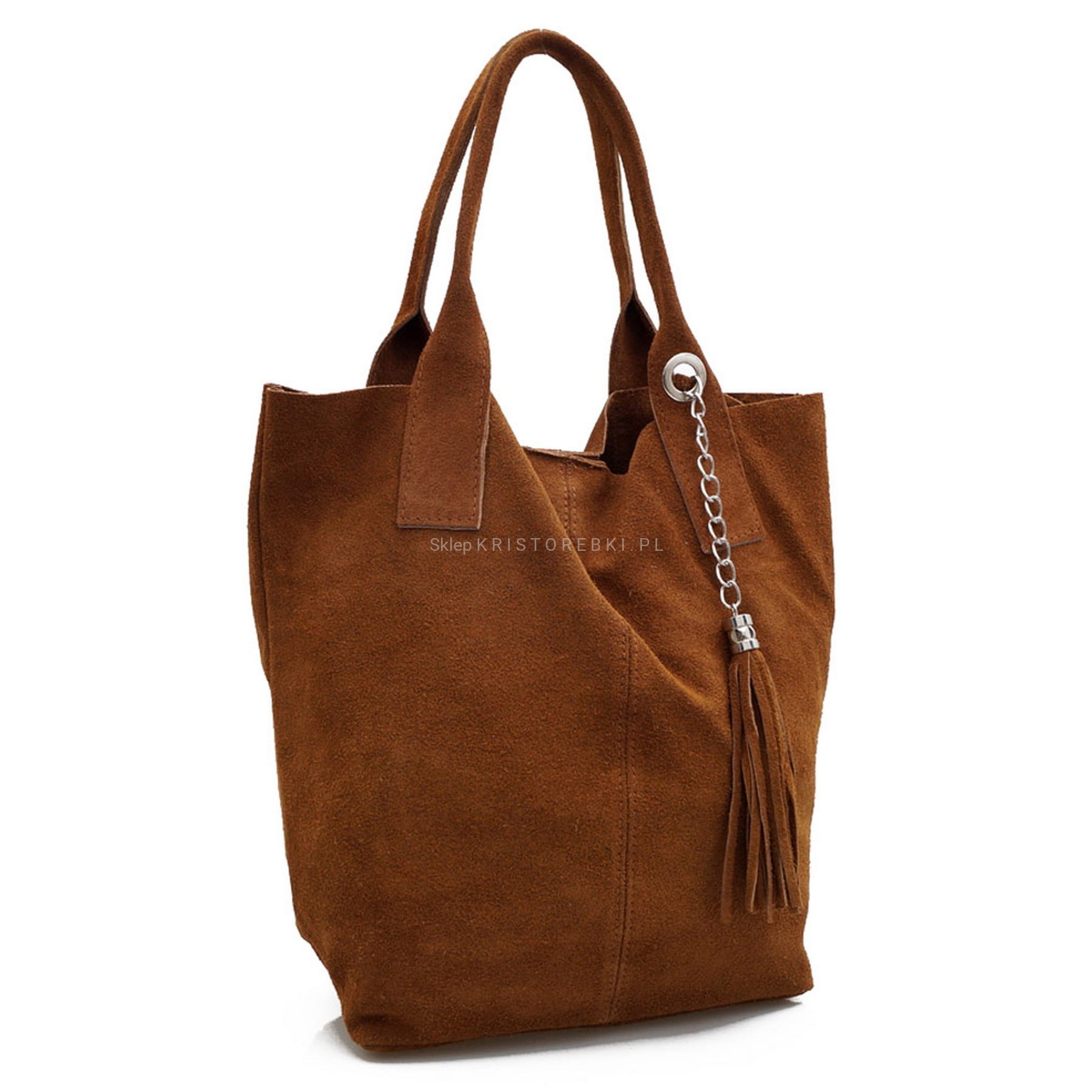 Włoska skórzana torebka damska typu shopper znanej i cenionej marki VERA PELLE ITALY w kolorze KONIAKOWEGO BRĄZU. Wykonana została bardzo starannie z dbałością o najmniejsze szczegóły z najwyższej jakości zamszowej skóry naturalnej oraz dostępna jest w wyjątkowo szerokiej kolorystyce. Z przodu ozdobiona jest wiszącym frędzelkiem oraz dodatkowo posiada w zestawie saszetkę zamykaną na suwak, w której możesz schować np. dokumenty. W środku jest bardzo pojemna. Torebka posiada długie uszy, dzięki czemu możesz ją wygodnie nosić i w ręku i na ramieniu a dzięki uniwersalnemu wyglądowi będzie pasowała do niemal każdej codziennej stylizacji. Jest bardzo wygodna i praktyczna dzięki czemu jest jednym z najlepiej sprzedających się modeli w naszej ofercie.