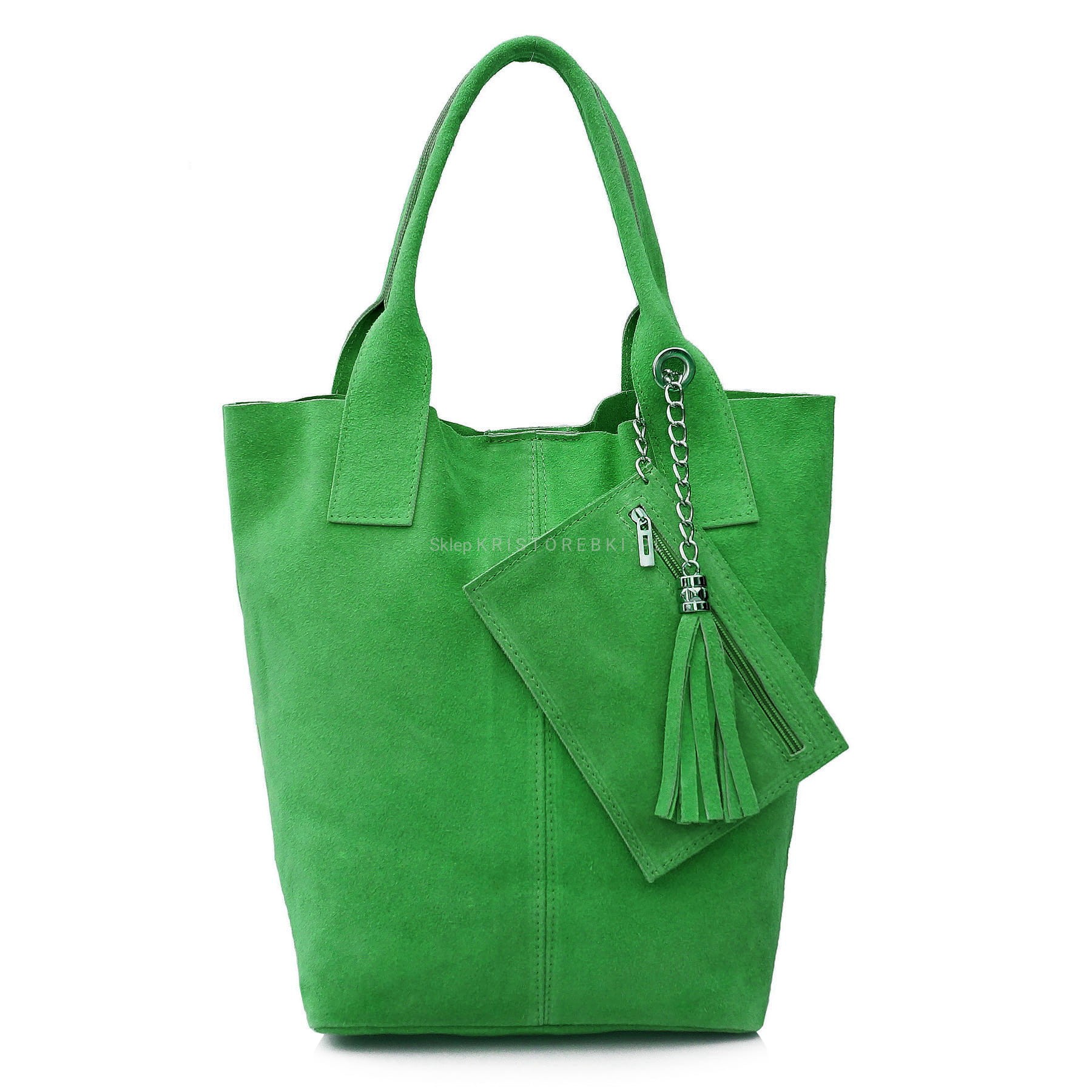 Włoska skórzana torebka damska typu shopper znanej i cenionej marki VERA PELLE ITALY w kolorze ZIELONYM. Wykonana została bardzo starannie z dbałością o najmniejsze szczegóły z najwyższej jakości zamszowej skóry naturalnej oraz dostępna jest w wyjątkowo szerokiej kolorystyce. Z przodu ozdobiona jest wiszącym frędzelkiem oraz dodatkowo posiada w zestawie saszetkę zamykaną na suwak, w której możesz schować np. dokumenty. W środku jest bardzo pojemna. Torebka posiada długie uszy, dzięki czemu możesz ją wygodnie nosić i w ręku i na ramieniu a dzięki uniwersalnemu wyglądowi będzie pasowała do niemal każdej codziennej stylizacji. Jest bardzo wygodna i praktyczna dzięki czemu jest jednym z najlepiej sprzedających się modeli w naszej ofercie.