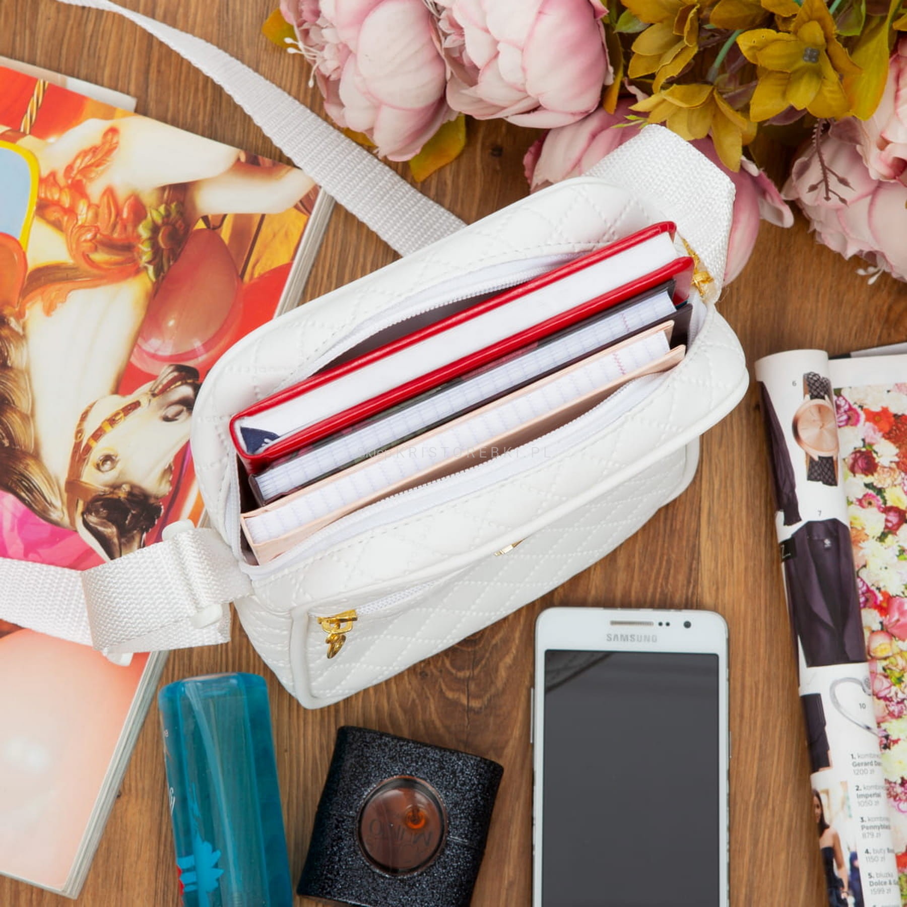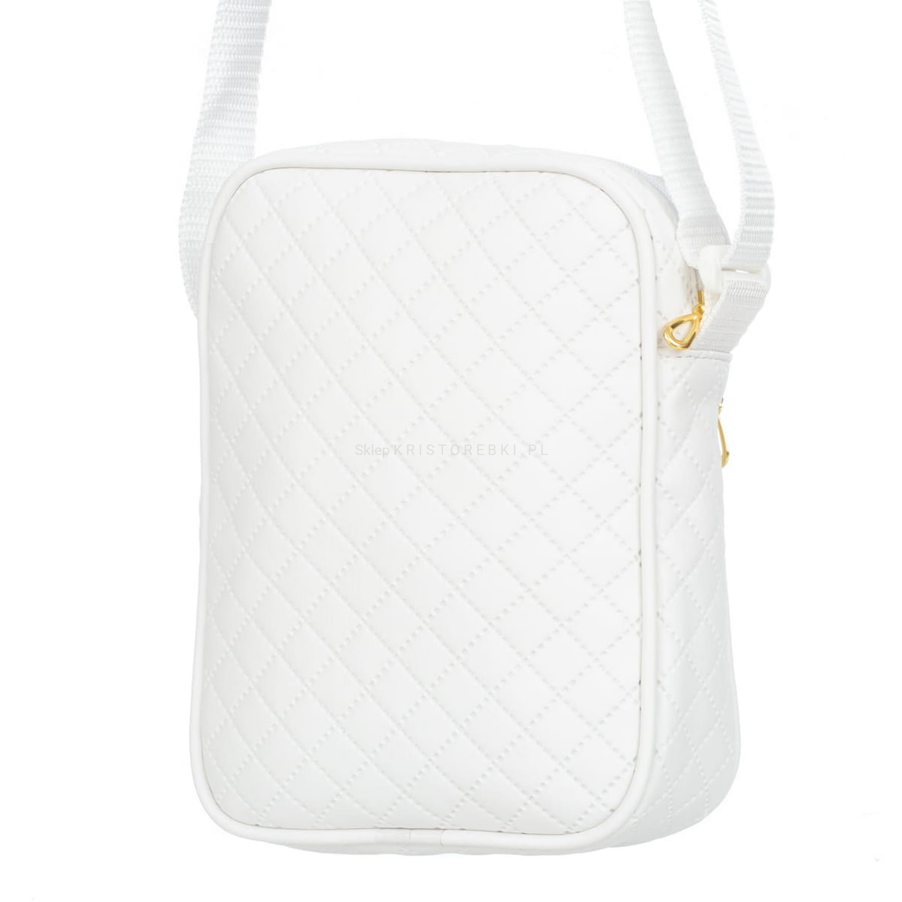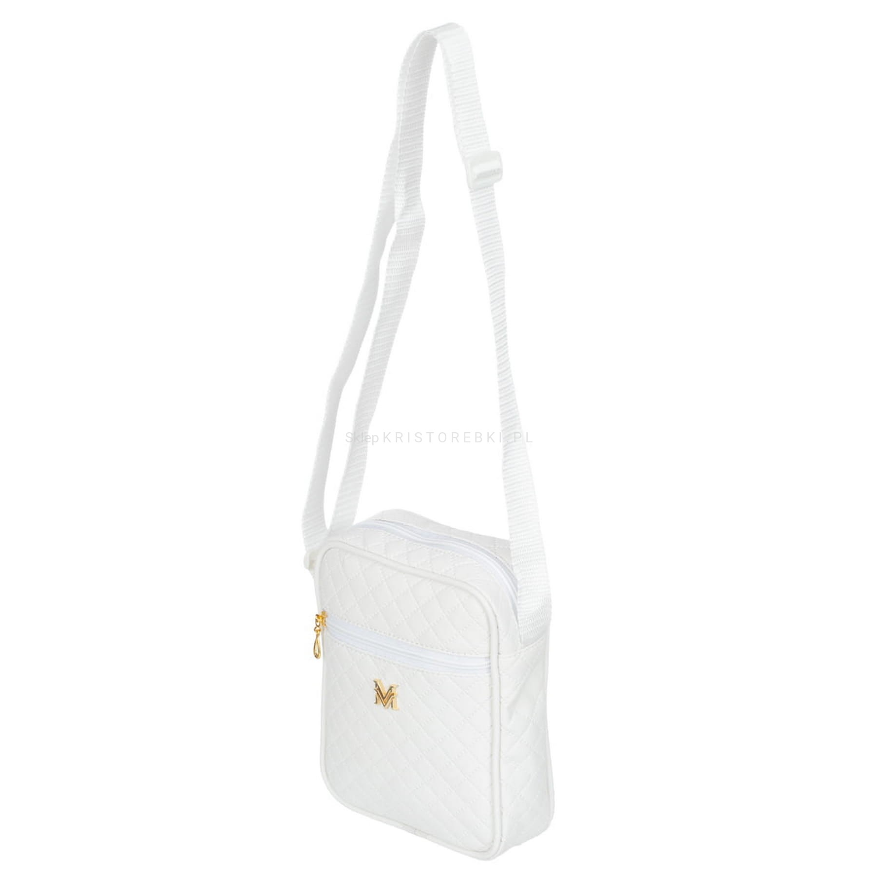 Torebka listonoszka marki VERMARI w kolorze BIAŁYM i okuciami w kolorze ZŁOTYM. Wyprodukowana została z najwyższej jakości pikowanej skóry ekologicznej. Listonoszka została uszyta uszyta z dbałością o najmniejszy detal. Główna komora zamykana jest na suwak. Dodatkowo z przodu znajdziesz kolejną kieszeń zamykaną na suwak. Jednokomorowy środek wykończony jest miłą w dotyku podszewką. Listonoszka posiada dodatkowo długi i regulowany pasek do noszenia na ramieniu.