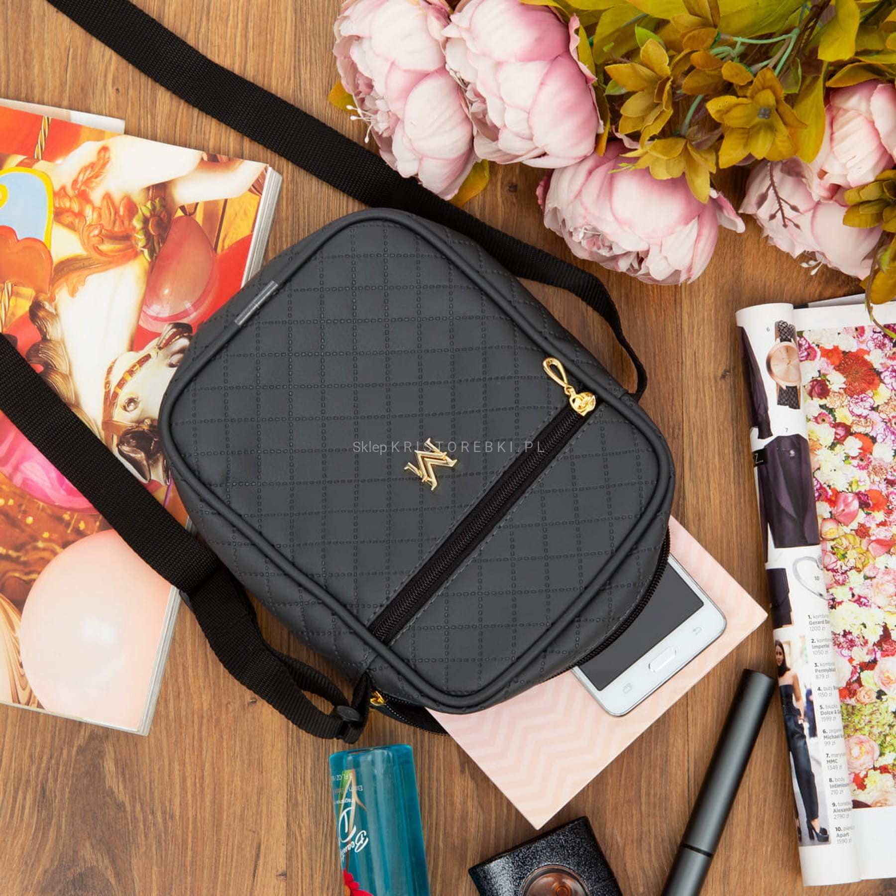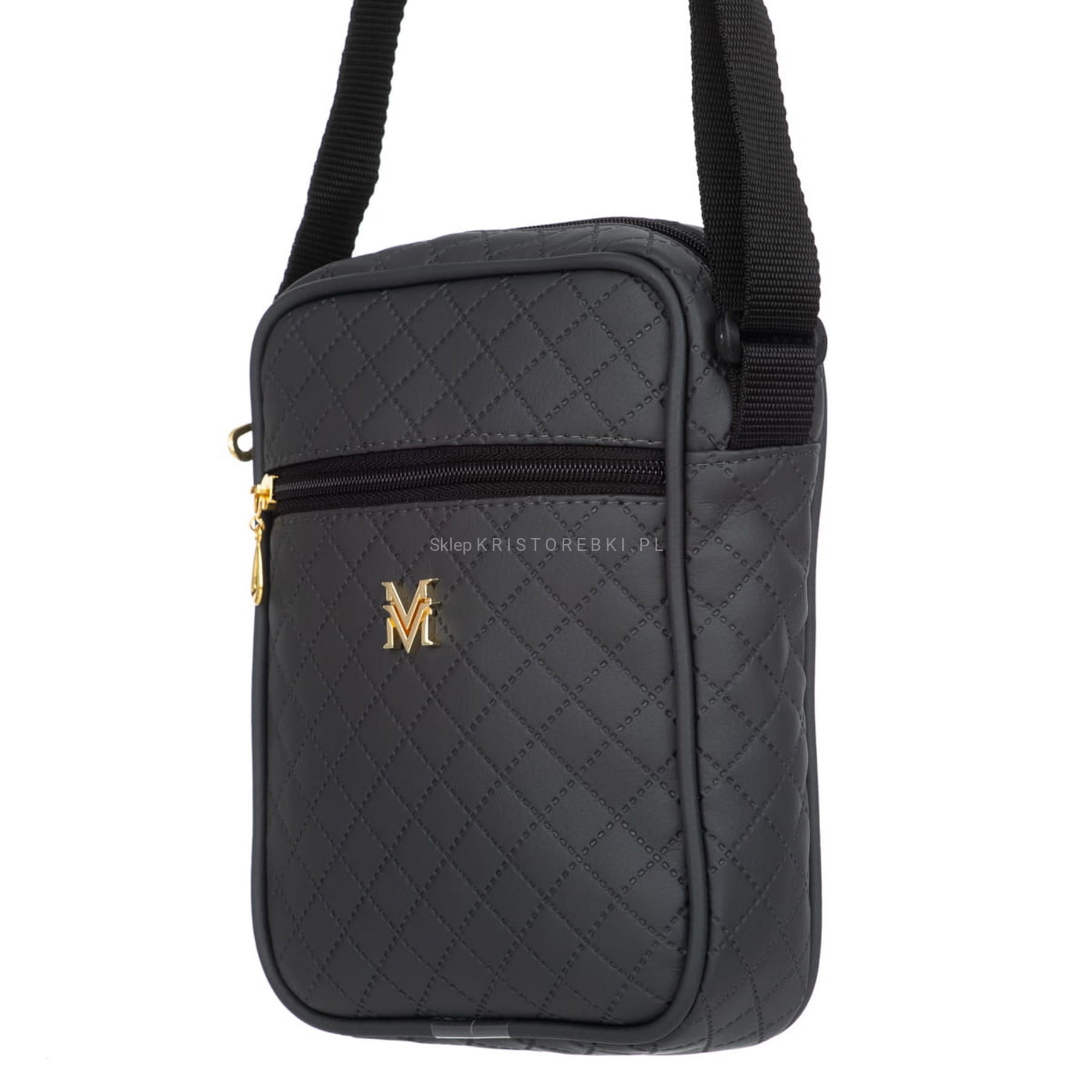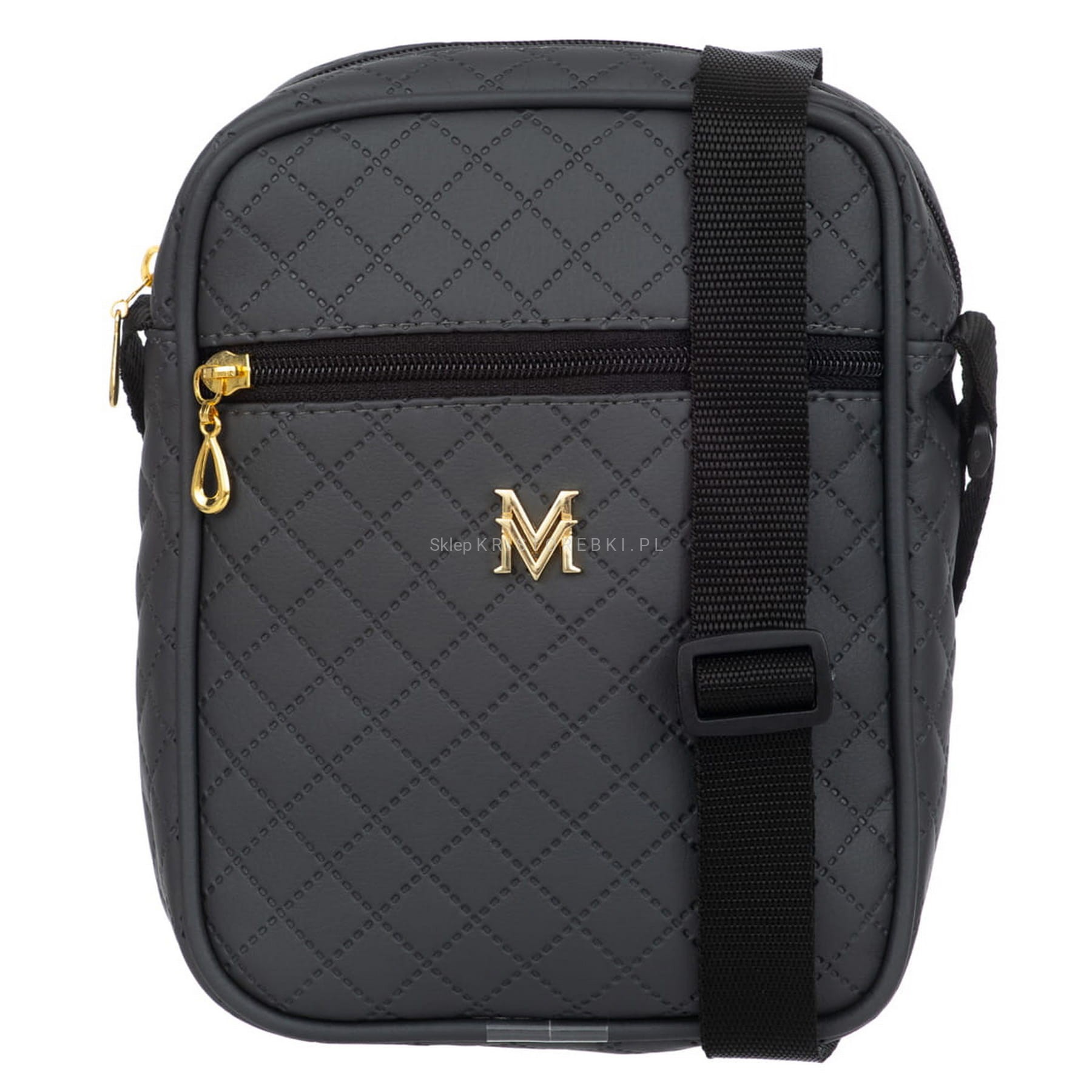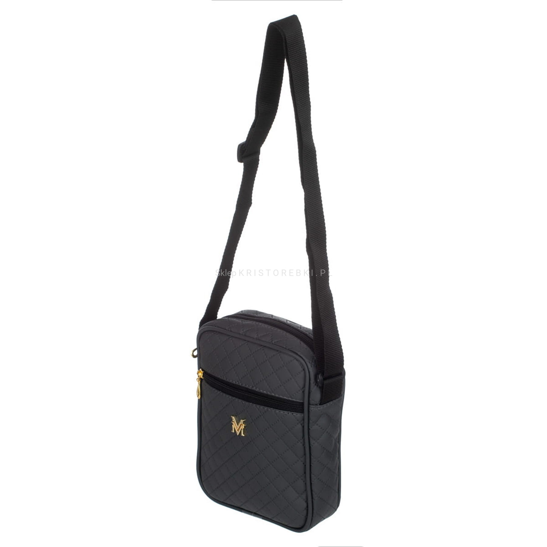 Torebka listonoszka marki VERMARI w kolorze GRAFITOWYM i okuciami w kolorze ZŁOTYM. Wyprodukowana została z najwyższej jakości pikowanej skóry ekologicznej. Listonoszka została uszyta uszyta z dbałością o najmniejszy detal. Główna komora zamykana jest na suwak. Dodatkowo z przodu znajdziesz kolejną kieszeń zamykaną na suwak. Jednokomorowy środek wykończony jest miłą w dotyku podszewką. Listonoszka posiada dodatkowo długi i regulowany pasek do noszenia na ramieniu.