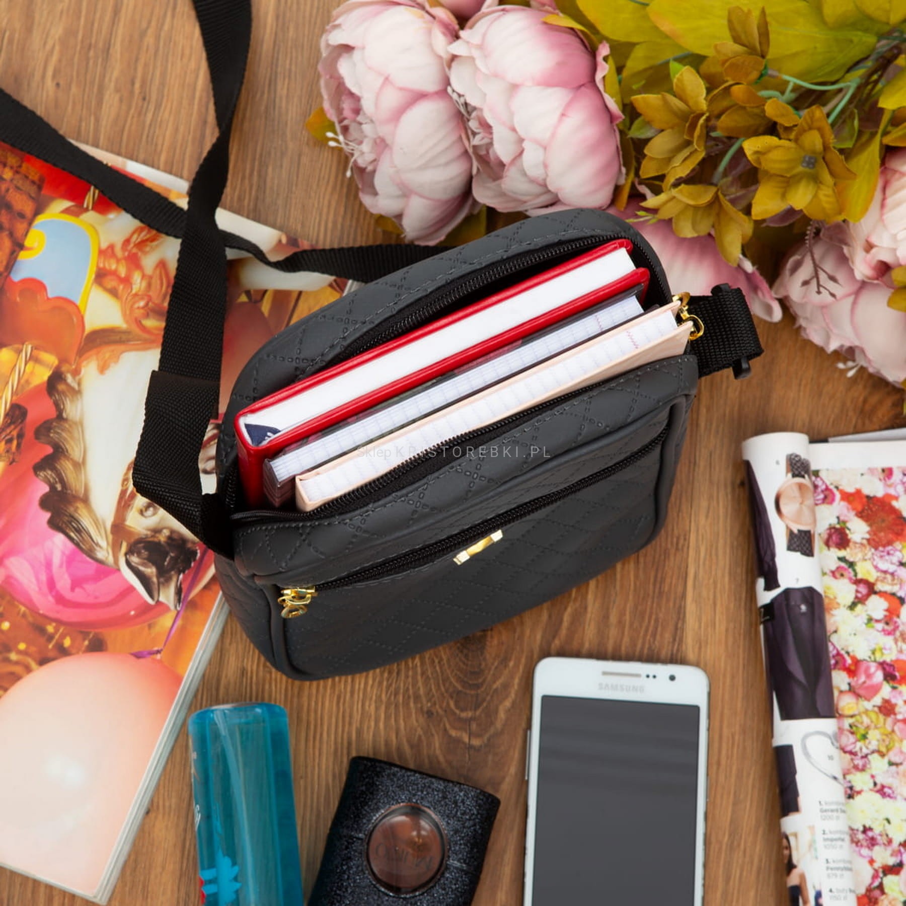 VERMARI torebka skórzana eko listonoszka na ramię pikowana V101 grafitowa