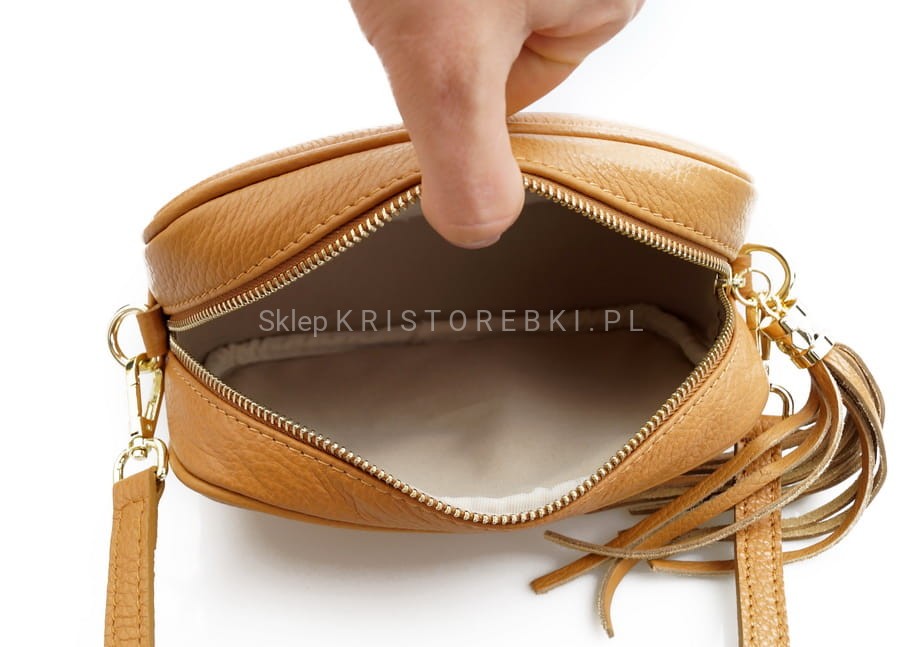 VERA PELLE torebka damska skórzana listonoszka z frędzelkiem i paskiem na ramię V145 taupe