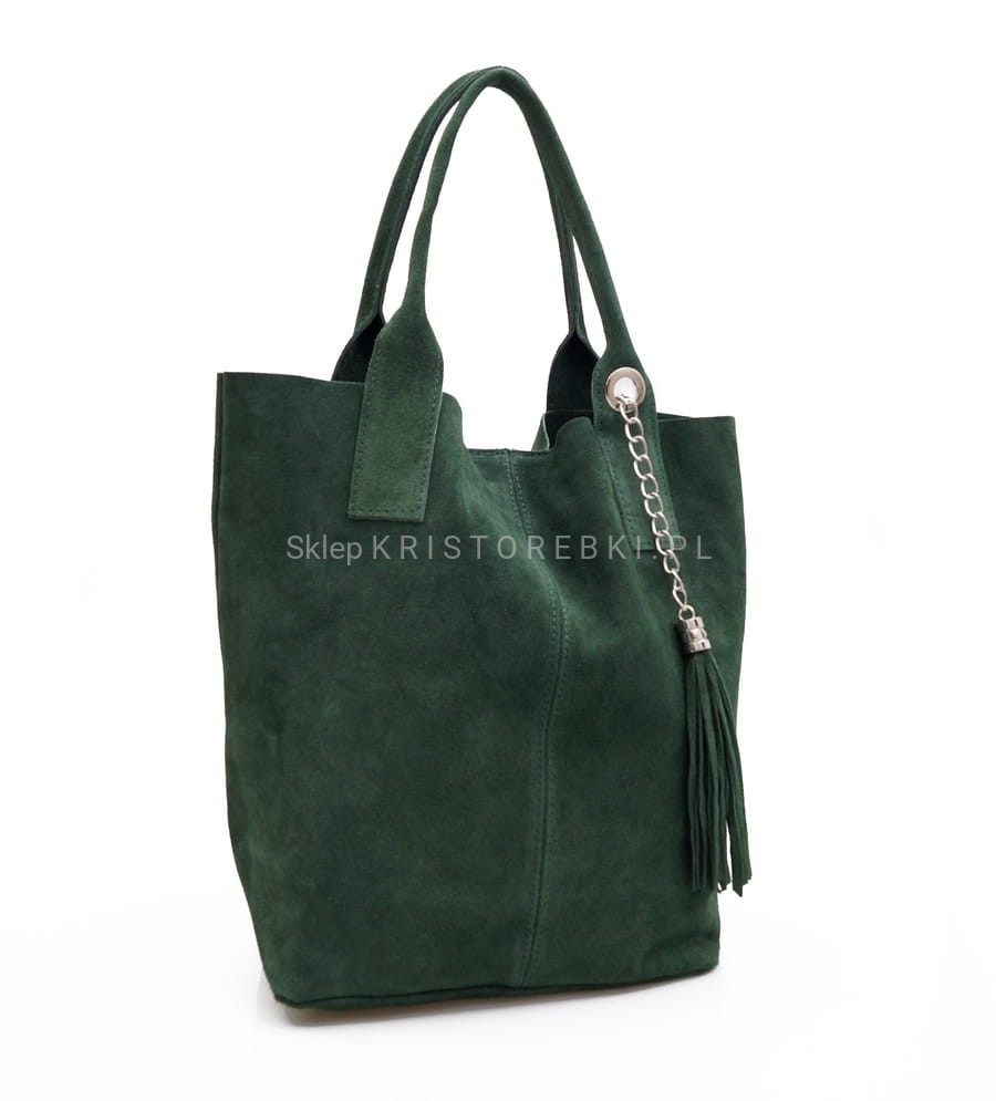 Włoska skórzana torebka damska typu shopper znanej i cenionej marki VERA PELLE ITALY w kolorze CIEMNEJ BUTELKOWEJ ZIELENI. Wykonana została bardzo starannie z dbałością o najmniejsze szczegóły z najwyższej jakości zamszowej skóry naturalnej oraz dostępna jest w wyjątkowo szerokiej kolorystyce. Torebka posiada w środku solidną podszewkę oraz zamykana jest na suwak. Z przodu ozdobiona jest wiszącym frędzelkiem oraz dodatkowo posiada w zestawie saszetkę zamykaną na suwak, w której możesz schować np. dokumenty. W środku jest bardzo pojemna oraz dodatkowo posiada kieszonkę zamykaną na suwak. Torebka posiada długie uszy, dzięki czemu możesz ją wygodnie nosić i w ręku i na ramieniu a dzięki uniwersalnemu wyglądowi będzie pasowała do niemal każdej codziennej stylizacji. Jest bardzo wygodna i praktyczna dzięki czemu jest jednym z najlepiej sprzedających się modeli w naszej ofercie.