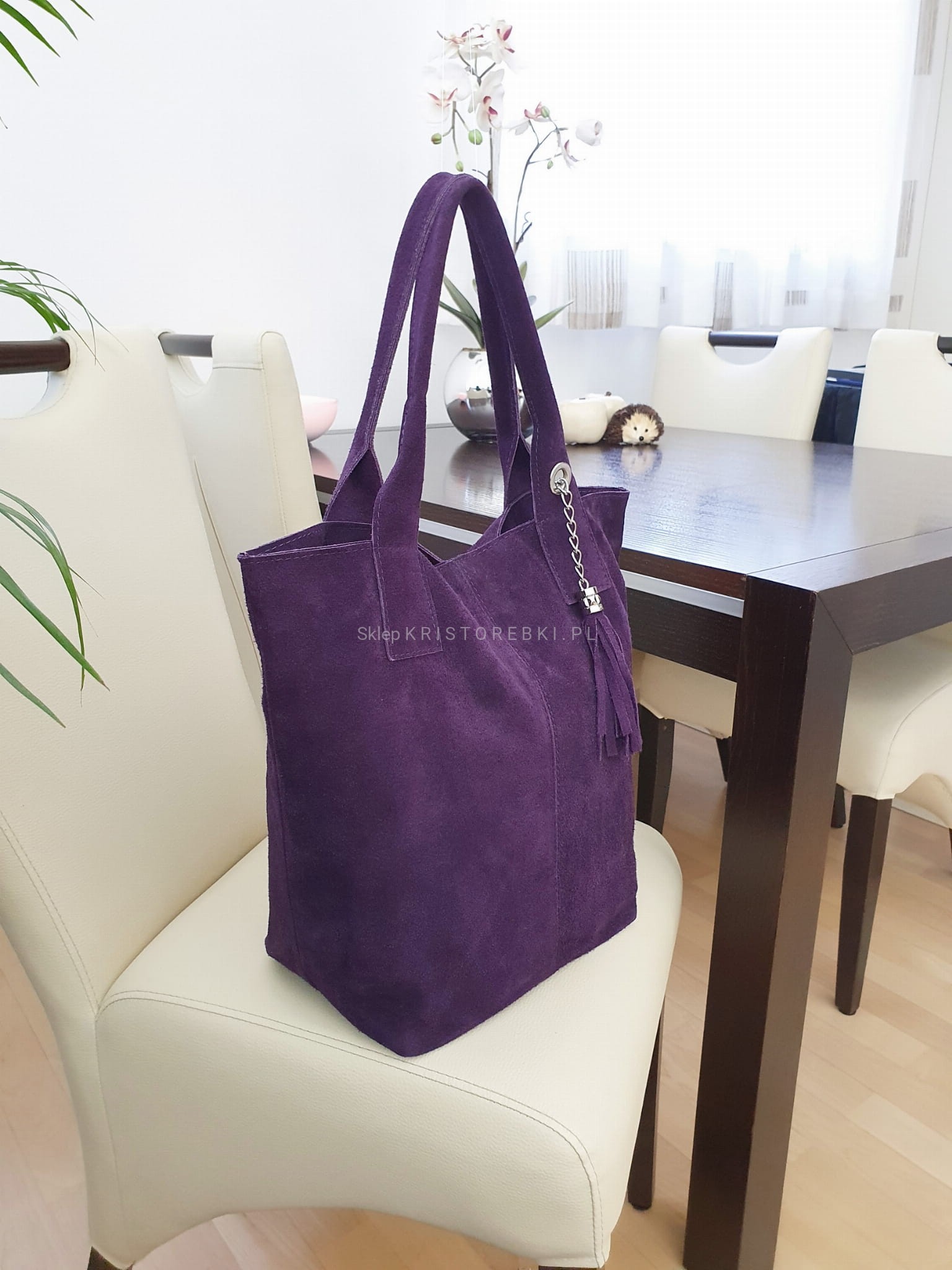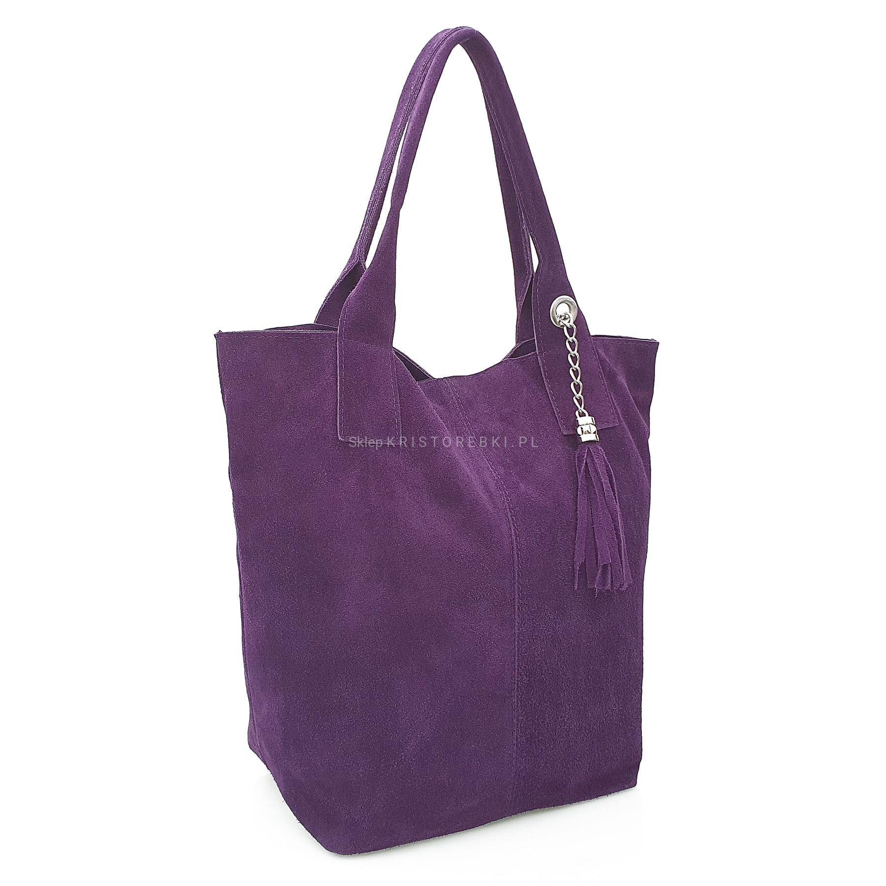 Włoska skórzana torebka damska typu shopper znanej i cenionej marki VERA PELLE ITALY w kolorze FIOLETOWYM. Wykonana została bardzo starannie z dbałością o najmniejsze szczegóły z najwyższej jakości zamszowej skóry naturalnej oraz dostępna jest w wyjątkowo szerokiej kolorystyce. Torebka posiada w środku solidną podszewkę oraz zamykana jest na suwak. Z przodu ozdobiona jest wiszącym frędzelkiem oraz dodatkowo posiada w zestawie saszetkę zamykaną na suwak, w której możesz schować np. dokumenty. W środku jest bardzo pojemna oraz dodatkowo posiada kieszonkę zamykaną na suwak. Torebka posiada długie uszy, dzięki czemu możesz ją wygodnie nosić i w ręku i na ramieniu a dzięki uniwersalnemu wyglądowi będzie pasowała do niemal każdej codziennej stylizacji. Jest bardzo wygodna i praktyczna dzięki czemu jest jednym z najlepiej sprzedających się modeli w naszej ofercie.