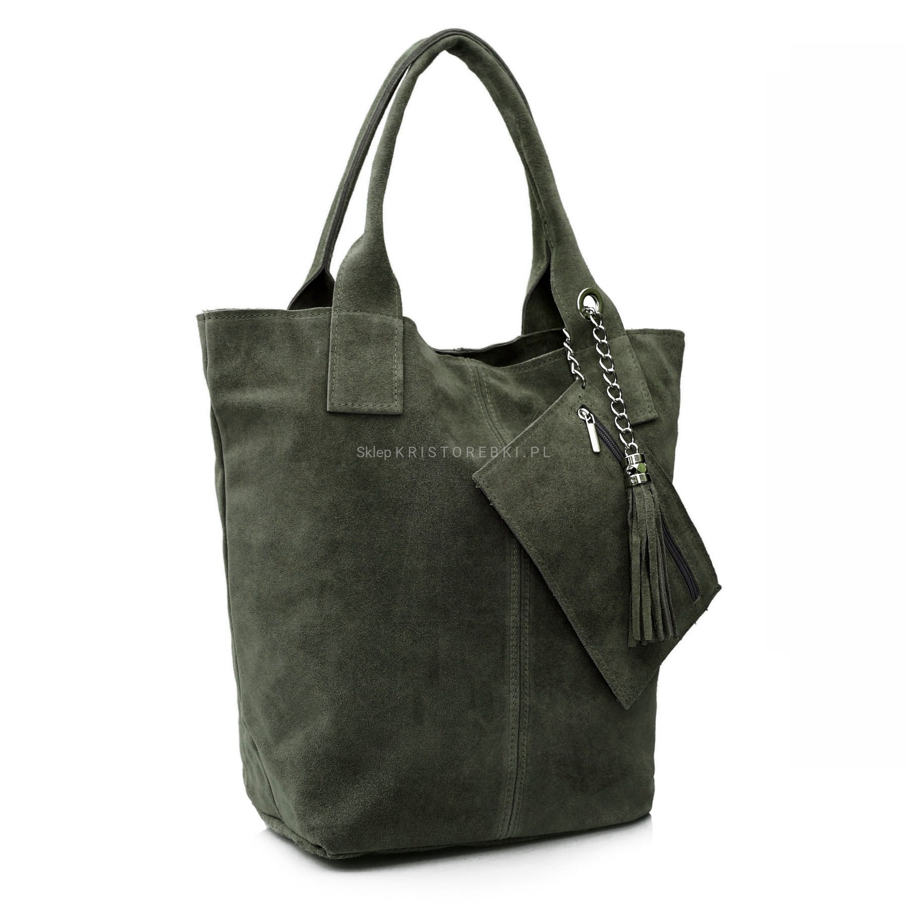 VERA PELLE torebka damska zamszowa worek shopper z suwakiem i saszetką V146 khaki