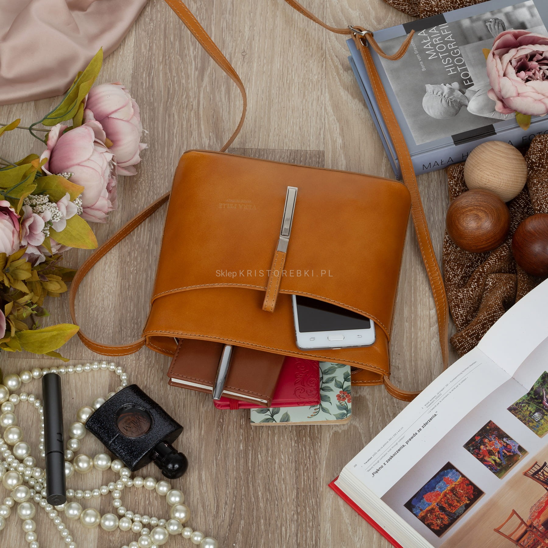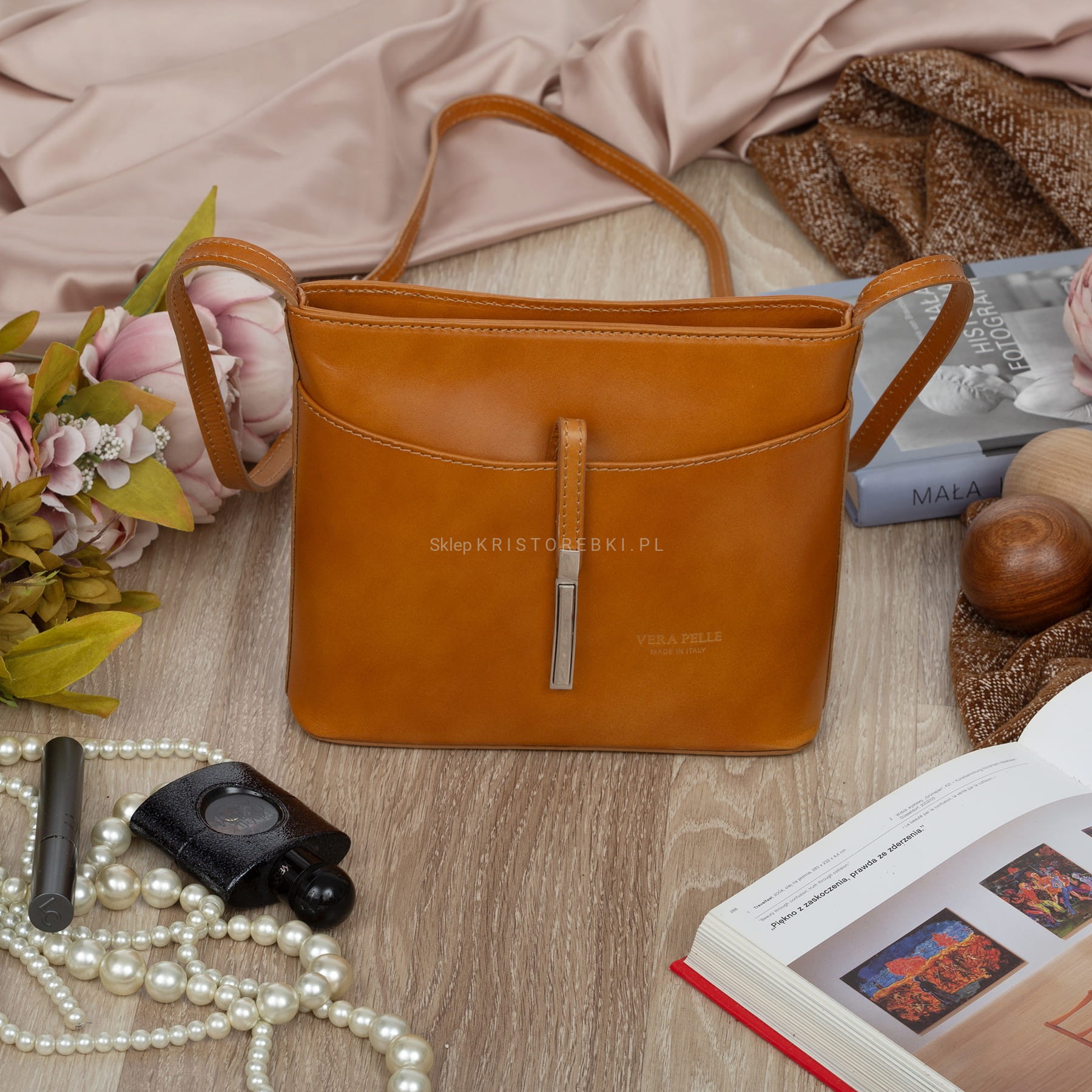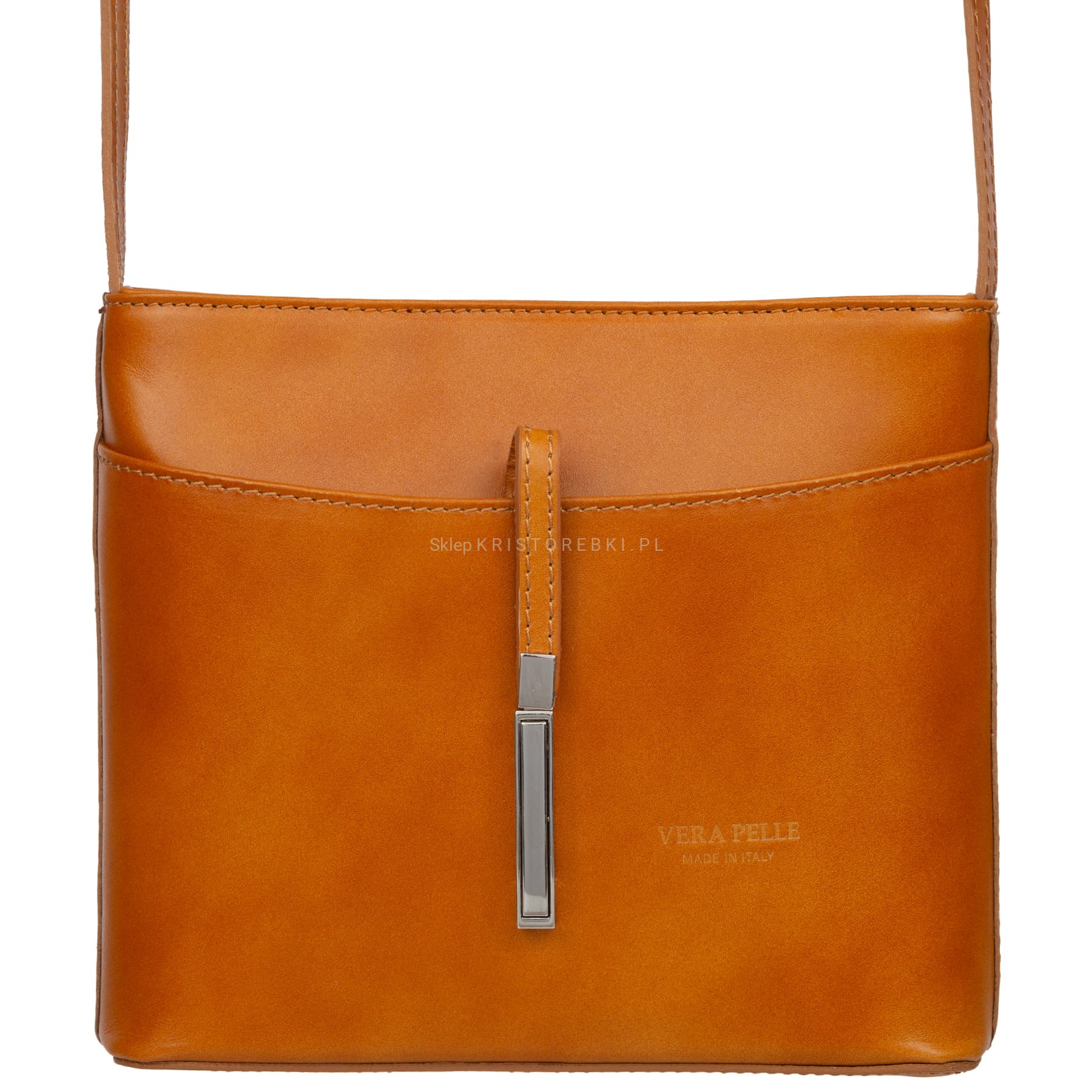 VERA PELLE torebka damska skórzana listonoszka z paskiem na ramię V159 camel