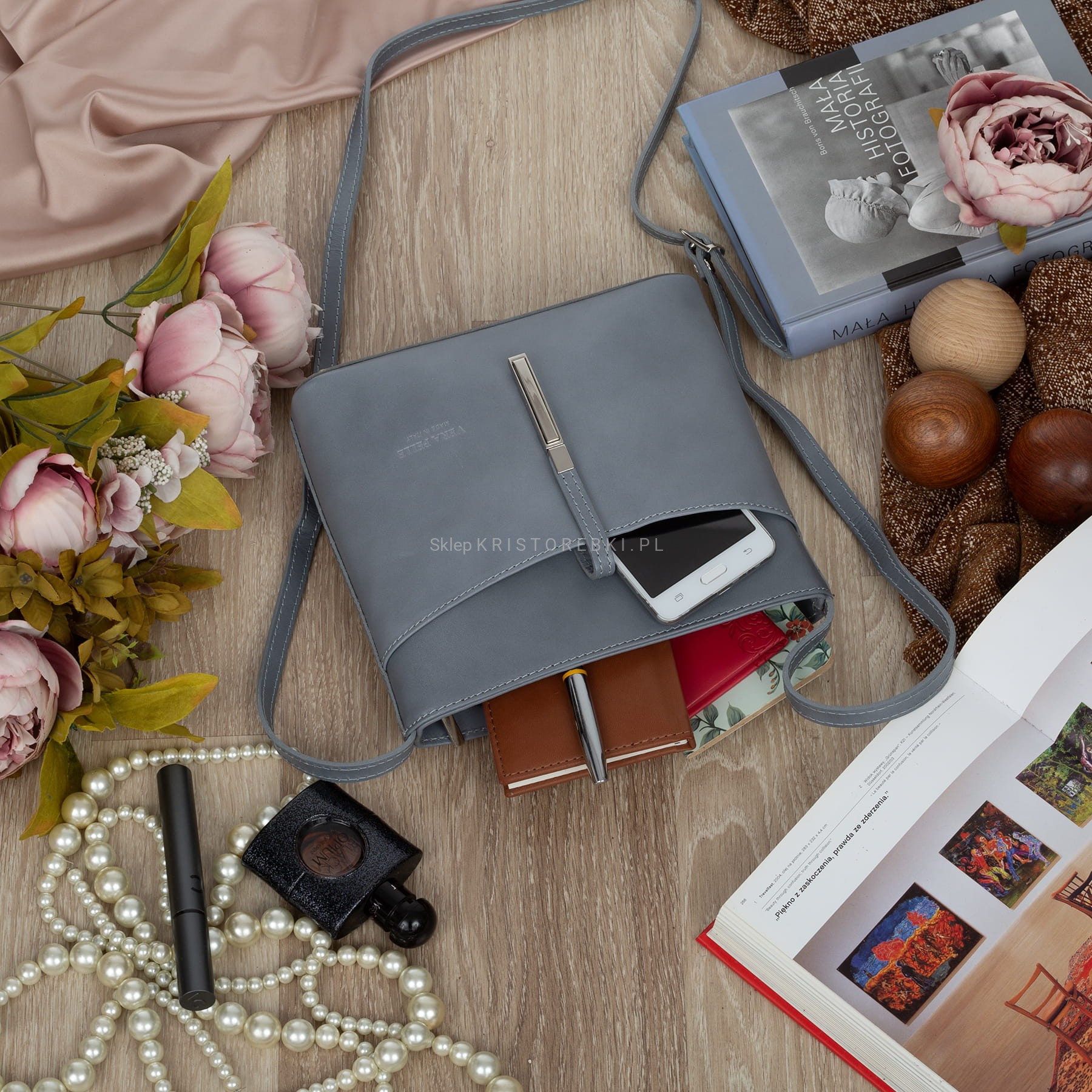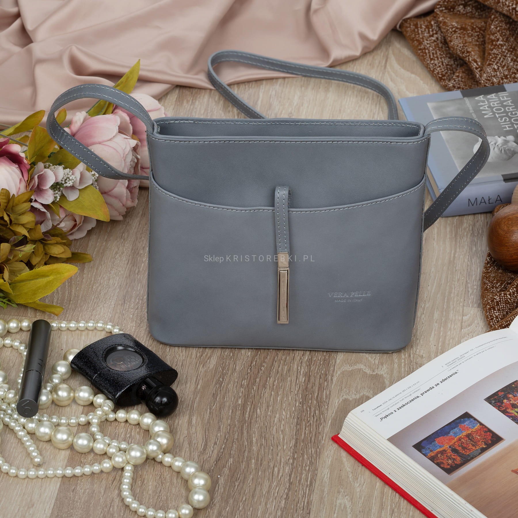 VERA PELLE torebka damska skórzana listonoszka z paskiem na ramię V159 szara