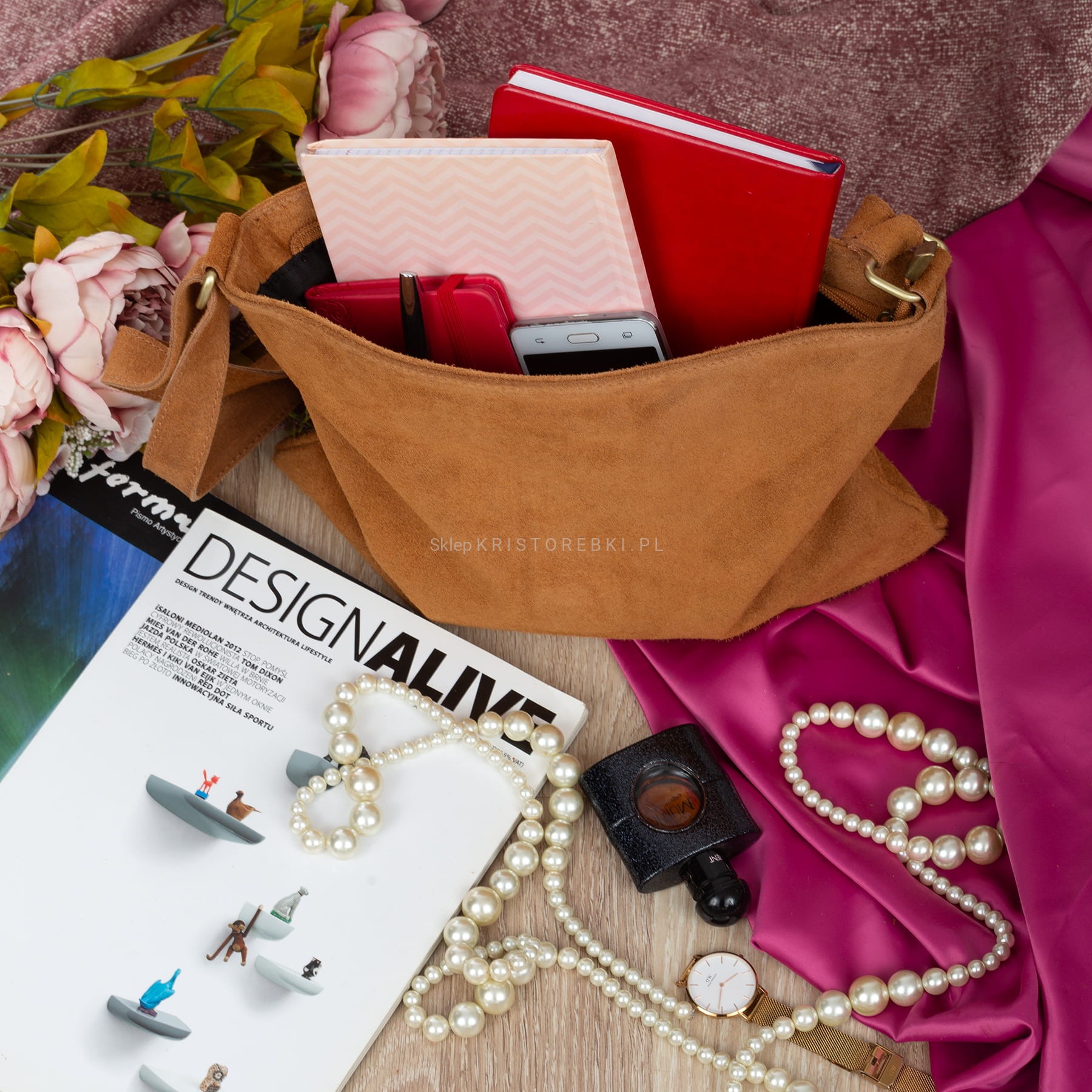 Torebka damska listonoszka marki VERA PELLE ITALY w kolorze CAMEL. Wykonana z najwyższej jakości zamszu naturalnego. Torebka posiada długi i regulowany pasek.