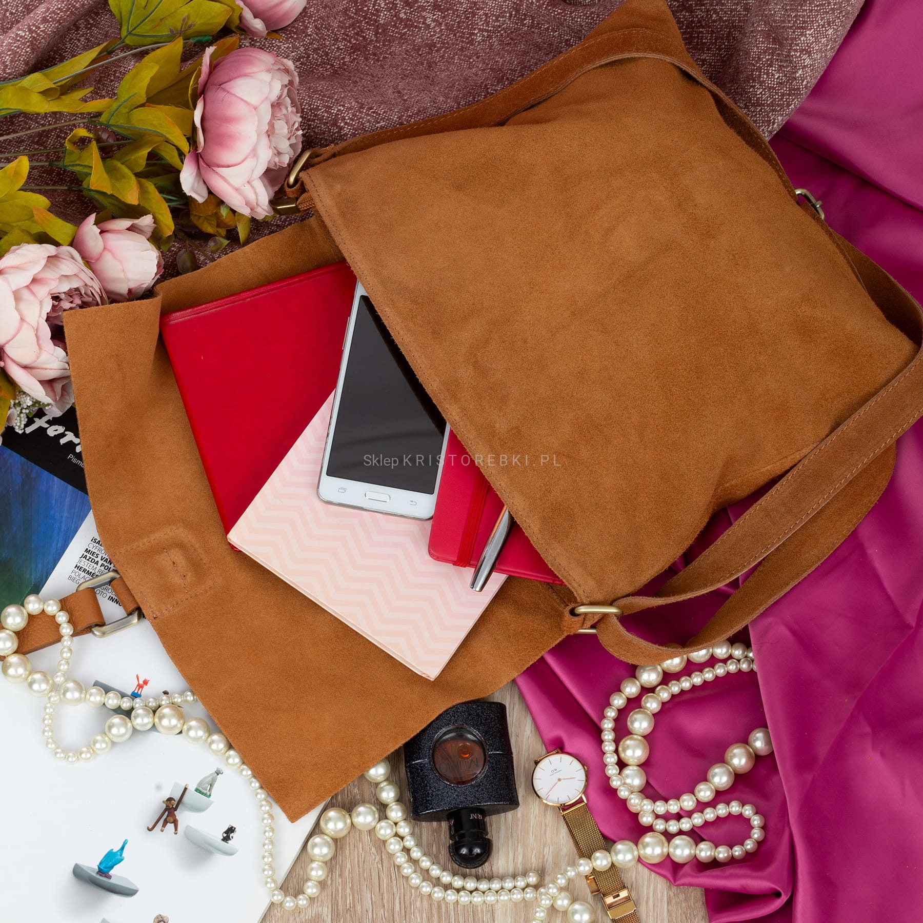VERA PELLE torebka damska zamszowa listonoszka duża z klapą i paskiem V312 camel