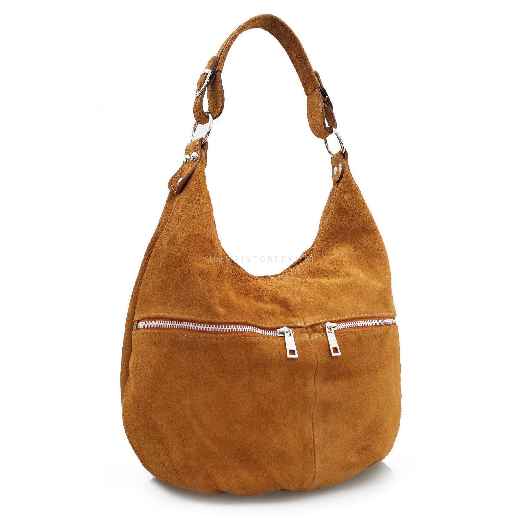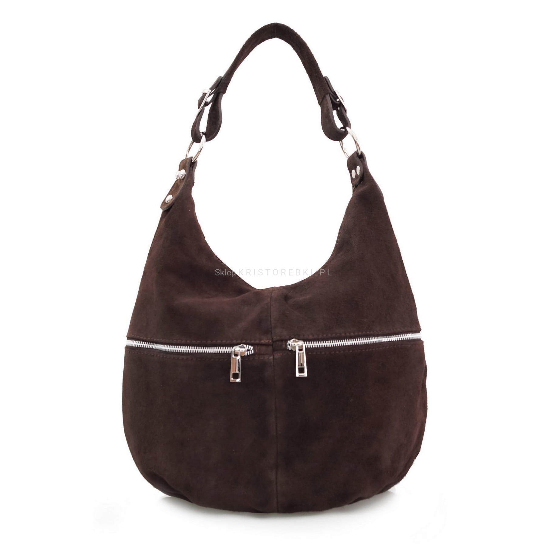 VERA PELLE torebka damska zamszowa worek z suwakami i paskiem na ramię V318 ciemna brązowa