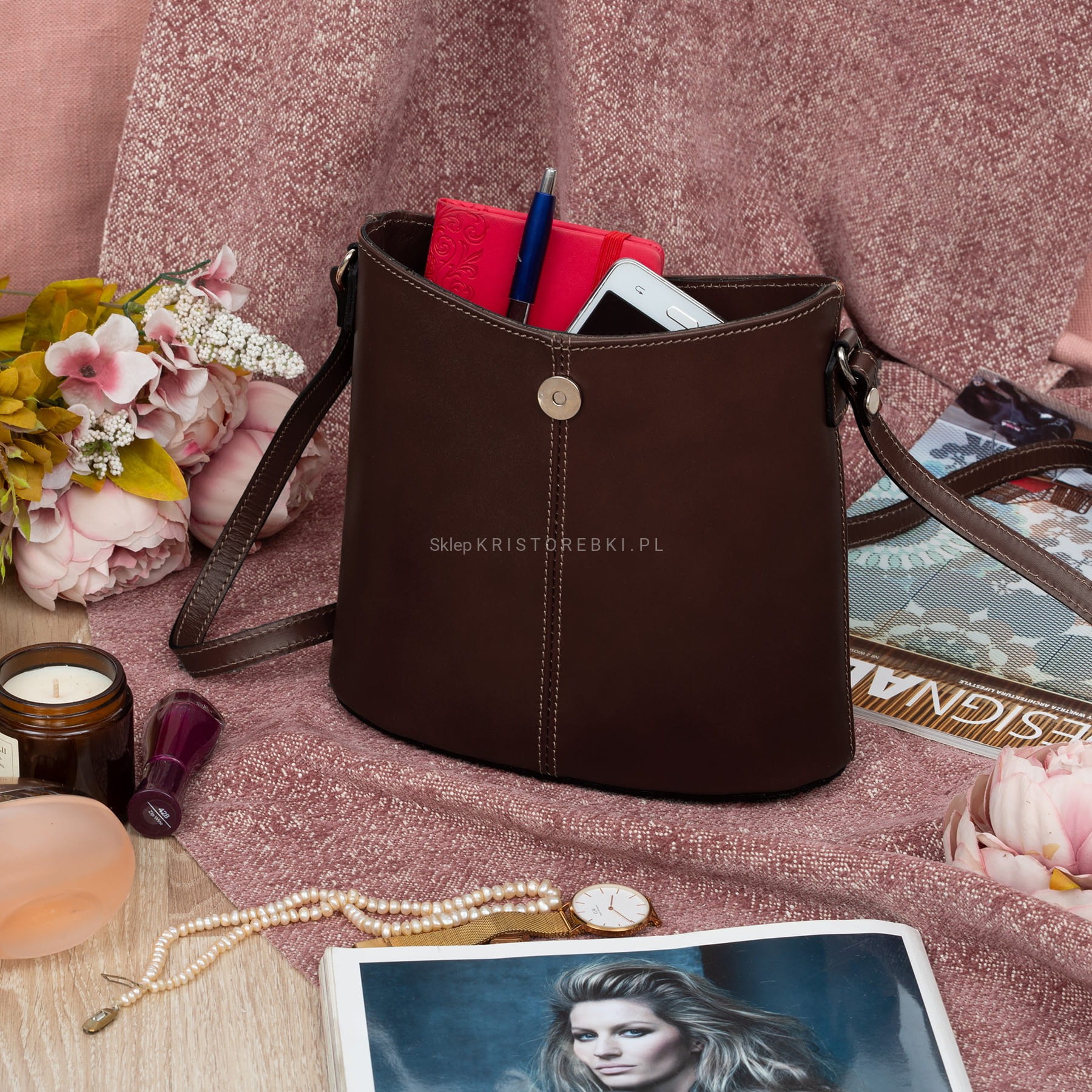 VERA PELLE torebka damska skórzana listonoszka z paskiem na ramię V372 ciemna brązowa