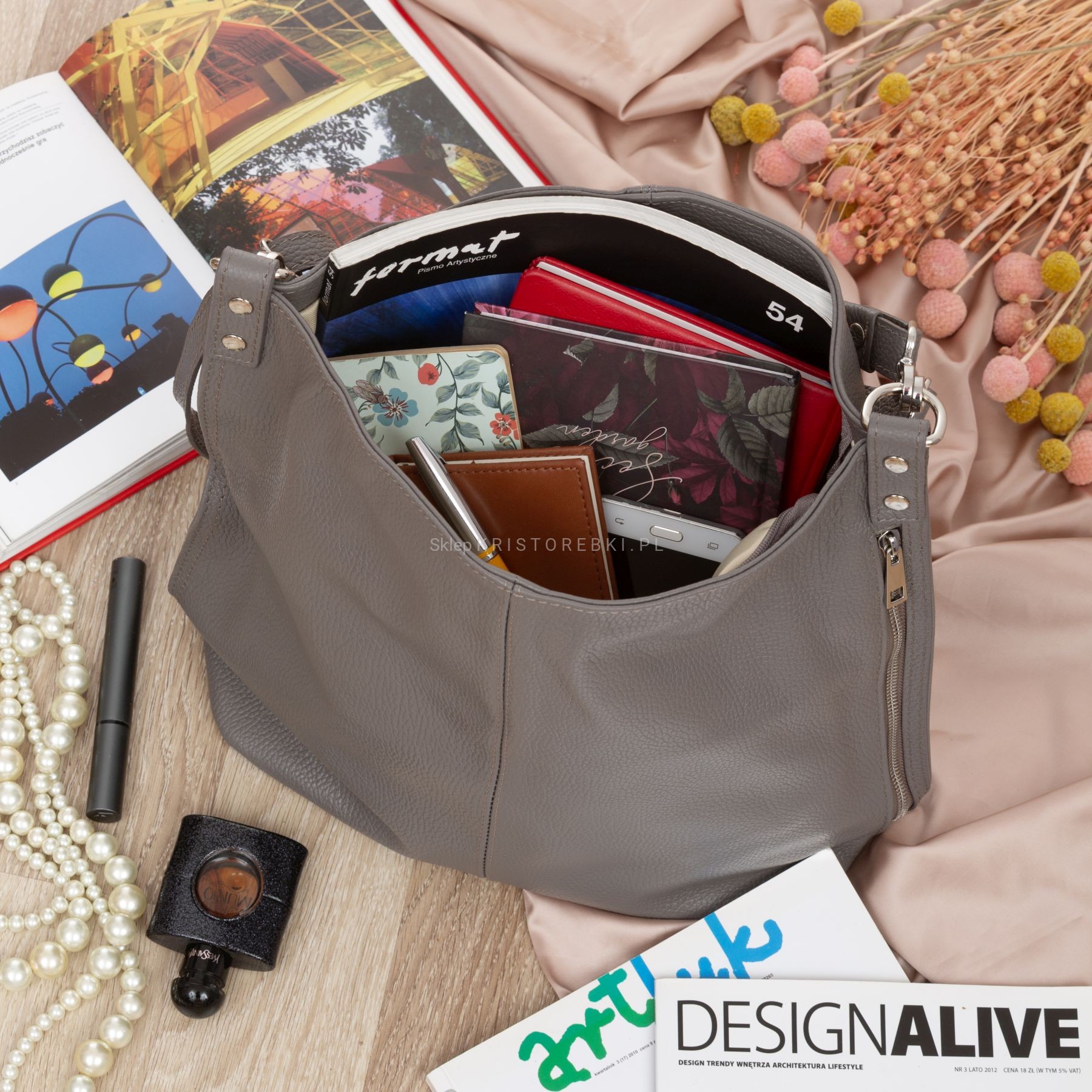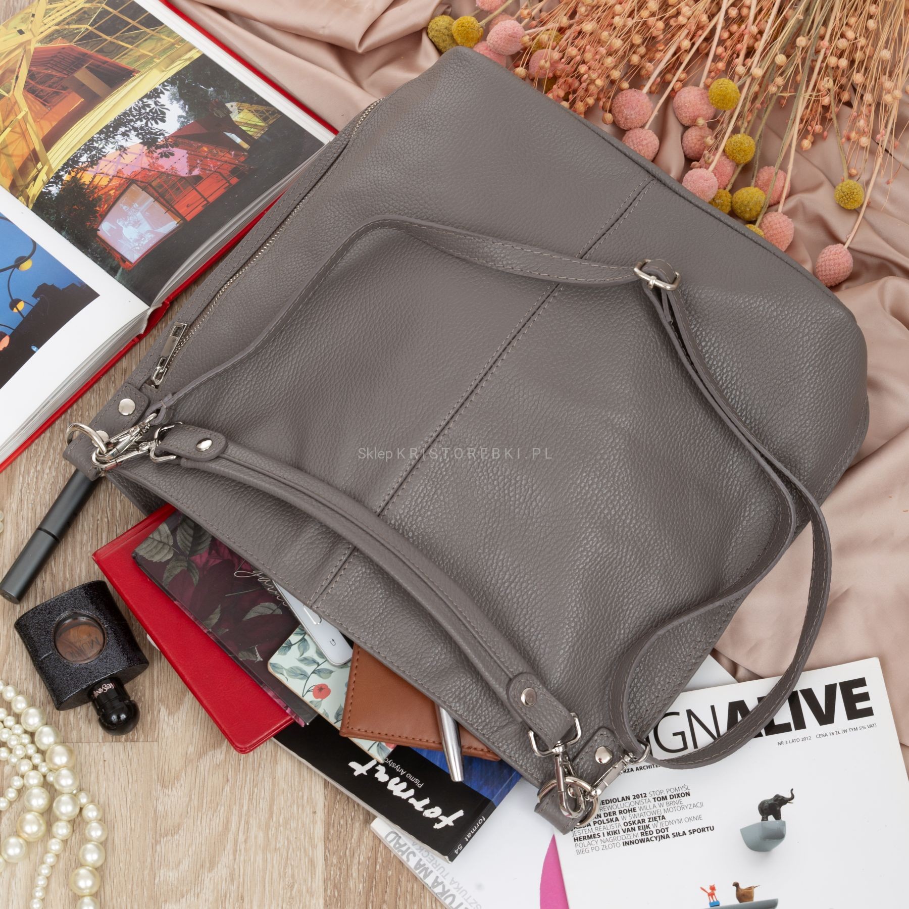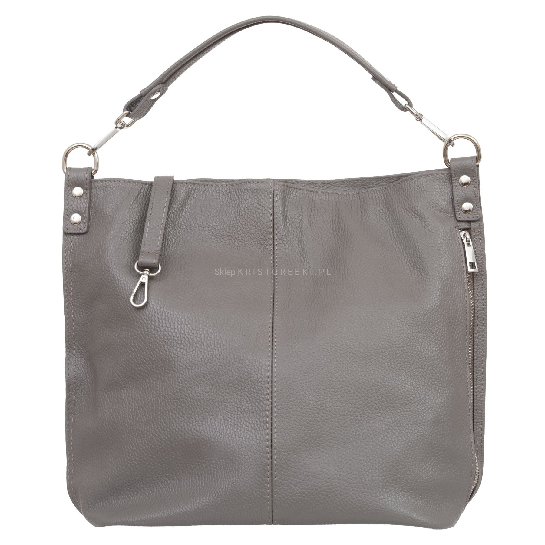Torebka damska typu worek, znanej i cenionej za jakość wykonania, włoskiej marki VERA PELLE ITELY w kolorze CIEPŁYM SZARYM. Wykonana została bardzo starannie i z dbałością o najmniejsze szczegóły z wysokogatunkowej skóry naturalnej. Torebka posiada długą i wygodną, odpinaną rączkę do noszenia w ręku i na ramieniu oraz odpinany i regulowany pasek, dzięki czemu można ją nosić na wiele sposobów. Z boku torebki znajduje się duża i funkcjonalna kieszeń zamykana na suwak. Dodatkowo z tyłu znajdziesz drugą, funkcjonalną kieszeń zamykaną na suwak. Środek zamykany jest na suwak oraz wykończony solidną podszewką. W środku znajdziesz dużą, zamykaną na suwak przegrodę przechodzącą przez środek. Dodatkowo na ściance bocznej znajduje się kolejna funkcjonalna kieszeń na suwak. Duża liczba kieszonek i skrytek pozwoli Ci bez trudu utrzymać w niej porządek a jakość wykonania sprawi, że będzie służyła przez długi okres czasu. Klasyczny i elegancki wzór torebki powoduje, że sprawdzi się w pracy, na co dzień a nawet na wyjścia okolicznościowe.