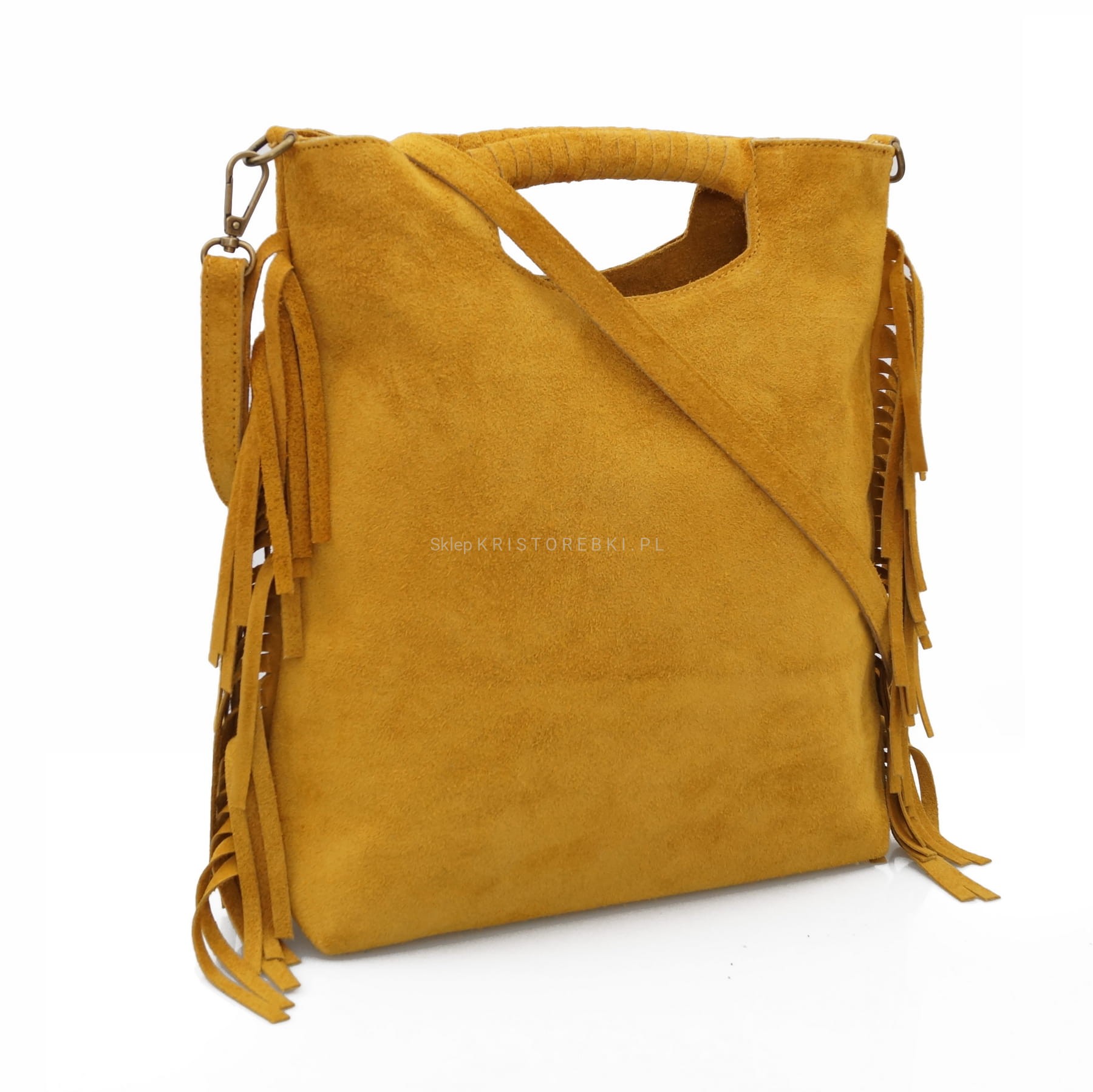 Torebka damska listonoszka znanej i cenionej na rynku europejskim marki VERA PELLE ITALY w kolorze MUSZTARDOWYM. Wyprodukowana została z najwyższej jakości, miękkiej, delikatnej w dotyku i pachnącej, zamszowej skóry naturalnej. Torebka zamykana jest na suwak w kolorze mosiężnym oraz przyozdobiona jest po bokach frędzlami. Posiada wygodne do noszenia rączki. Dodatkowo do torebki dołączony jest długi i regulowany pasek, dzięki czemu można ją nosić równie wygodnie na ramieniu. Środek wykończony jest wysokiej jakości podszewką. Dodatkowo w środku znajduje się praktyczna kieszonka zamykana na suwak.