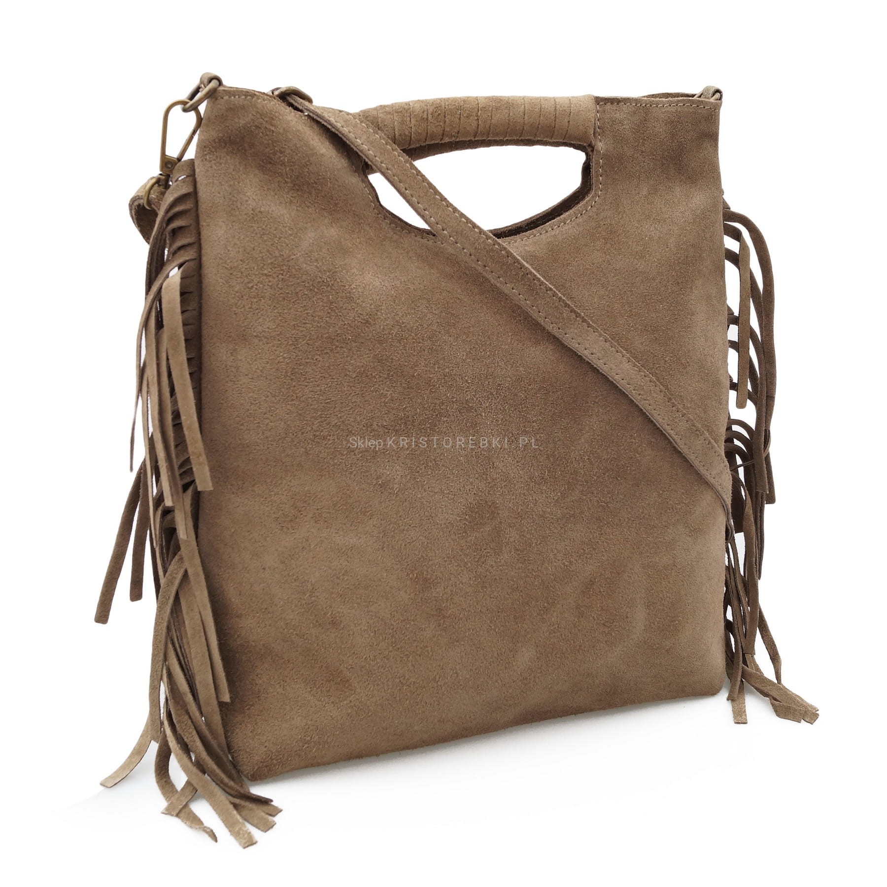 Torebka damska listonoszka znanej i cenionej na rynku europejskim marki VERA PELLE ITALY w kolorze TAUPE. Wyprodukowana została z najwyższej jakości, miękkiej, delikatnej w dotyku i pachnącej, zamszowej skóry naturalnej. Torebka zamykana jest na suwak w kolorze mosiężnym oraz przyozdobiona jest po bokach frędzlami. Posiada wygodne do noszenia rączki. Dodatkowo do torebki dołączony jest długi i regulowany pasek, dzięki czemu można ją nosić równie wygodnie na ramieniu. Środek wykończony jest wysokiej jakości podszewką. Dodatkowo w środku znajduje się praktyczna kieszonka zamykana na suwak.
