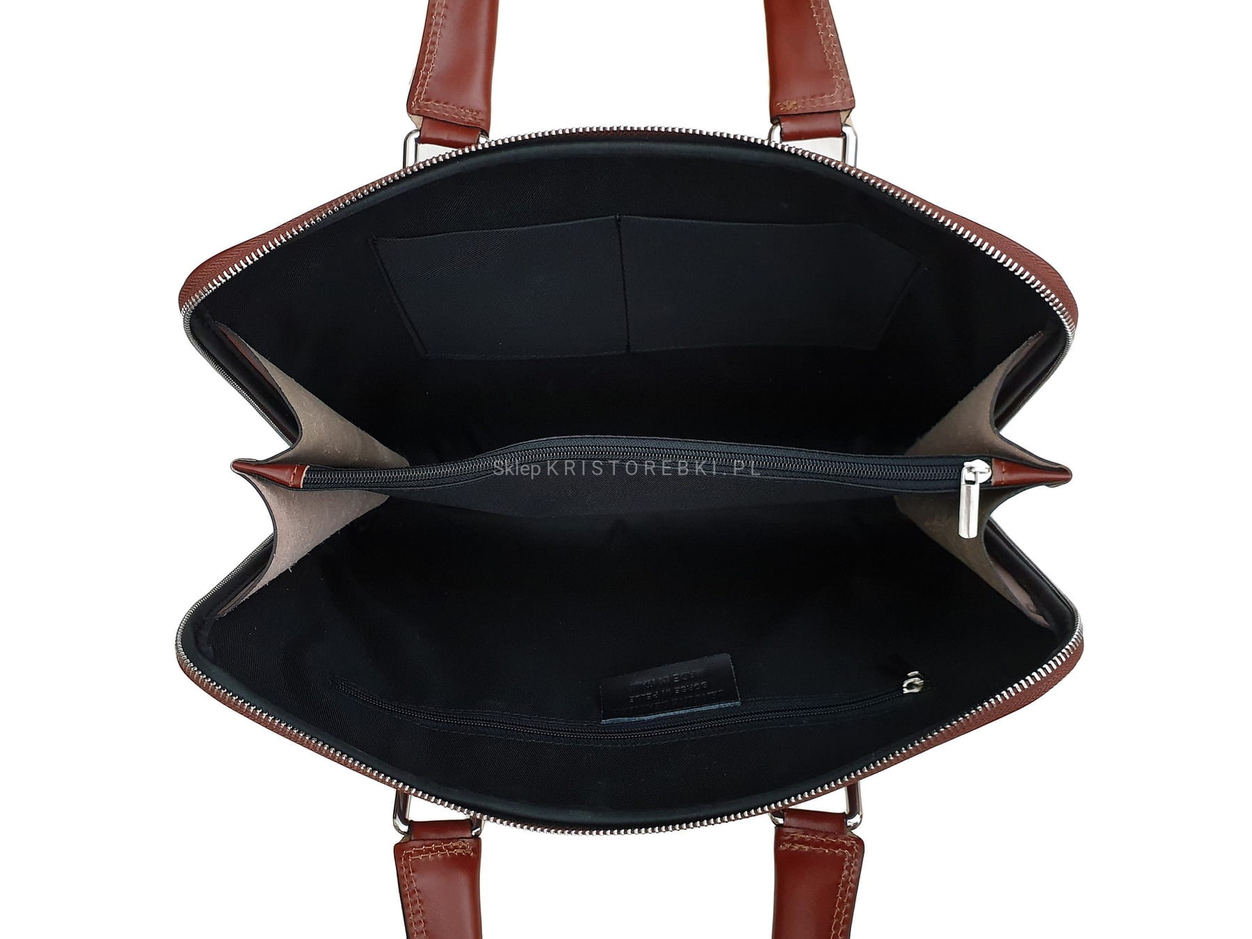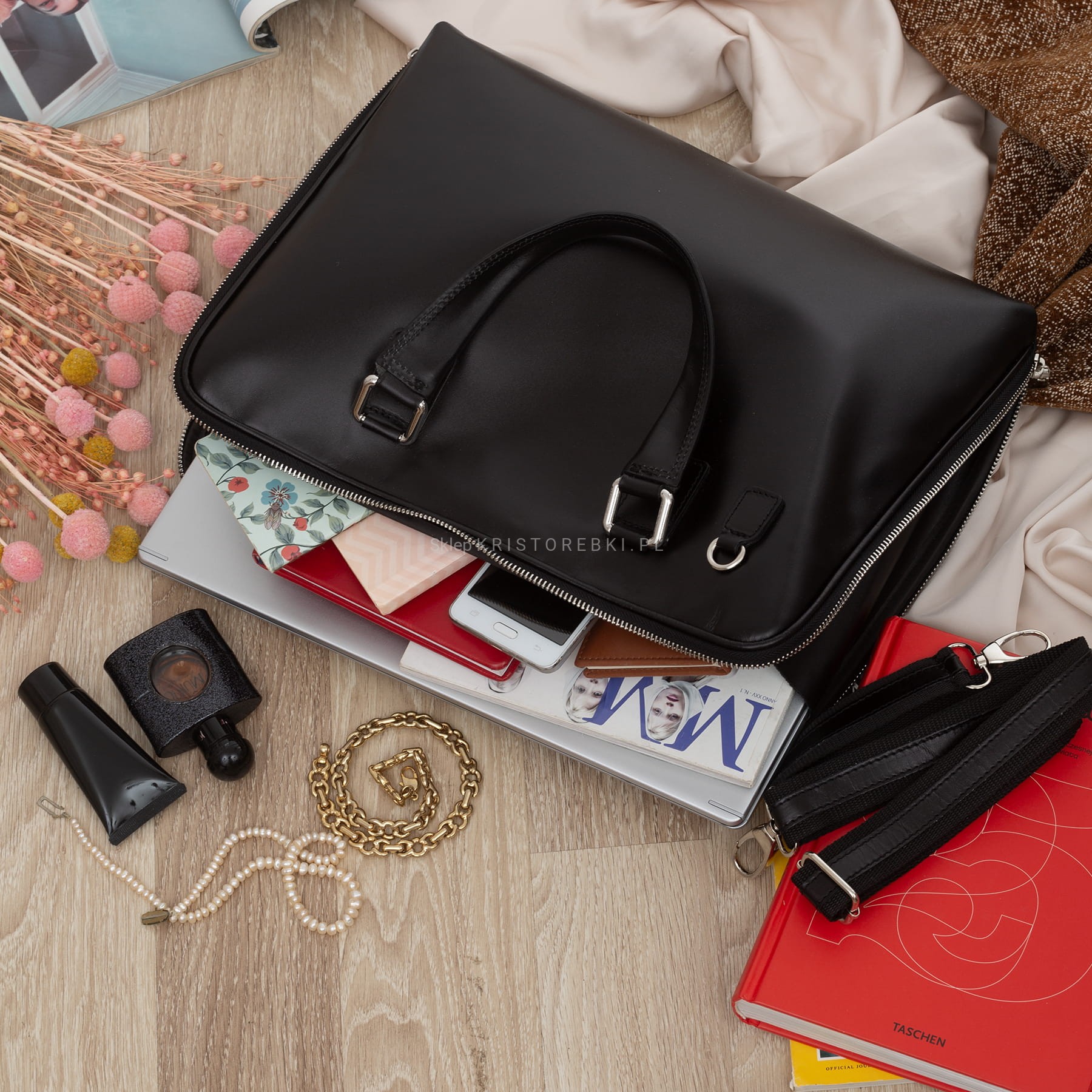 Torba skórzana w kształcie teczki, cenionej za jakość wykonania, włoskiej marki VERA PELLE ITALY w kolorze CZARNYM. Wykonana została ze skóry naturalnej licowej z dbałością o najdrobniejsze szczegóły. Dzięki dużym wymiarom bez trudu pomieści format A4, laptopa czy tablet. Torba posiada długie i praktyczne rączki do noszenia w ręku. Dołączony do torby długi i regulowany pasek pozwala ją nosić również wygodnie na ramieniu. Torba zamykana jest na suwak i posiada okucia w kolorze srebrnym. Środek torby wykończony jest solidną podszewką. W środku znajdują się dwie komory przedzielone przegrodą zamykaną na suwak. Dodatkowo w środku na jednej ze ścianek znajduje się praktyczna kieszonka zamykana na suwak a z drugiej strony znajdziesz dwie mniejsze otwarte kieszonki na dokumenty, drobiazgi lub telefon. Torba idealnie sprawdzi się w pracy i na spotkania biznesowe.