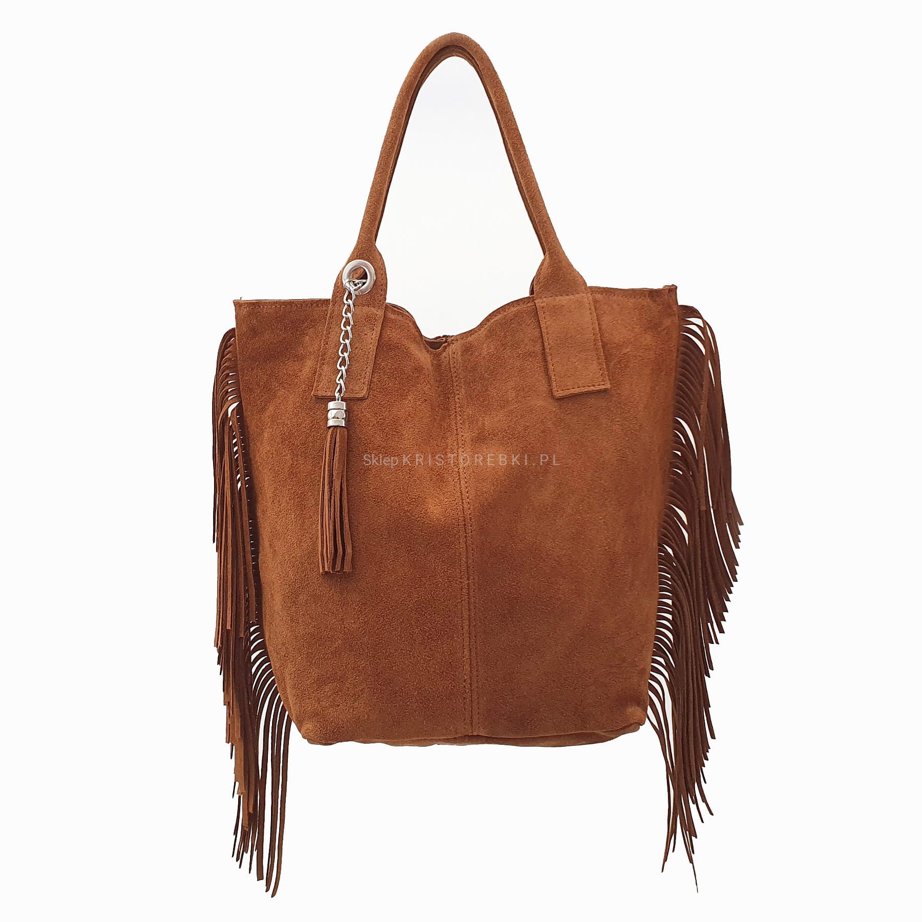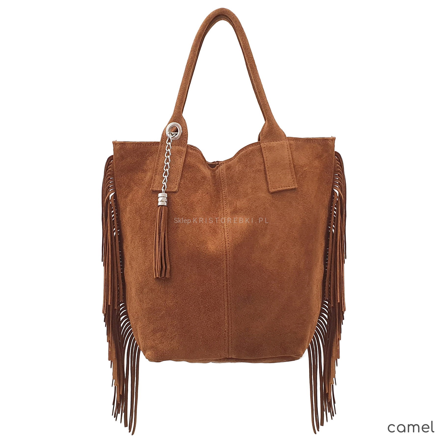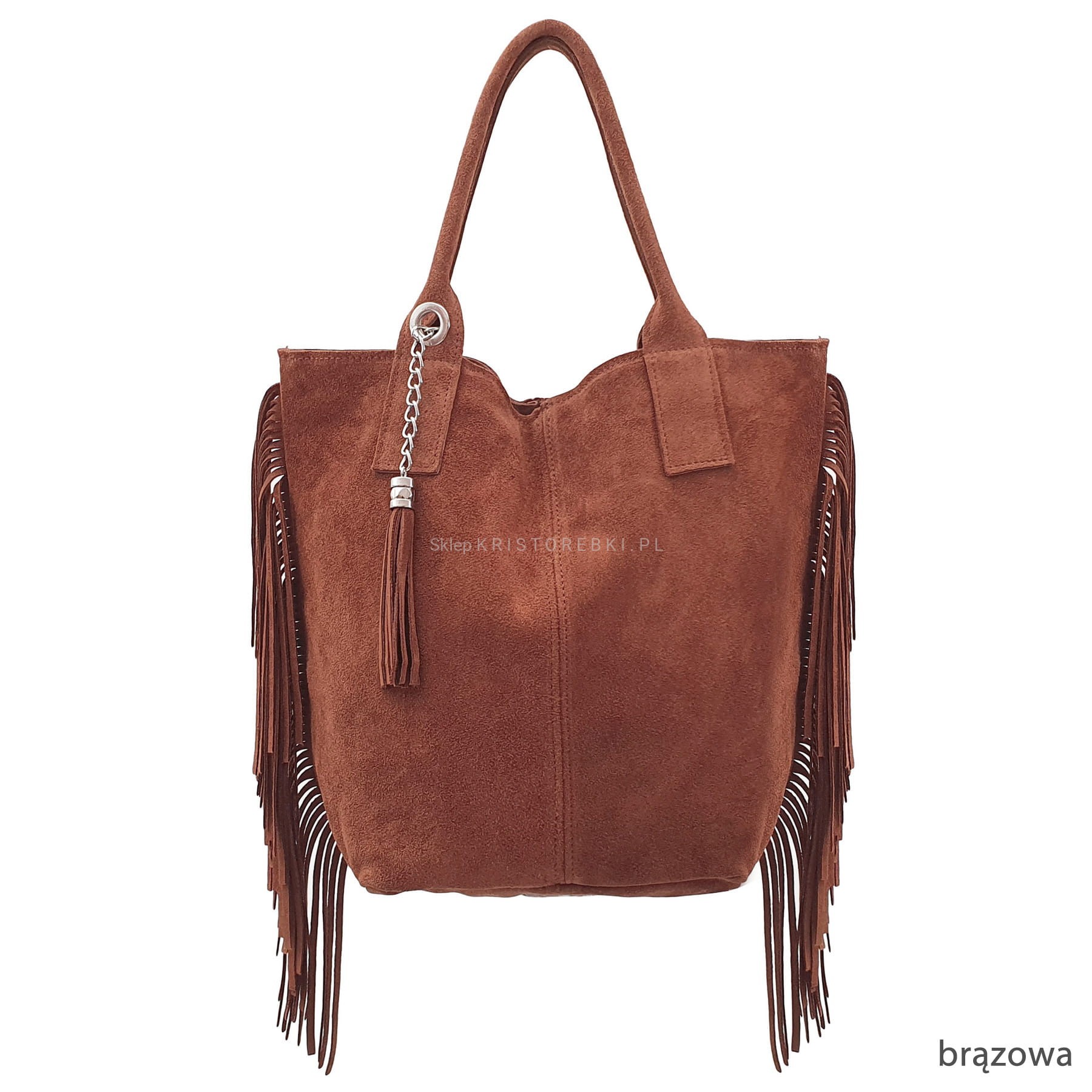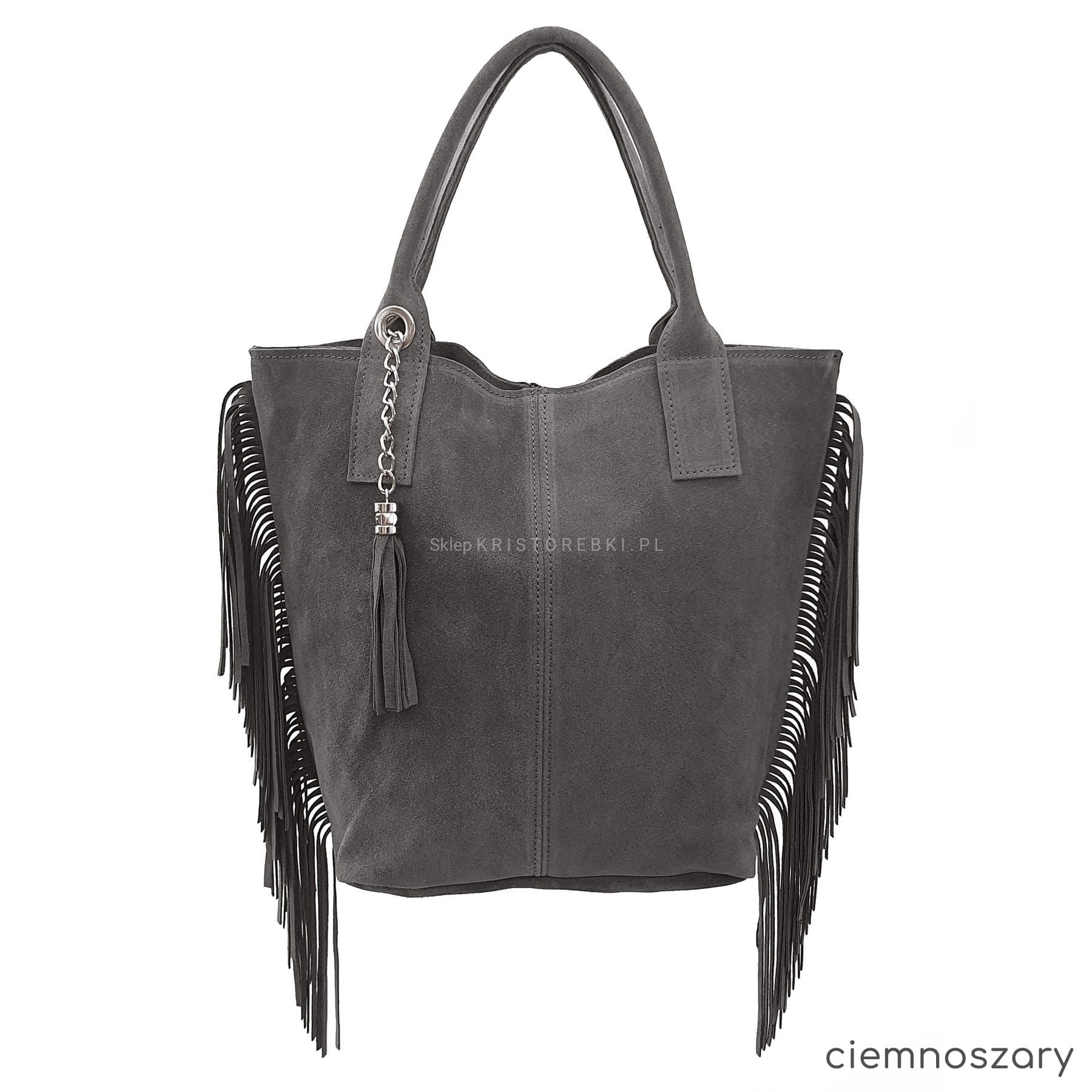 Włoska skórzana torebka damska typu shopper/worek od VERA PELLE ITALY. Wykonana została bardzo starannie z wysokiej jakości zamszowej skóry naturalnej. Torebka posiada wygodne uszy do noszenia w ręku a ich odpowiednia długość pozwala nosić ją również na ramieniu. Po bokach znajdują się długie i modne frędzle nadające jej niepowtarzalny styl boho. Środek zamykany jest na suwak oraz wykończony wysokiej jakości podszewką. Dodatkowo na ściance bocznej znajduje się praktyczna kieszonka zamykana na suwak. Do torebki dołączona jest również funkcjonalna saszetka na drobiazgi oraz ozdobny frędzelek - wisiorek. Torebka jest bardzo wygodna w codziennym użytkowaniu a jej wygląda sprawia, że będzie pasowała do większości codziennych stylizacji.