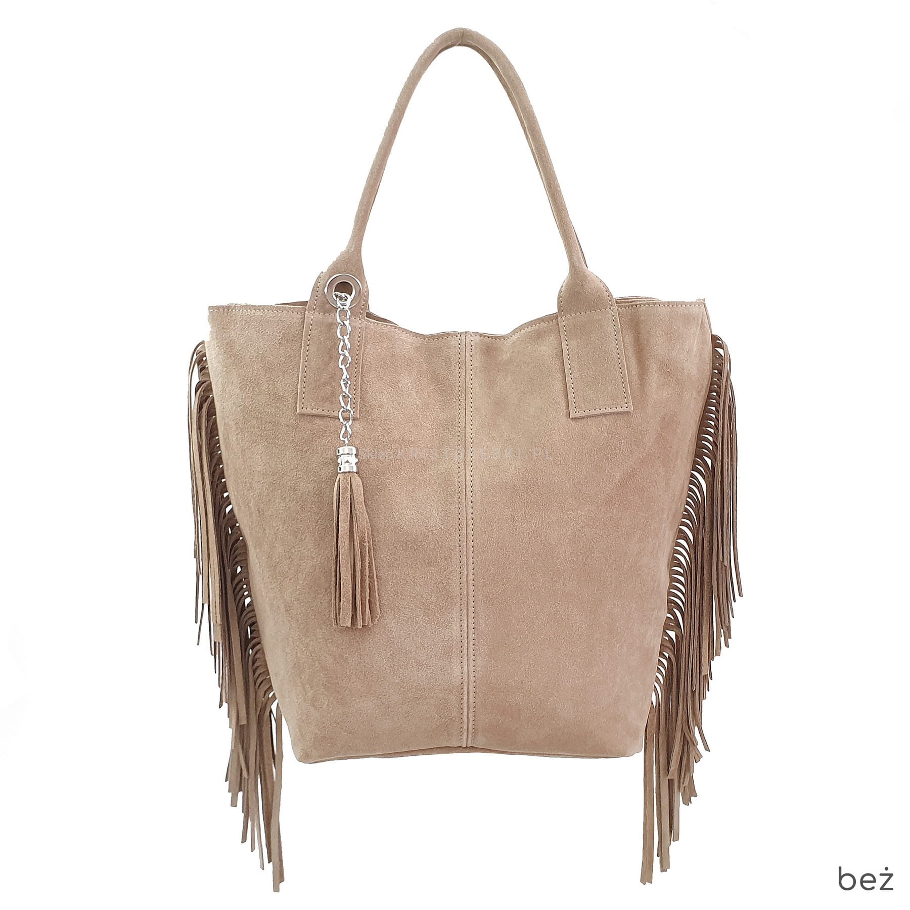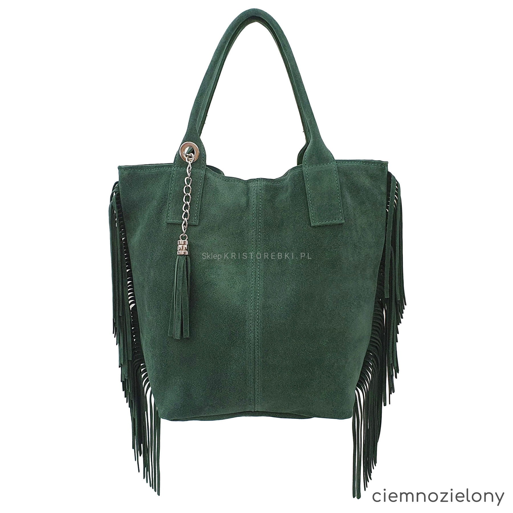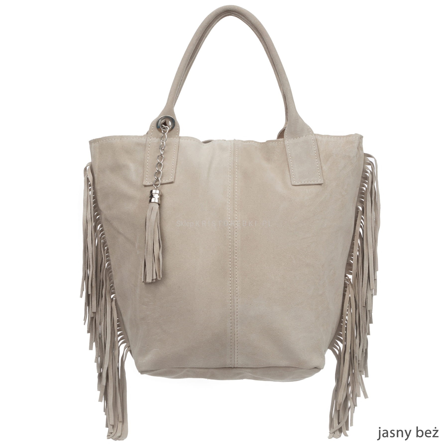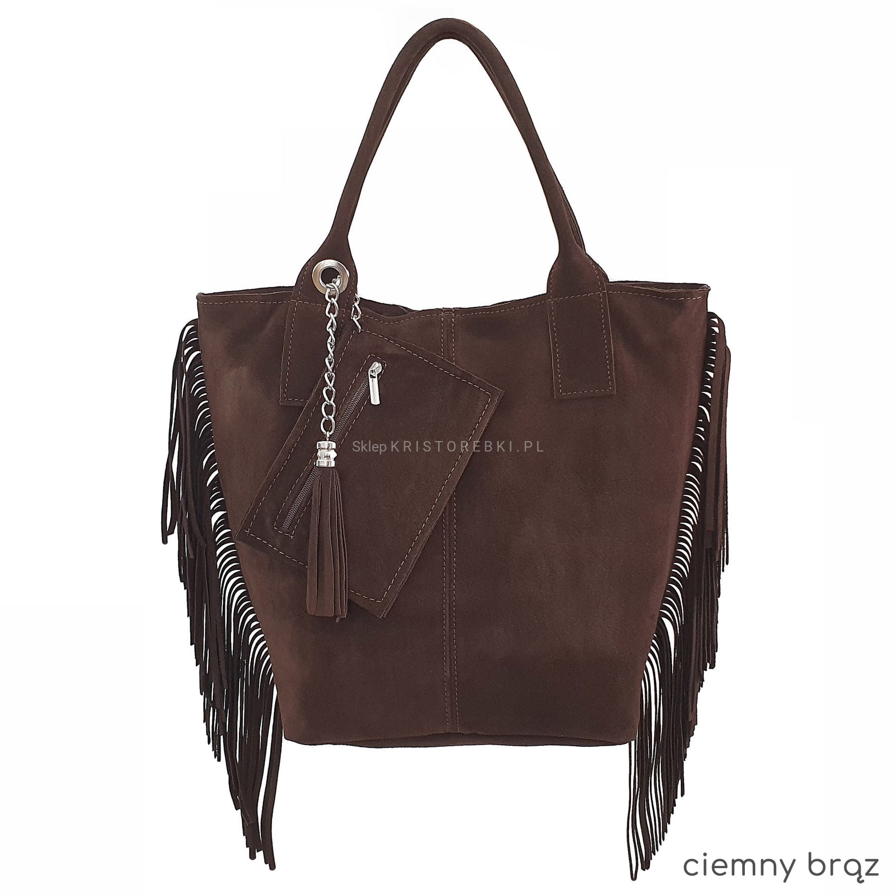 Włoska skórzana torebka damska typu shopper/worek od VERA PELLE ITALY. Wykonana została bardzo starannie z wysokiej jakości zamszowej skóry naturalnej. Torebka posiada wygodne uszy do noszenia w ręku a ich odpowiednia długość pozwala nosić ją również na ramieniu. Po bokach znajdują się długie i modne frędzle nadające jej niepowtarzalny styl boho. Środek zamykany jest na suwak oraz wykończony wysokiej jakości podszewką. Dodatkowo na ściance bocznej znajduje się praktyczna kieszonka zamykana na suwak. Do torebki dołączona jest również funkcjonalna saszetka na drobiazgi oraz ozdobny frędzelek - wisiorek. Torebka jest bardzo wygodna w codziennym użytkowaniu a jej wygląda sprawia, że będzie pasowała do większości codziennych stylizacji.