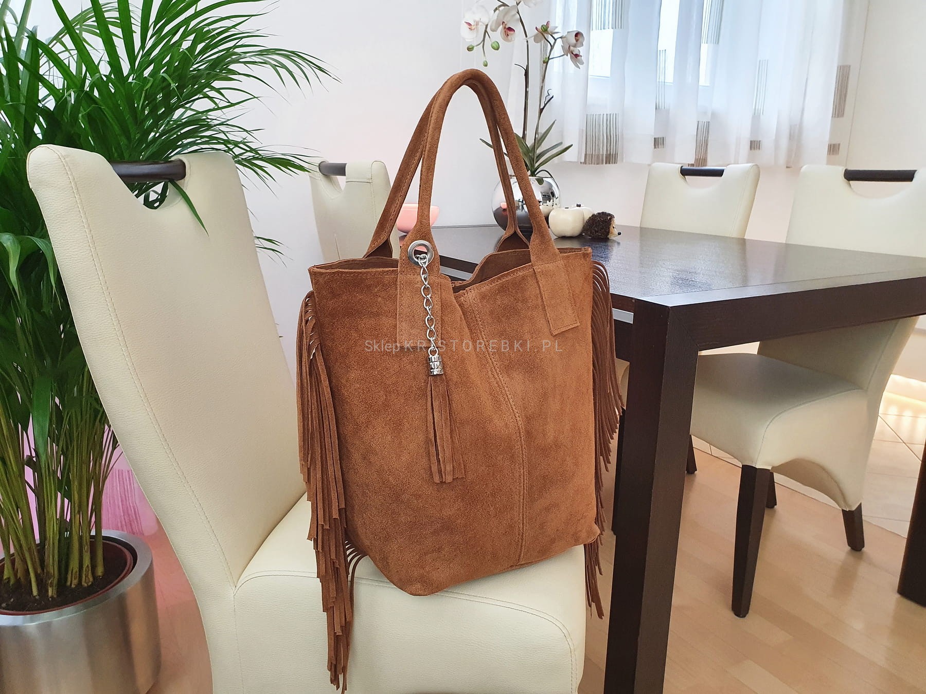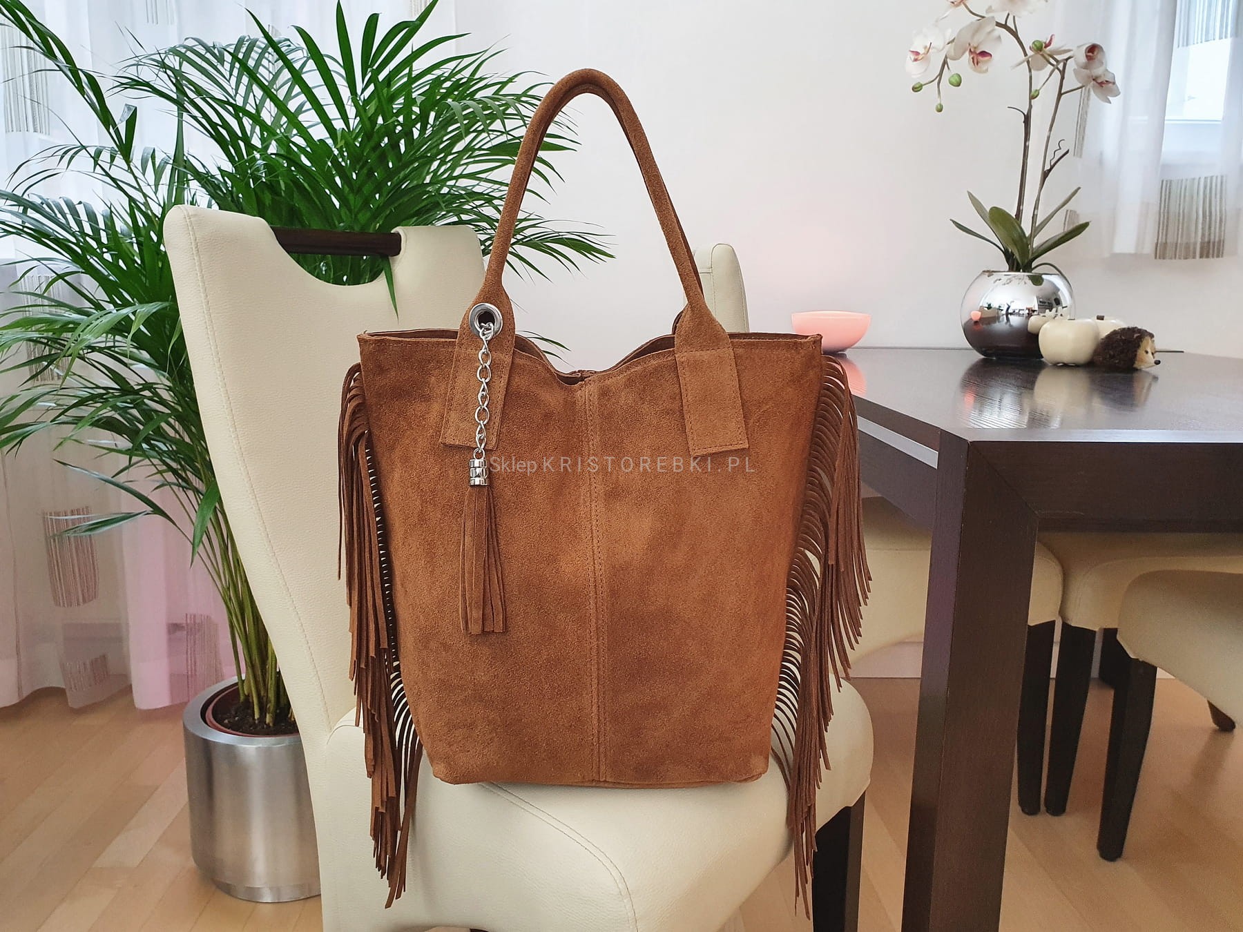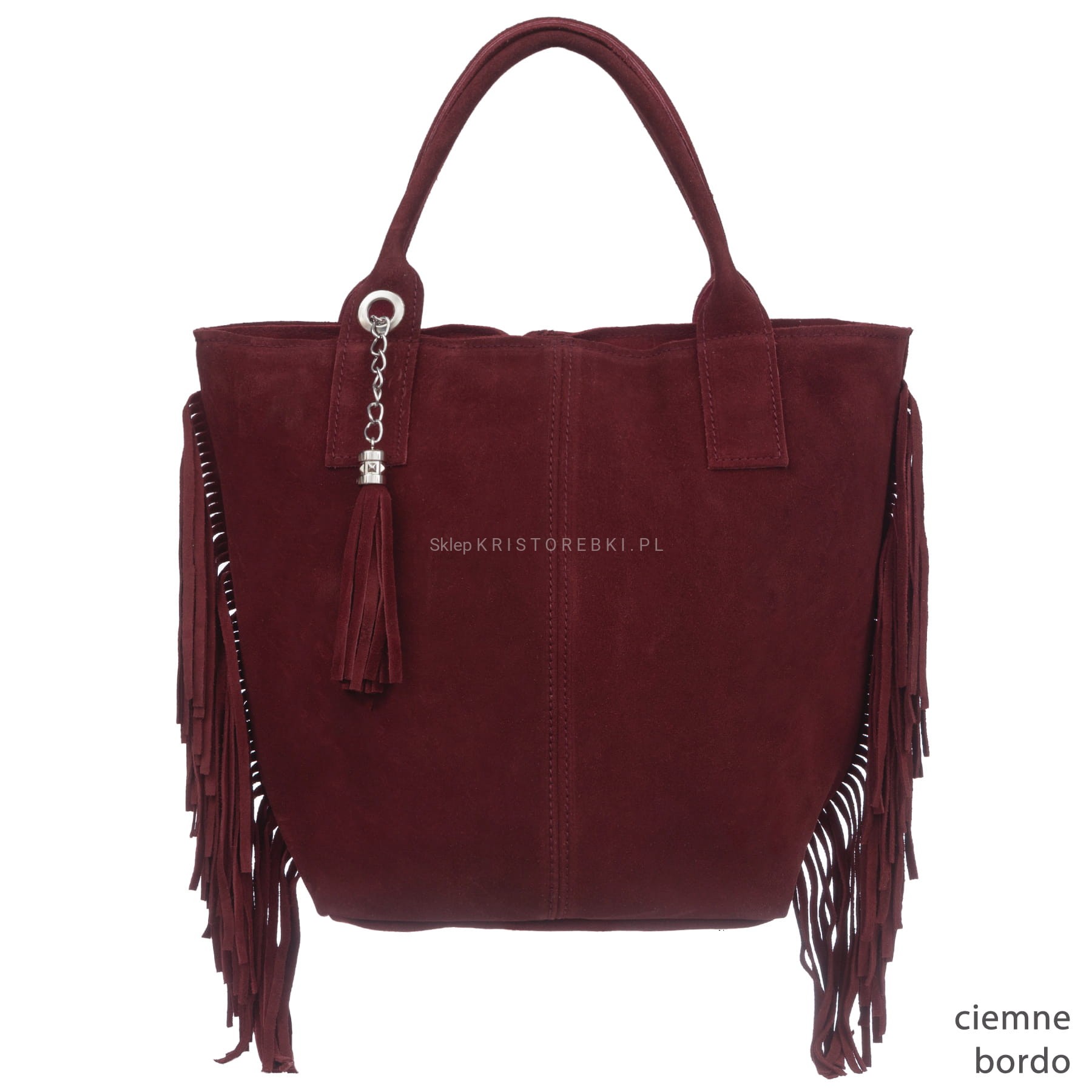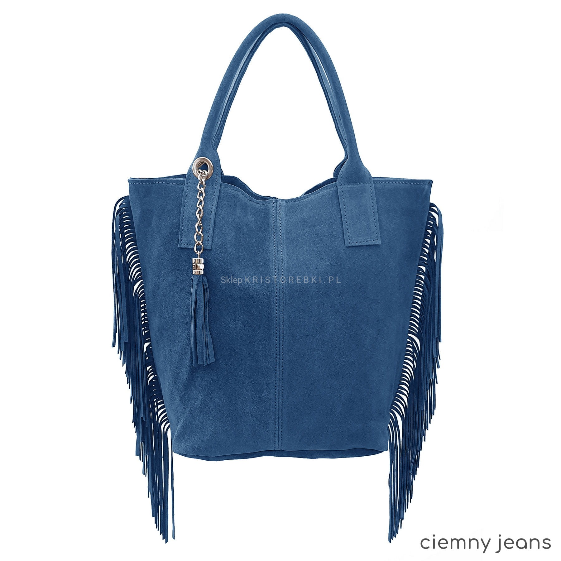 Włoska skórzana torebka damska typu shopper/worek od VERA PELLE ITALY. Wykonana została bardzo starannie z wysokiej jakości zamszowej skóry naturalnej. Torebka posiada wygodne uszy do noszenia w ręku a ich odpowiednia długość pozwala nosić ją również na ramieniu. Po bokach znajdują się długie i modne frędzle nadające jej niepowtarzalny styl boho. Środek zamykany jest na suwak oraz wykończony wysokiej jakości podszewką. Dodatkowo na ściance bocznej znajduje się praktyczna kieszonka zamykana na suwak. Do torebki dołączona jest również funkcjonalna saszetka na drobiazgi oraz ozdobny frędzelek - wisiorek. Torebka jest bardzo wygodna w codziennym użytkowaniu a jej wygląda sprawia, że będzie pasowała do większości codziennych stylizacji.