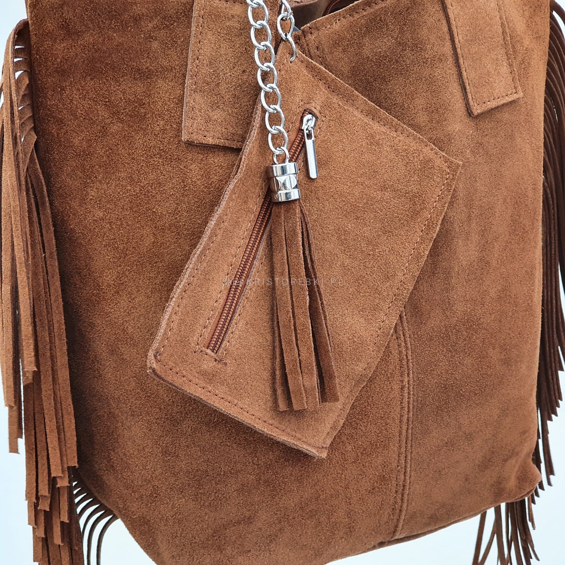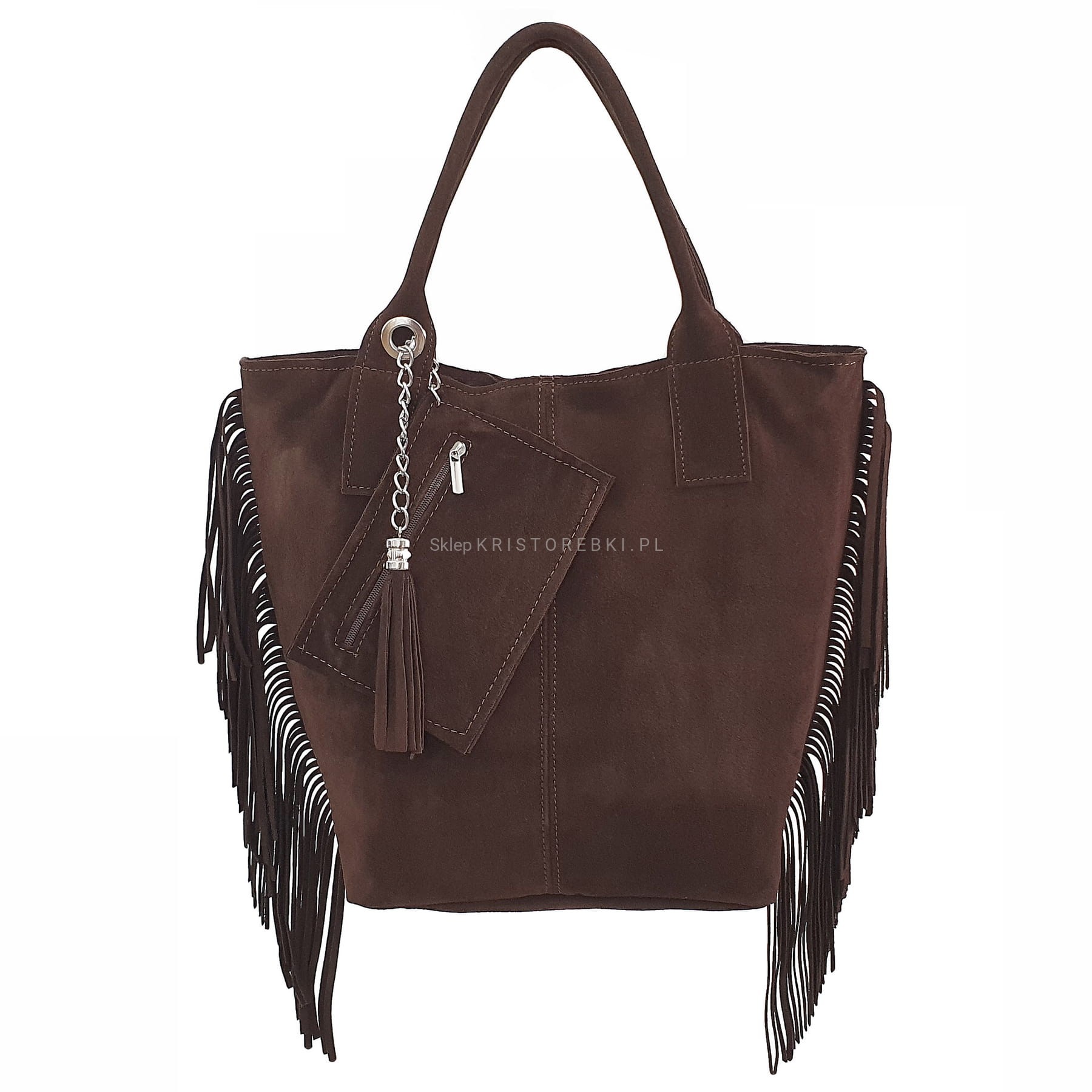 VERA PELLE torebka damska zamszowa shopper z frędzlami i saszetką V460 ciemna brązowa