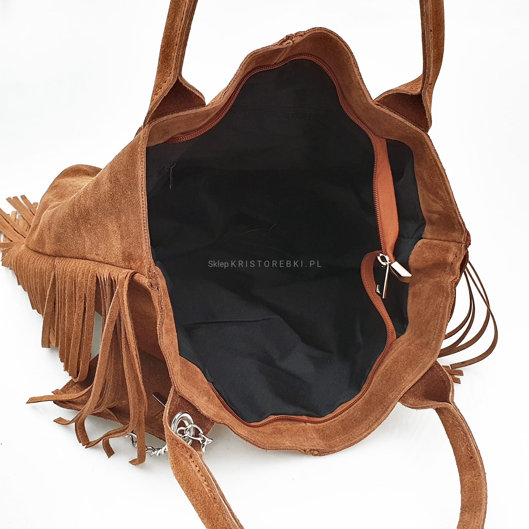 Włoska skórzana torebka damska typu shopper/worek od VERA PELLE ITALY w kolorze CIEMNEGO CZEKOLADOWEGO BRĄZU. Wykonana została bardzo starannie z wysokiej jakości zamszowej skóry naturalnej. Torebka posiada wygodne uszy do noszenia w ręku a ich odpowiednia długość pozwala nosić ją również na ramieniu. Po bokach znajdują się długie i modne frędzle nadające jej niepowtarzalny styl boho. Środek zamykany jest na suwak oraz wykończony wysokiej jakości podszewką. Dodatkowo na ściance bocznej znajduje się praktyczna kieszonka zamykana na suwak. Torebka jest bardzo wygodna w codziennym użytkowaniu a jej wygląda sprawia, że będzie pasowała do większości codziennych stylizacji.