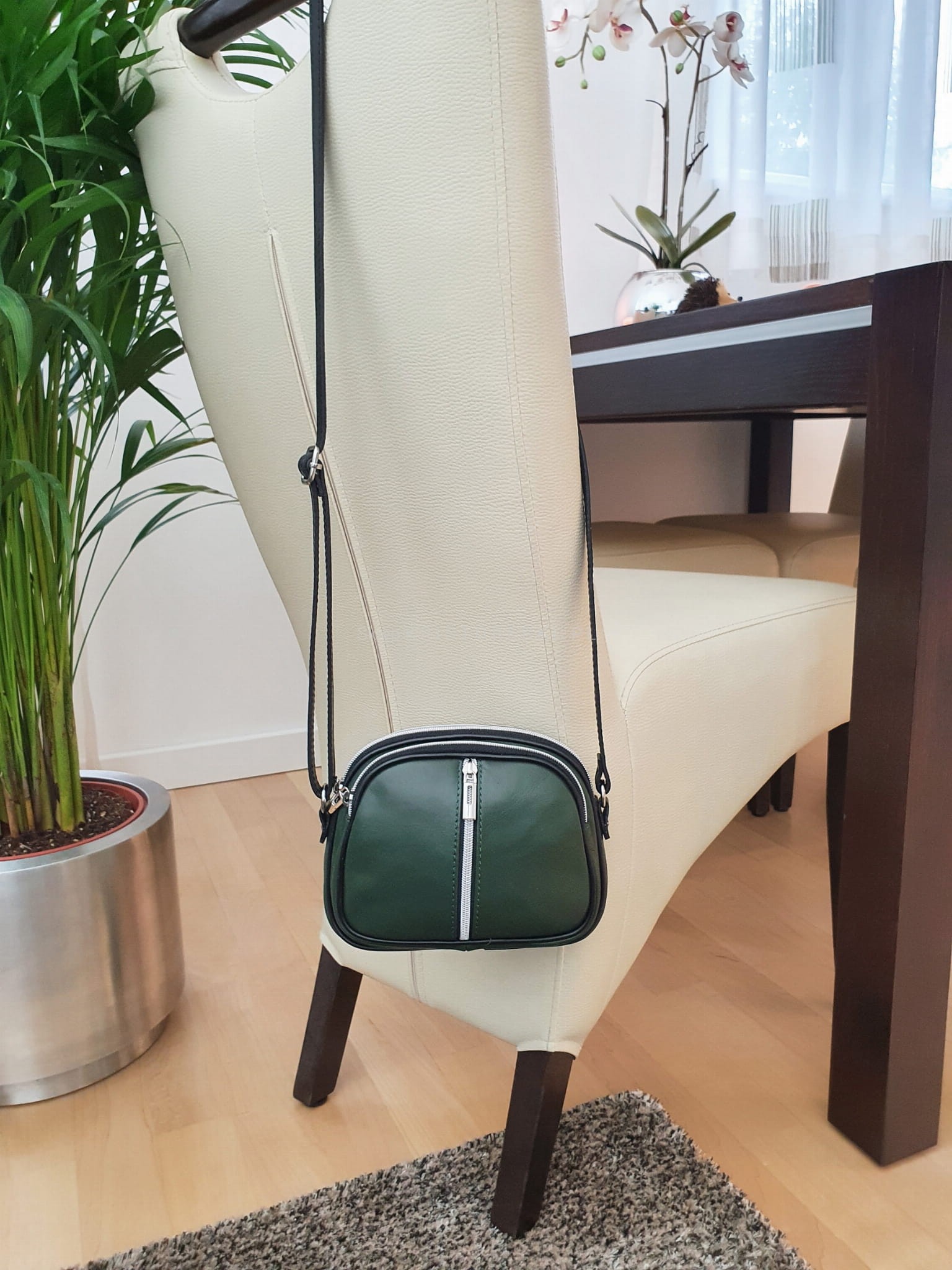 Włoska skórzana torebka, listonoszka damska znanej marki VERA PELLE ITALY w kolorze CIEMNEJ BUTELKOWEJ ZIELENI. Wykonana została z mięciutkiej w dotyku i pachnącej, najwyższej jakości skóry naturalnej. Wykonanie torebki jest bardzo staranne z dbałością o wszystkie szczegóły a szwy proste i precyzyjne. Torebka mimo swoich rozmiarów jest bardzo praktyczna i pojemna. Posiada aż trzy niezależne, zamykane na suwak komory a środek wykończony jest solidną podszewką. Z przodu znajdziesz dodatkową funkcjonalną kieszonkę zamykaną na suwak. Torebka posiada długi i regulowany pasek o długości 130 cm, dzięki czemu bez trudu dopasujesz ją do swojego wzrostu i preferencji. Dzięki klasycznemu wyglądowi będzie pasowała do niemal każdej codziennej jak i wizytowej stylizacji. Sprawdzi się również jako wyszukany prezent dla najbliższej Ci osoby.