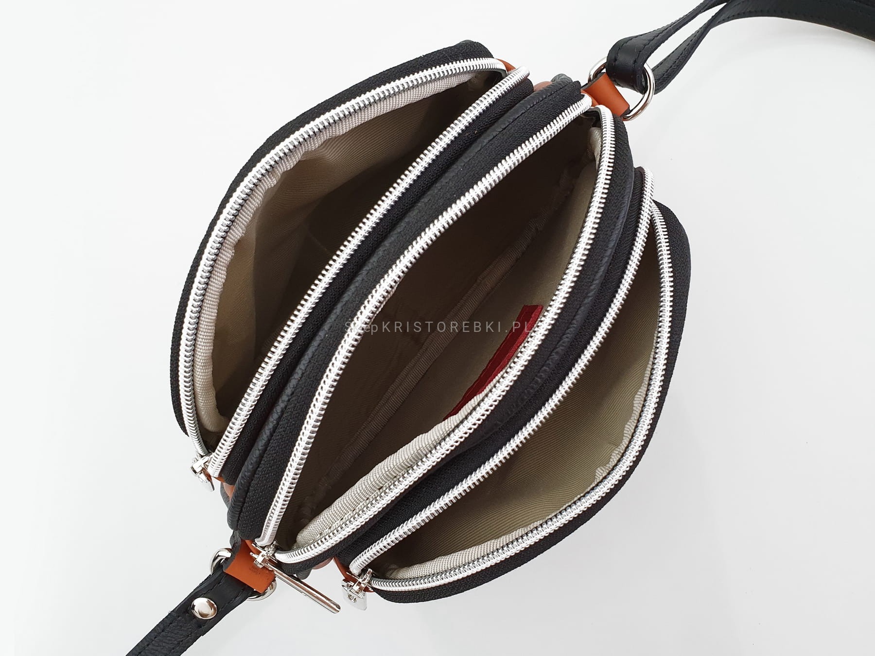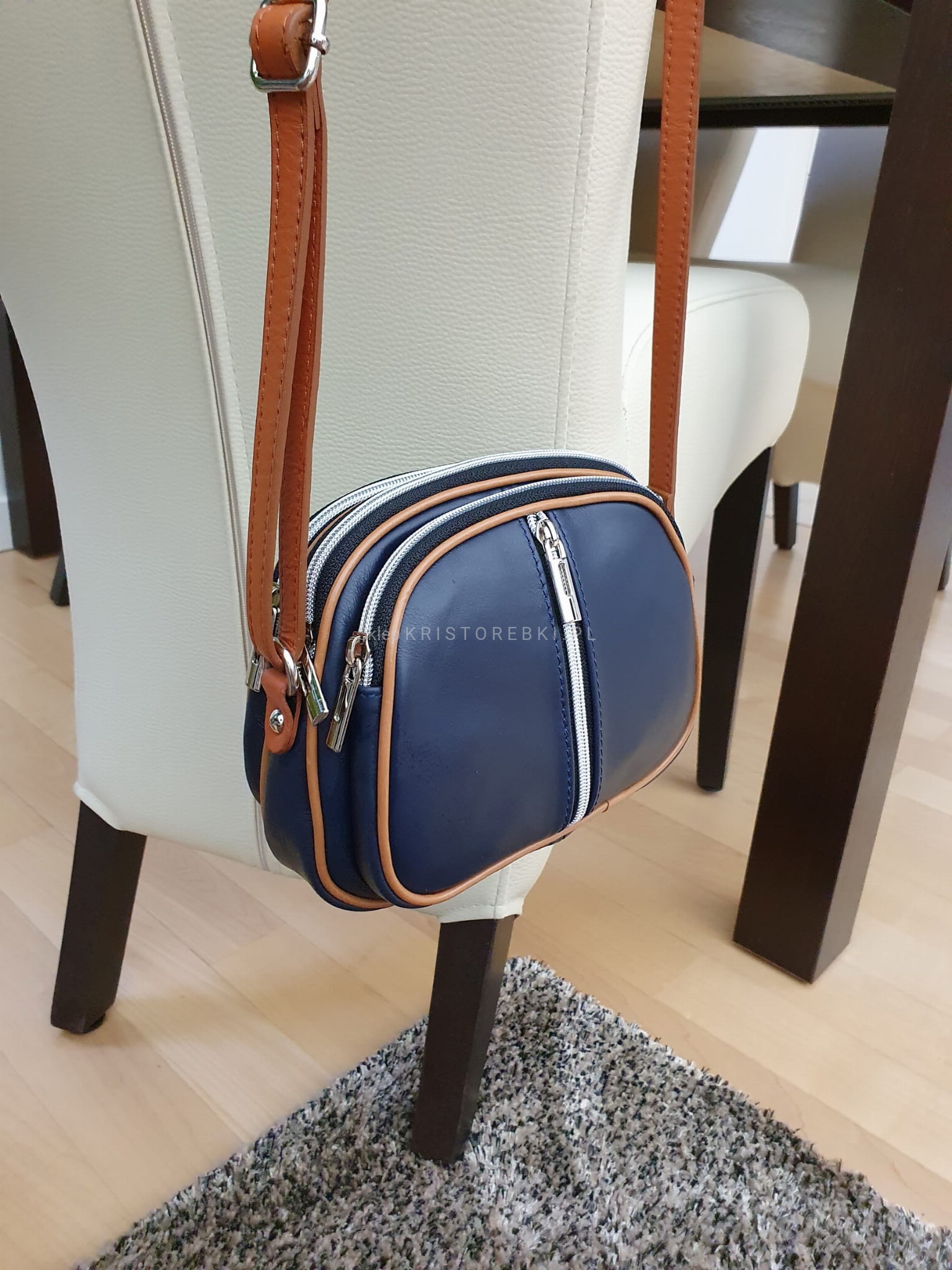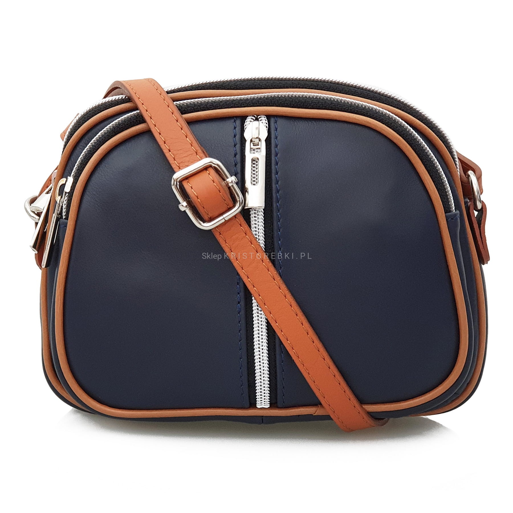 VERA PELLE torebka damska skórzana listonoszka 3 komorowa z paskiem na ramię V463 granatowa + camel