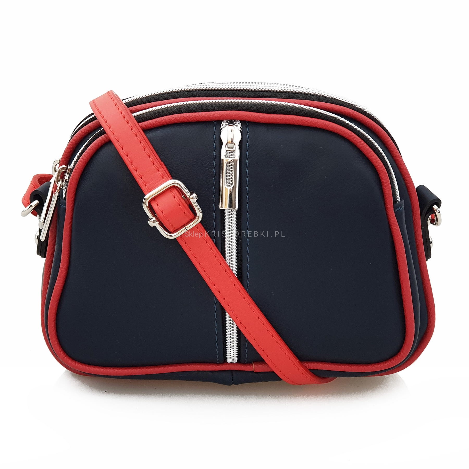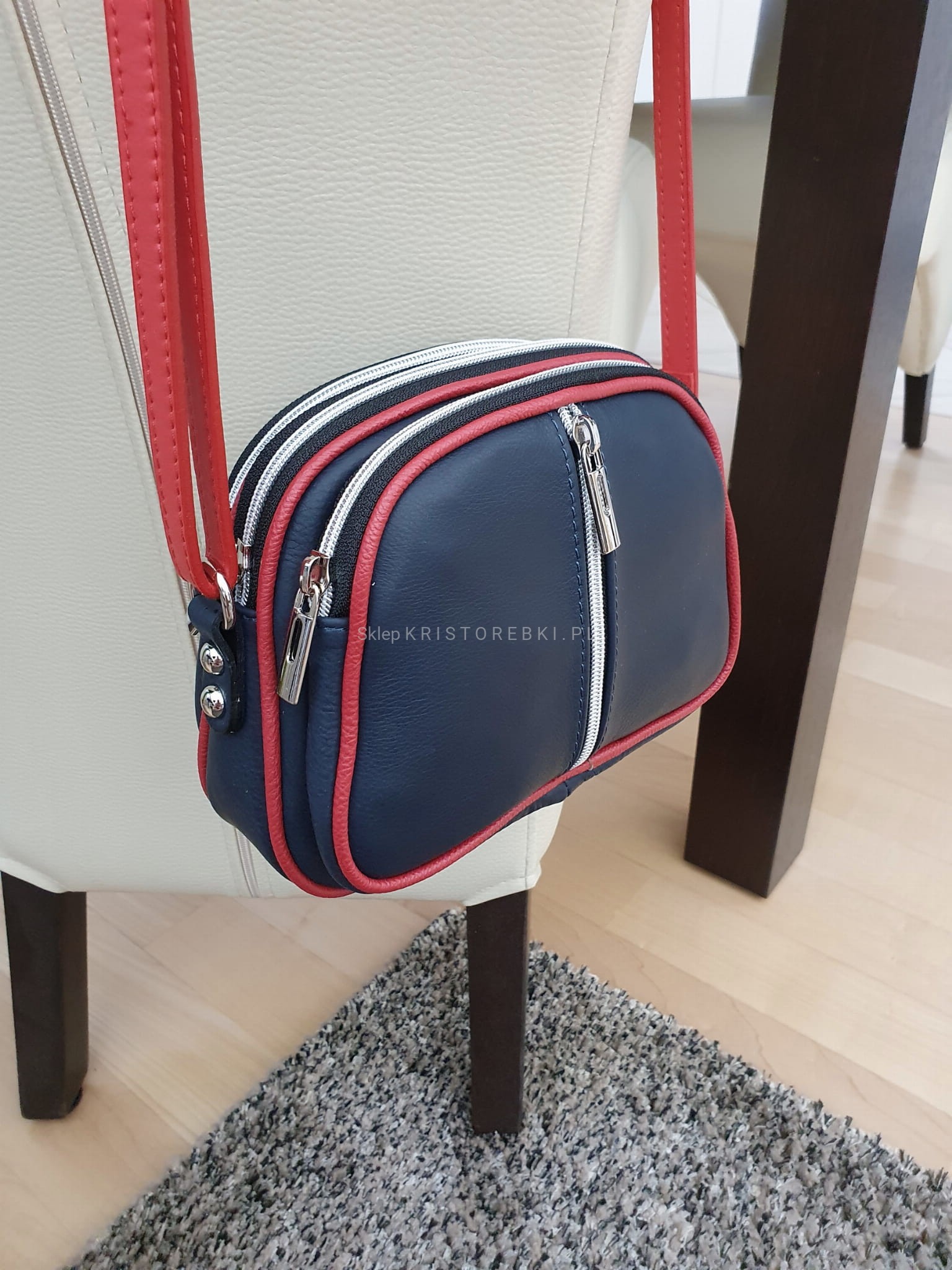 VERA PELLE torebka damska skórzana listonoszka 3 komorowa z paskiem na ramię V463 granatowa + czerwona