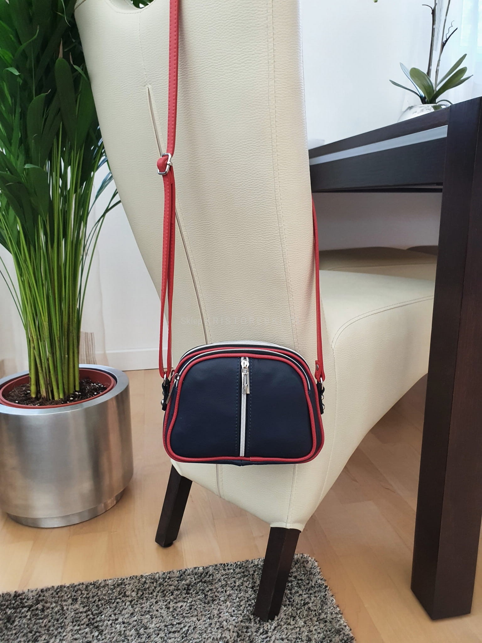 Włoska skórzana torebka, listonoszka damska znanej marki VERA PELLE ITALY w kolorze GRANATOWYM + CZERWONYM. Wykonana została z mięciutkiej w dotyku i pachnącej, najwyższej jakości skóry naturalnej. Wykonanie torebki jest bardzo staranne z dbałością o wszystkie szczegóły a szwy proste i precyzyjne. Torebka mimo swoich rozmiarów jest bardzo praktyczna i pojemna. Posiada aż trzy niezależne, zamykane na suwak komory a środek wykończony jest solidną podszewką. Z przodu znajdziesz dodatkową funkcjonalną kieszonkę zamykaną na suwak. Torebka posiada długi i regulowany pasek o długości 130 cm, dzięki czemu bez trudu dopasujesz ją do swojego wzrostu i preferencji. Dzięki klasycznemu wyglądowi będzie pasowała do niemal każdej codziennej jak i wizytowej stylizacji. Sprawdzi się również jako wyszukany prezent dla najbliższej Ci osoby.