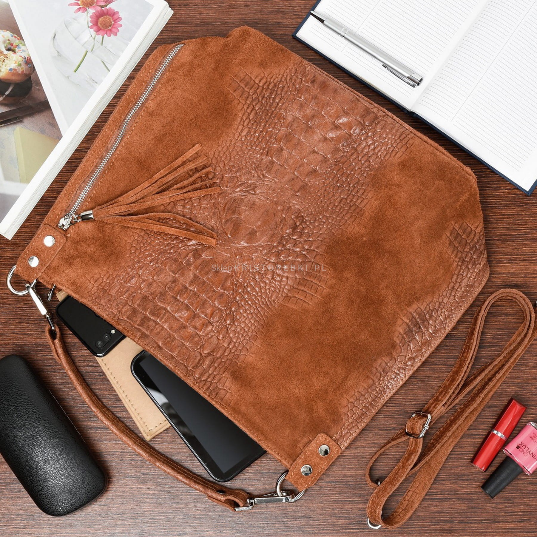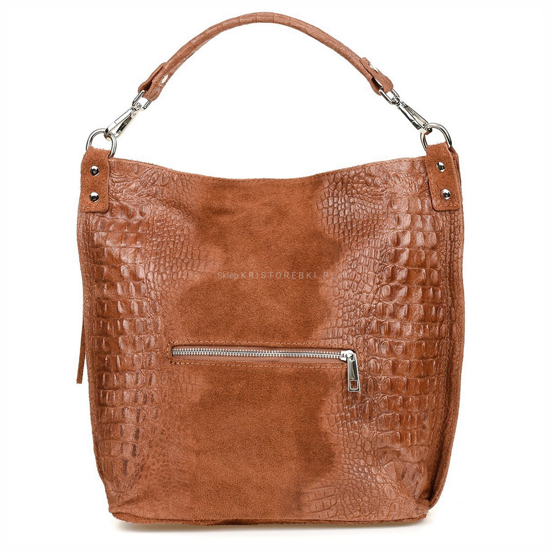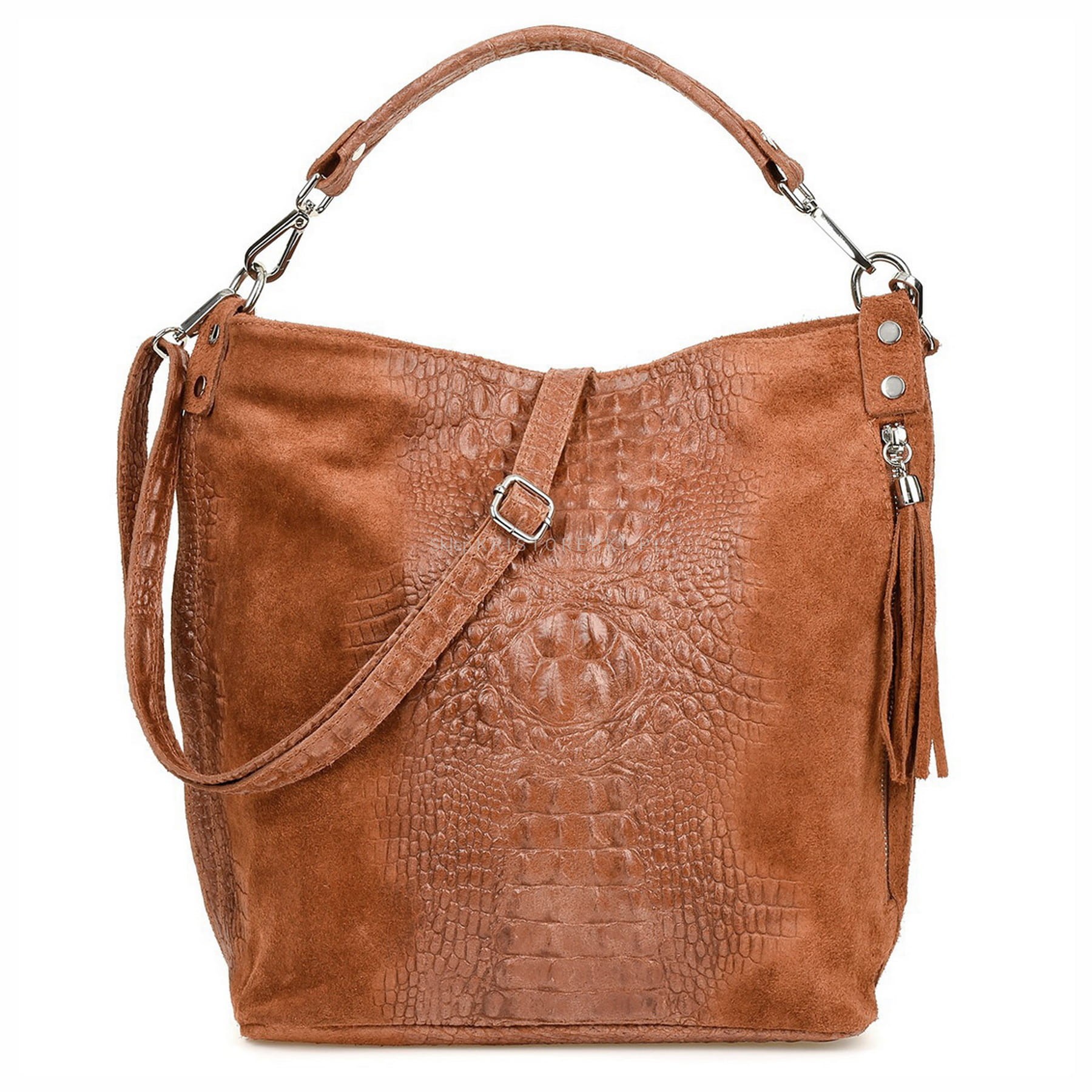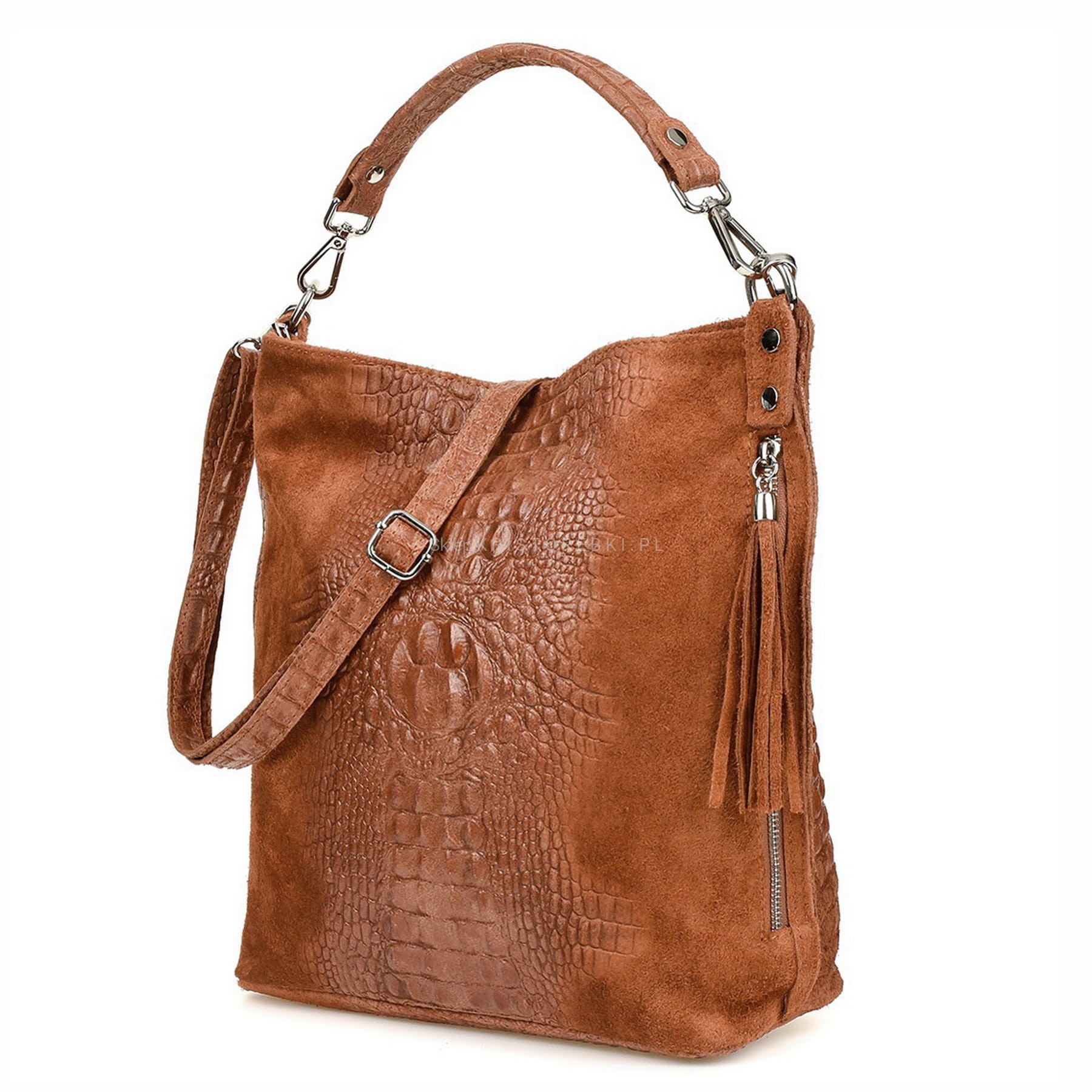 Włoska skórzana torebka damska typu shopper znanej i cenionej marki VERA PELLE ITALY w kolorze BRĄZOWYM. Wykonana została bardzo starannie z wysokiej jakości zamszowej skóry naturalnej. Wygląda niezwykle oryginalnie dzięki ciekawemu połączeniu zamszu z fakturą imitującą skórę krokodyla. Torebka posiada wygodną rączkę do noszenia w ręku a dodatkowy długi, odpinany i regulowany pasek pozwala ją nosić również wygodnie na ramieniu. Torebka posiada okucia w kolorze srebrnym. Jest duża i pojemna, dzięki czemu bez trudu pomieści format A4. Po prawej stronie torebki znajduje się duża i funkcjonalna kieszeń zamykana na suwak z ozdobnym frędzelkiem. Środek zamykany jest na suwak oraz wykończony wysokiej jakości podszewką. Torebka posiada jedną, zamykaną na suwak komorę, wewnątrz której znajduje się mała, boczna, zasuwana kieszonka. Z tyłu torebki znajdziesz kolejną praktyczną, zamykaną na suwak dużą kieszeń. Torebka jest bardzo wygodna w codziennym użytkowaniu a jej wygląda sprawia, że będzie pasowała do większości codziennych stylizacji. Jest lekka, a jej kształt i materiał sprawiają, że jest bardzo wygodna w użytkowaniu.